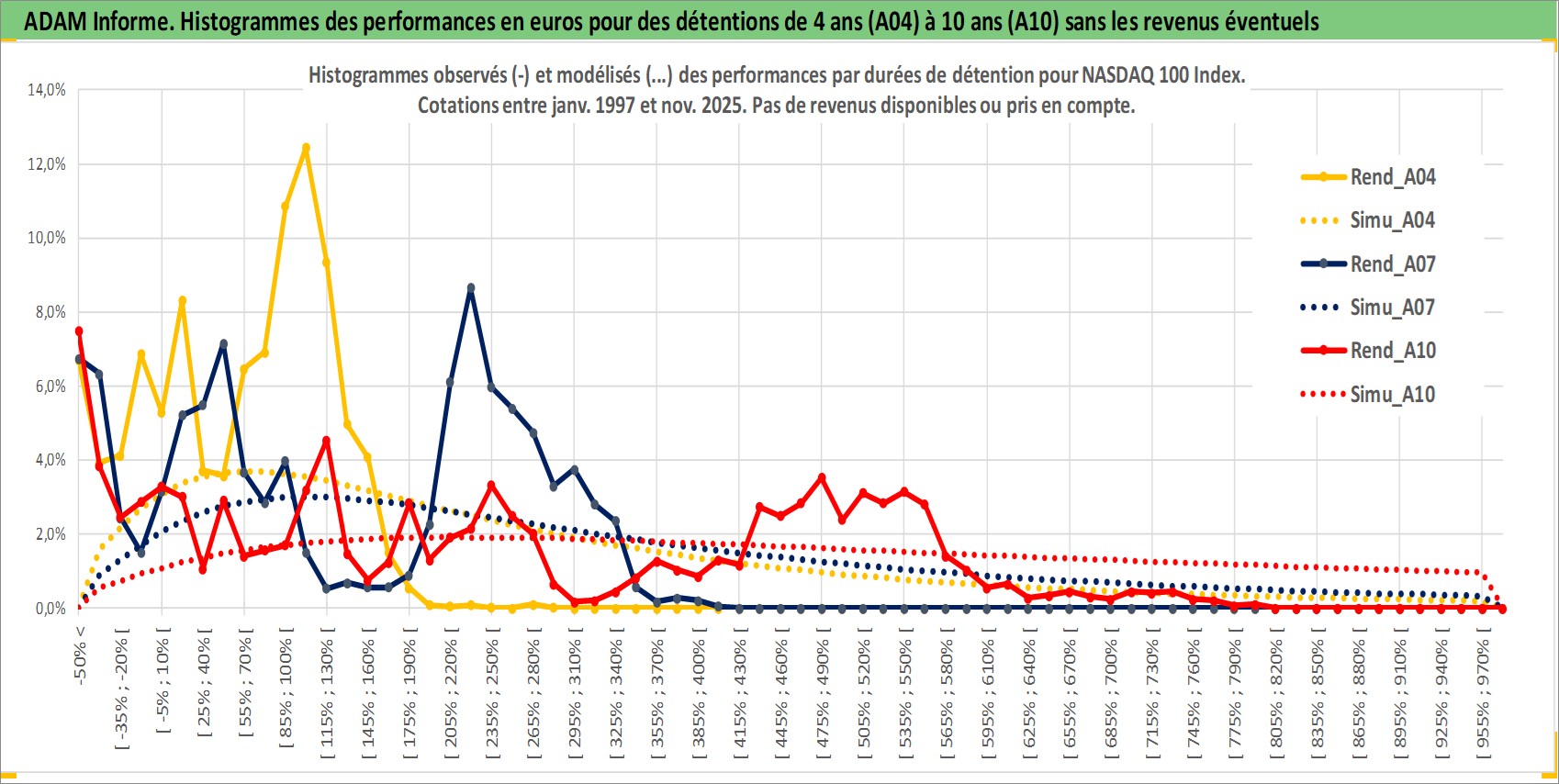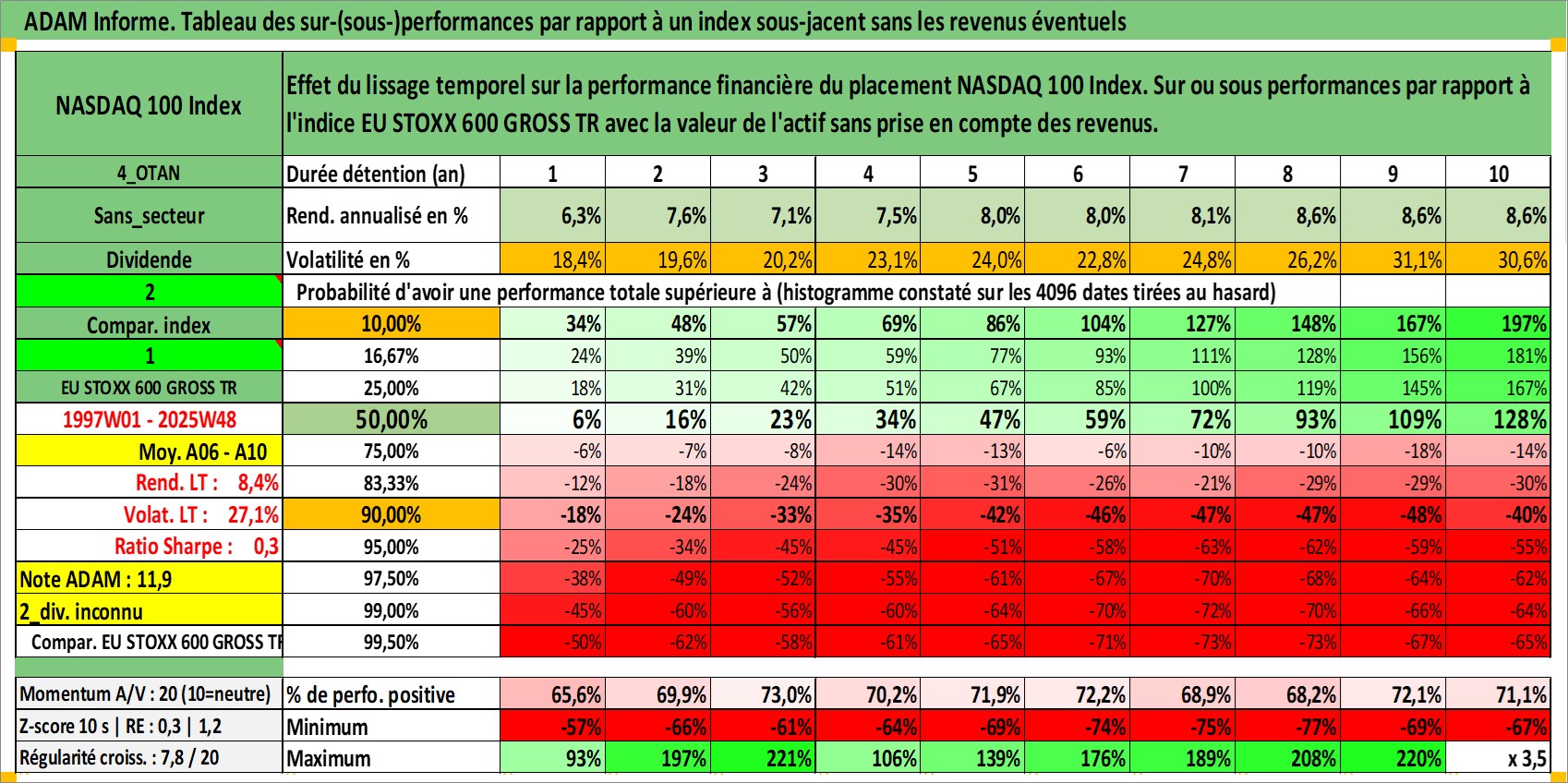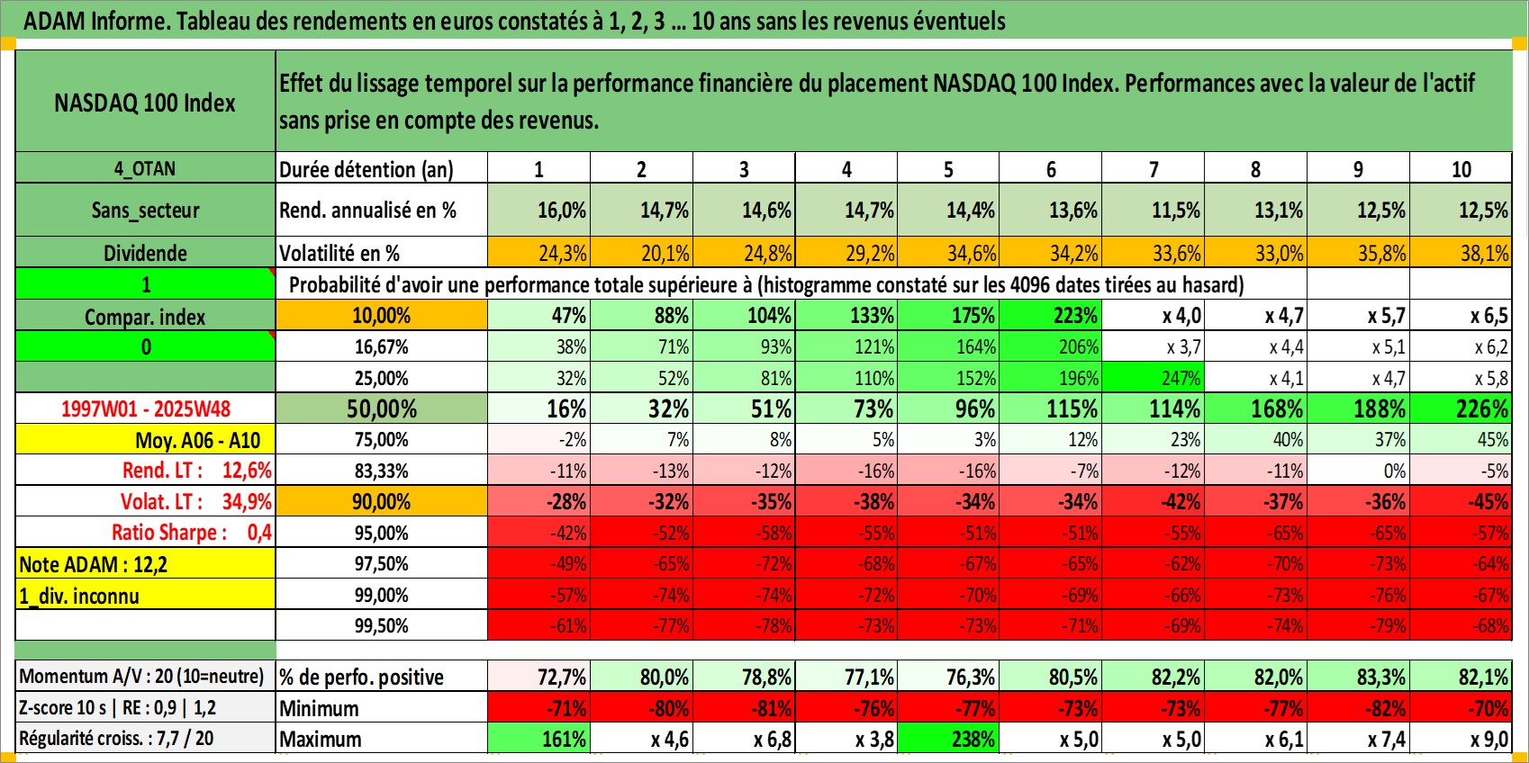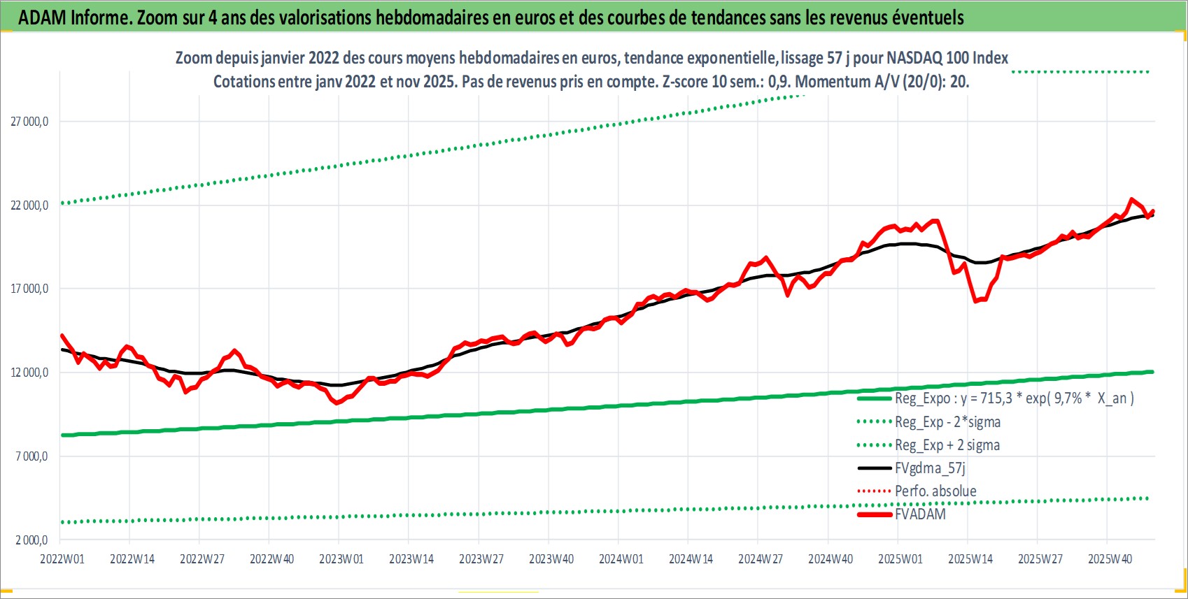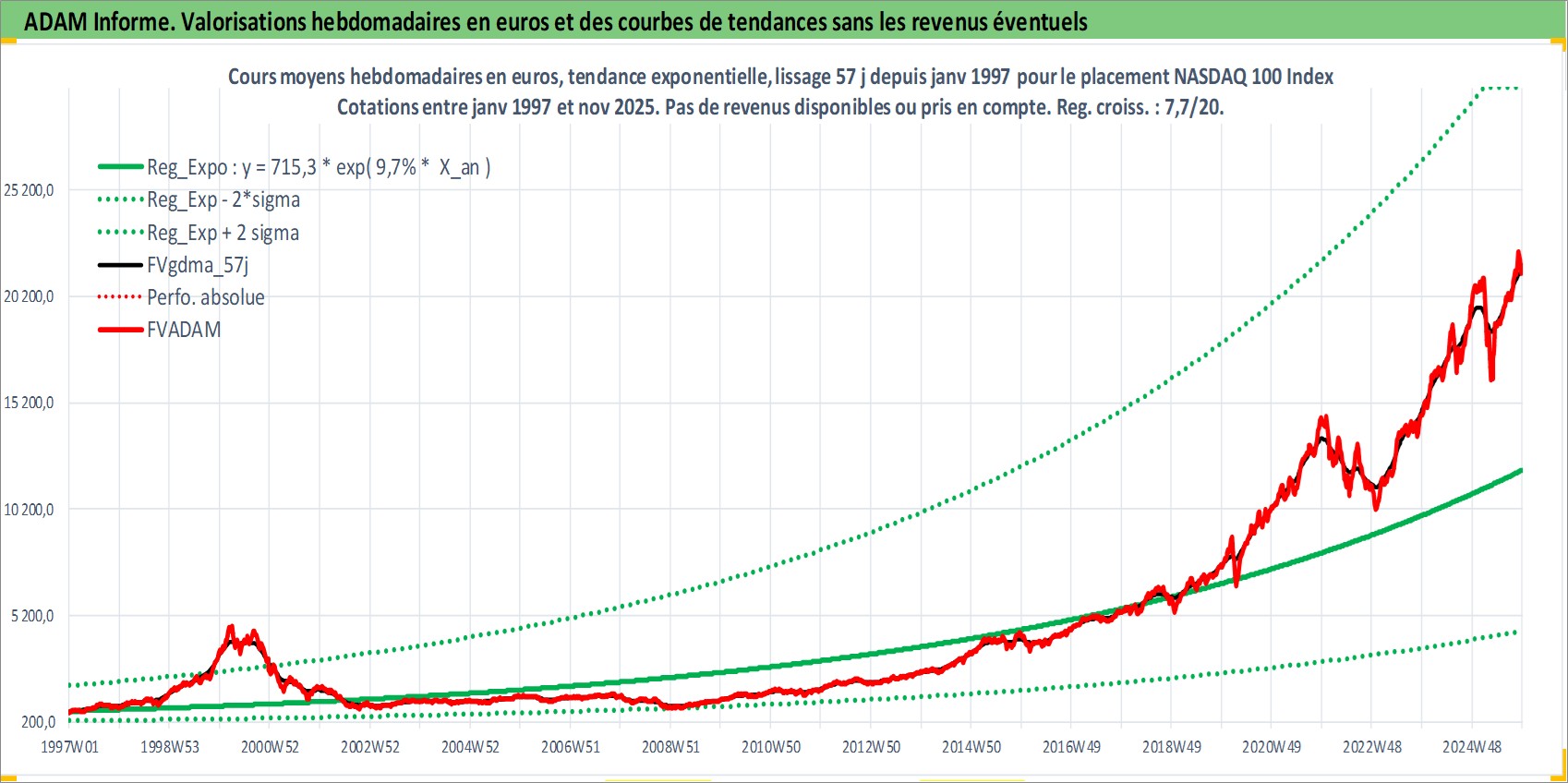 Site dédié aux investisseursPage dédiée sur site financeAnalyse des valorisations hebdomadaires de l'actif NASDAQ 100 Index. Cet actif est cote en USD. Les valorisations sont en contrevaleur EURO et couvrent les semaines 1997W01 a 2025W48. Les revenus de cet actif financier ne sont pas connus car non existants ou non disponibles sur le site Yahoo Finance. La note ESG de cet actif n'est pas connue.