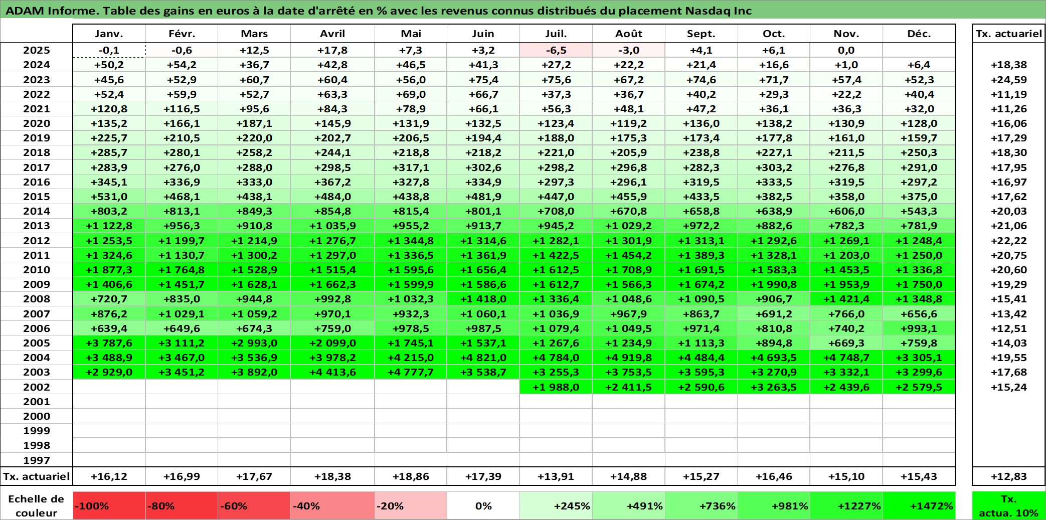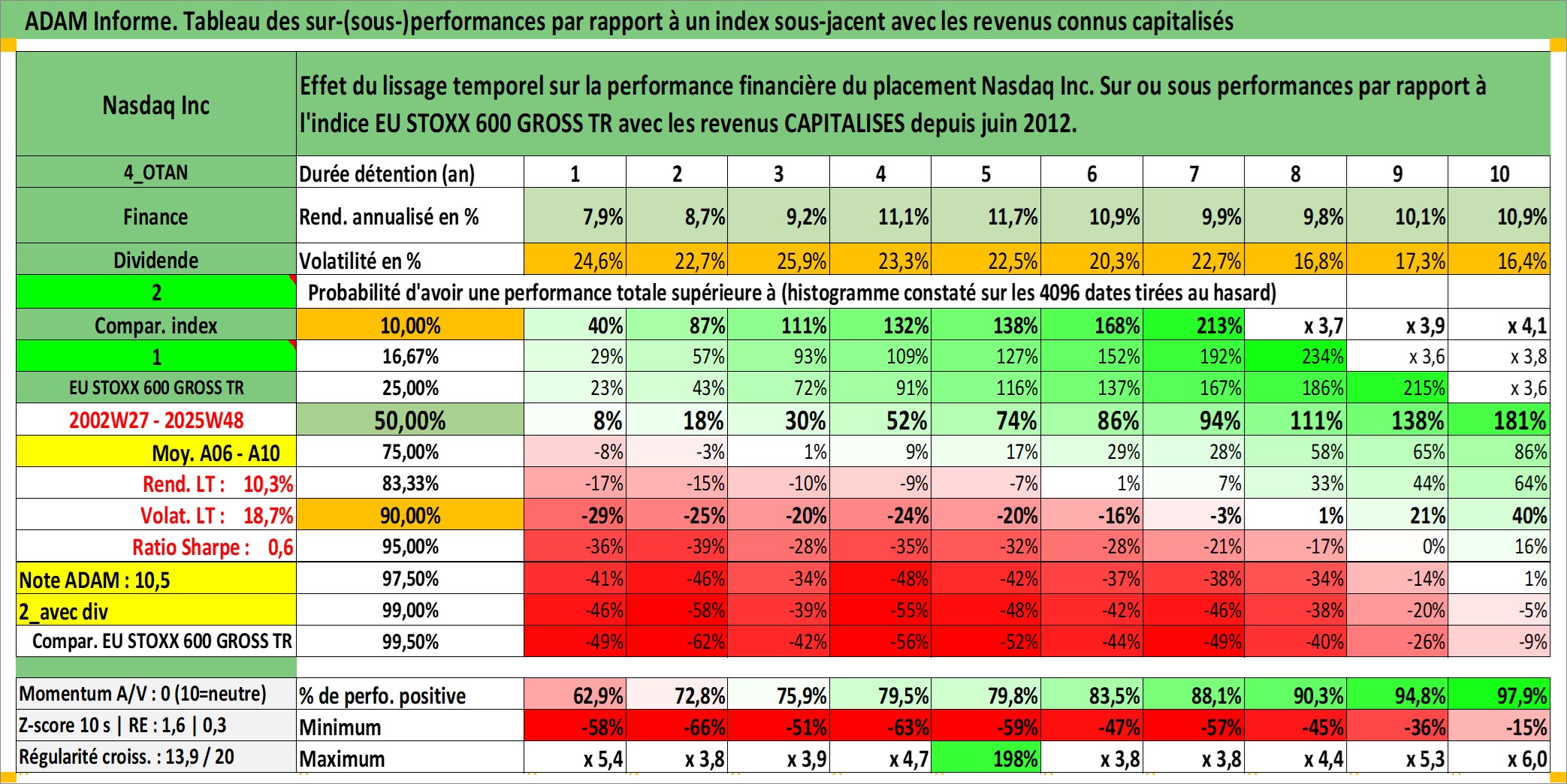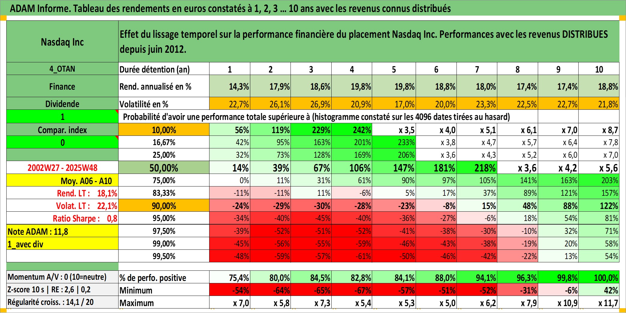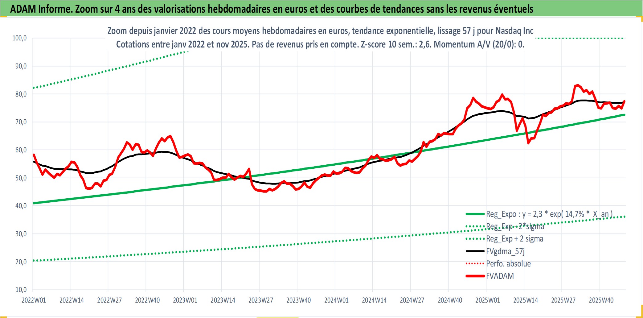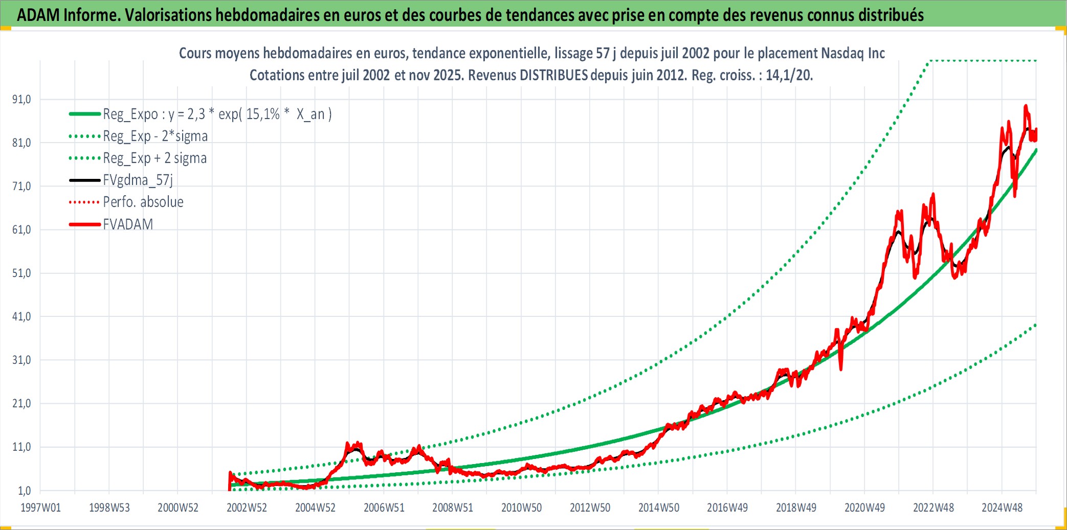 Site dédié aux investisseursPage dédiée sur site financeAnalyse des valorisations hebdomadaires de l'action Nasdaq Inc. Cet actif est cote en USD. Les valorisations sont en contrevaleur EURO et couvrent les semaines 2002W27 a 2025W48. Les revenus de cet actif financier sont pris en compte depuis la semaine 2012W24. La note globale ESG de cet actif est estimee a 15.0 (apres rebasage entre 0 et 20).