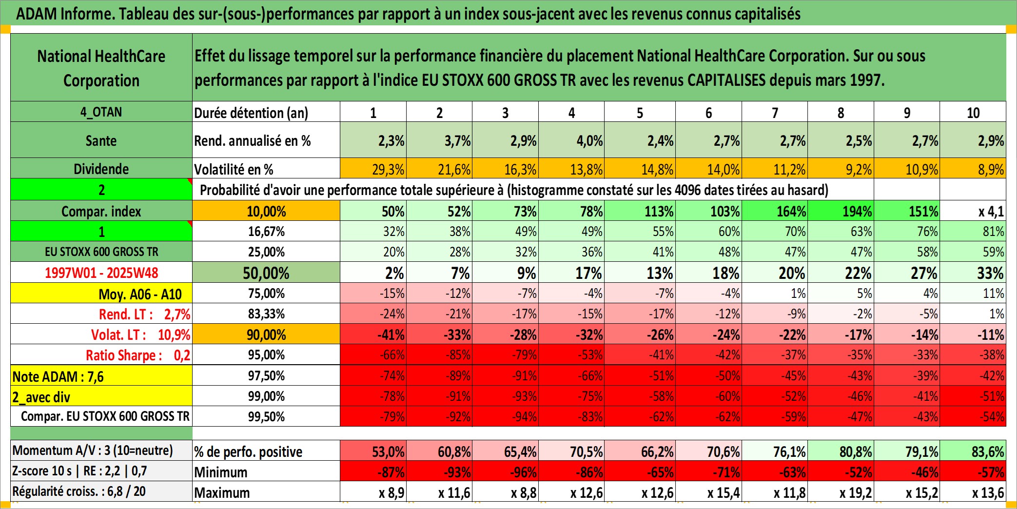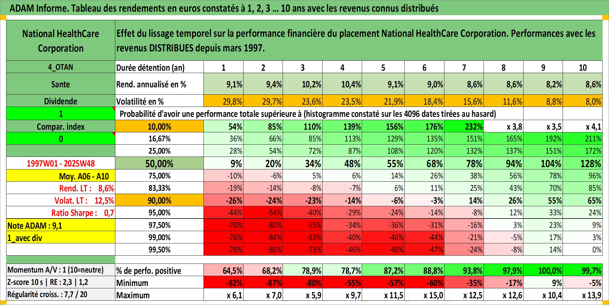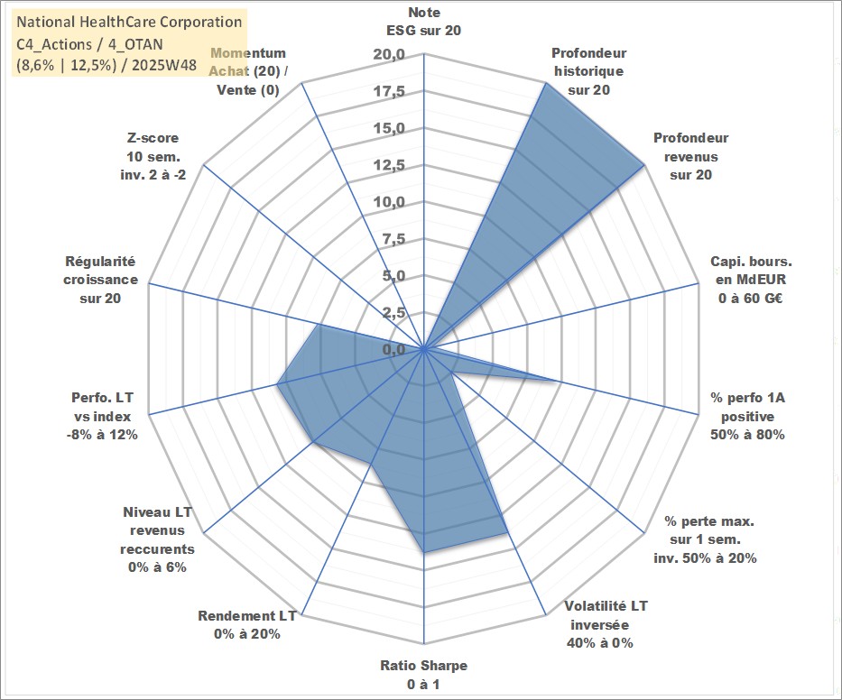 Site dédié aux investisseursPage dédiée sur site financeAnalyse des valorisations hebdomadaires de l'action National HealthCare Corporation. Cet actif est cote en USD. Les valorisations sont en contrevaleur EURO et couvrent les semaines 1997W01 a 2025W48. Les revenus de cet actif financier sont pris en compte depuis la semaine 1997W13. La note ESG de cet actif n'est pas connue.