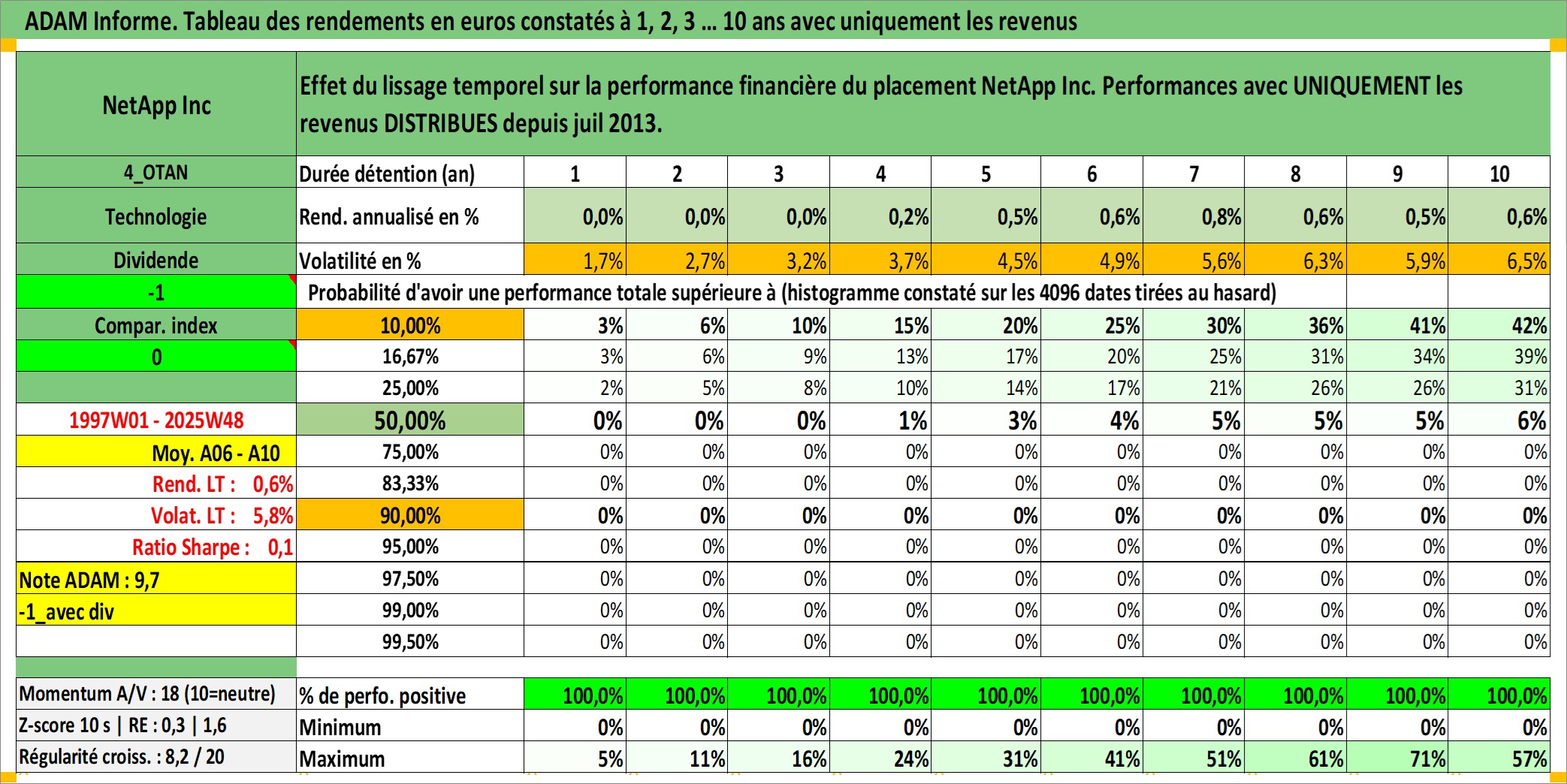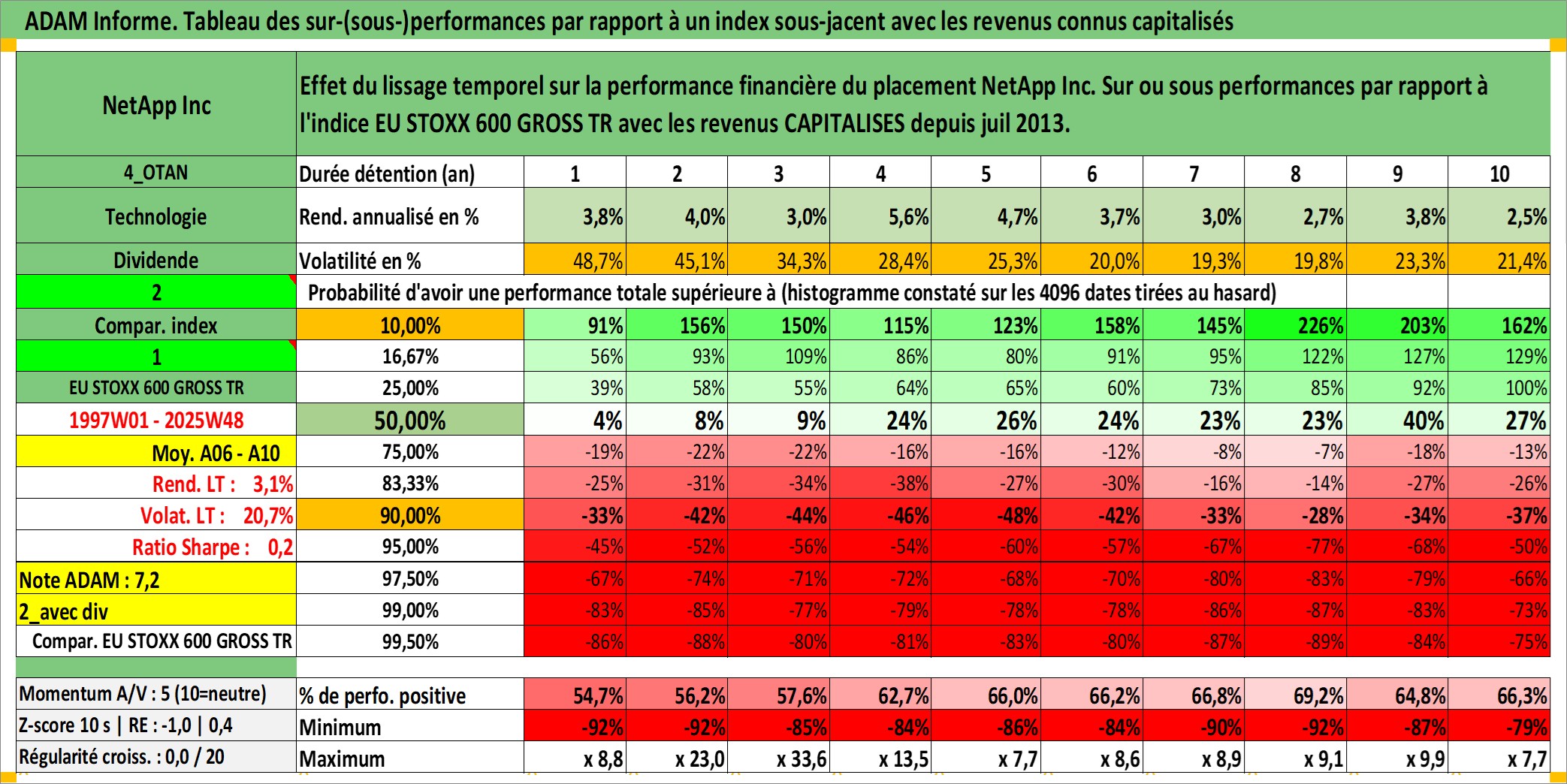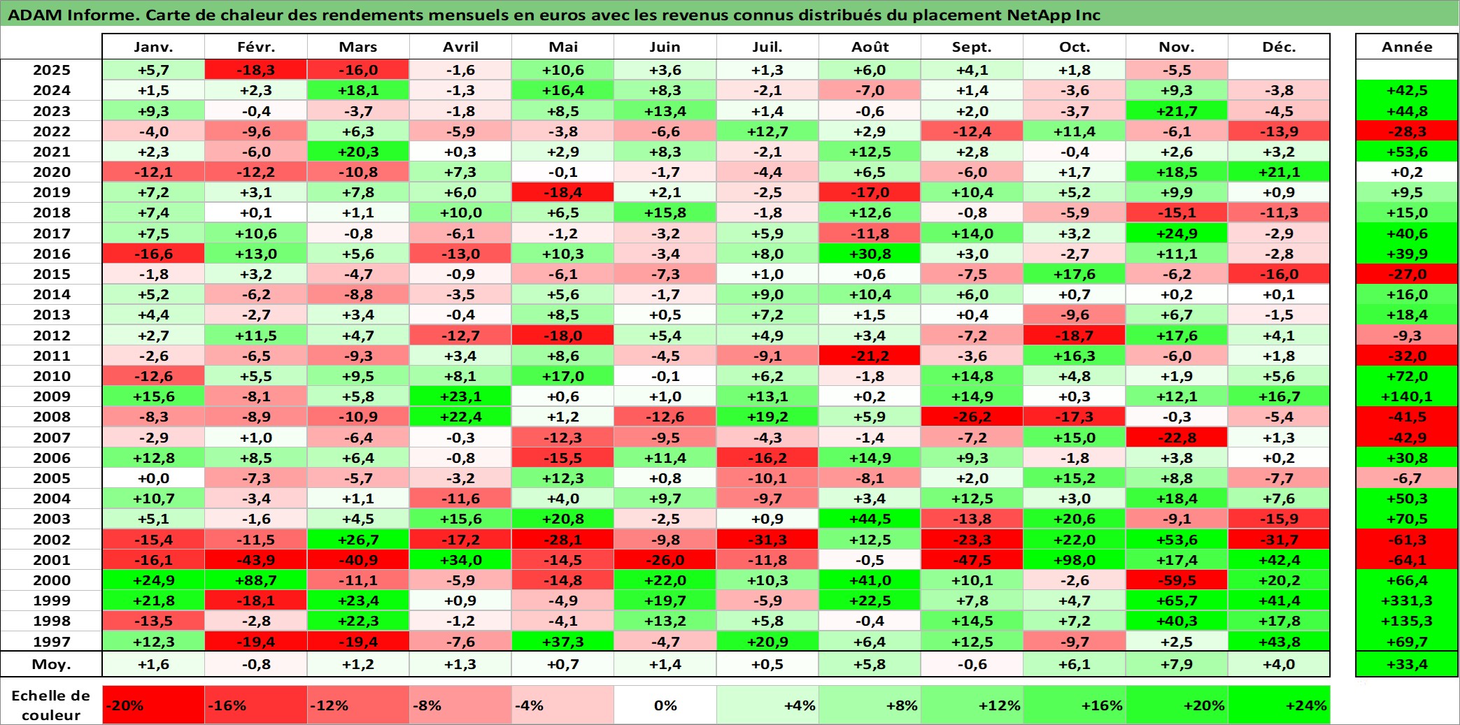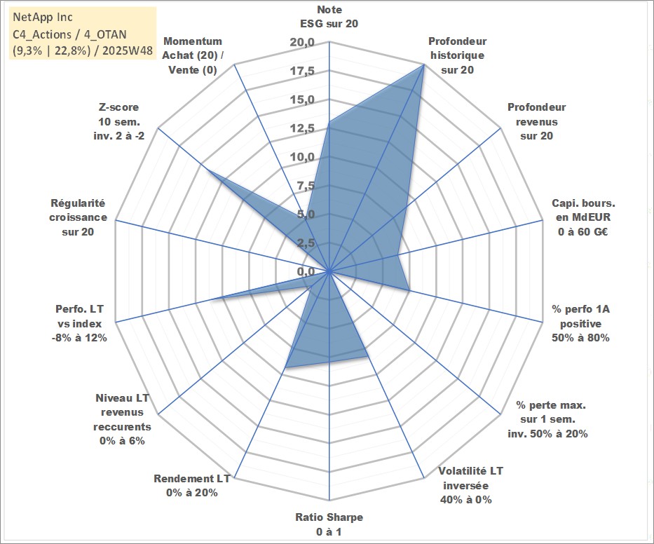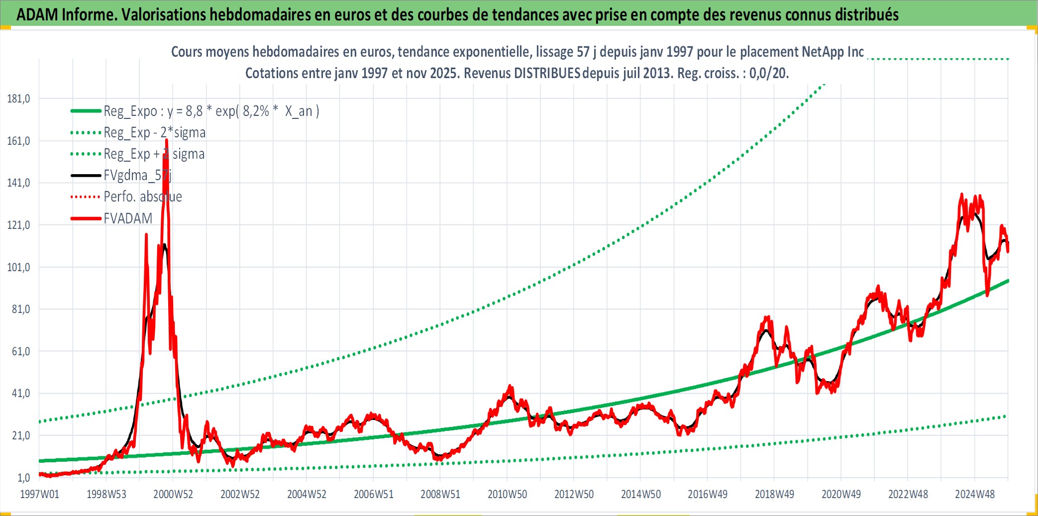 Site dédié aux investisseursPage dédiée sur site financeAnalyse des valorisations hebdomadaires de l'action NetApp Inc. Cet actif est cote en USD. Les valorisations sont en contrevaleur EURO et couvrent les semaines 1997W01 a 2025W48. Les revenus de cet actif financier sont pris en compte depuis la semaine 2013W28. La note globale ESG de cet actif est estimee a 13.0 (apres rebasage entre 0 et 20).
