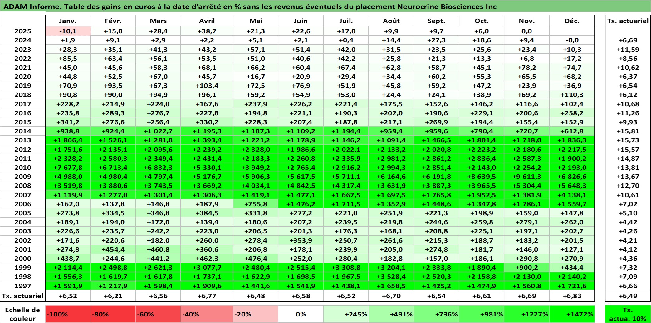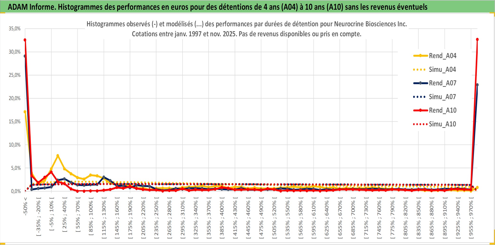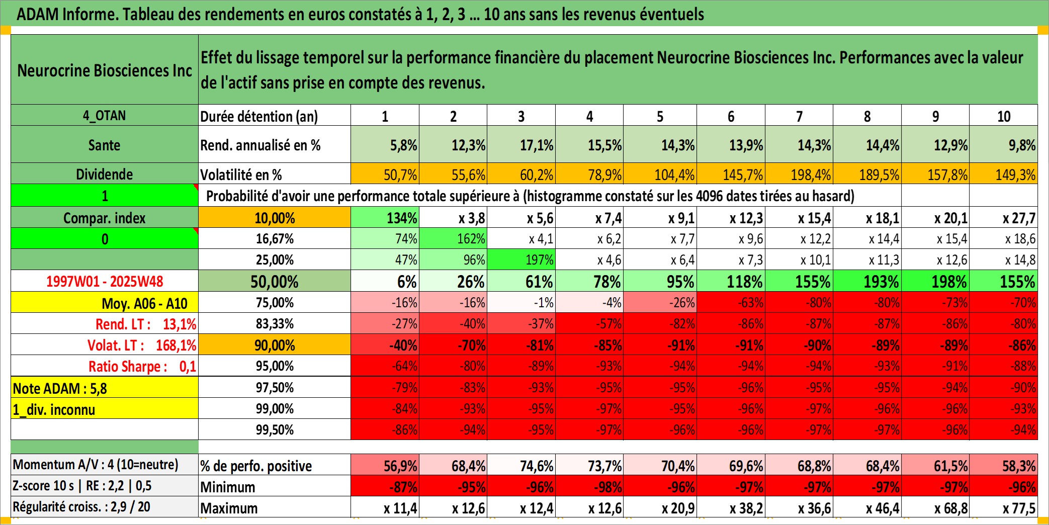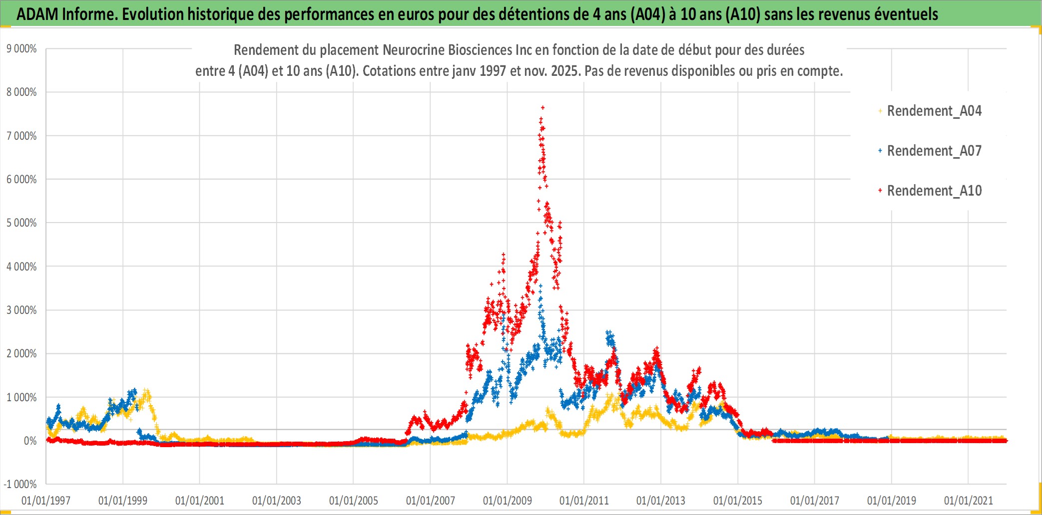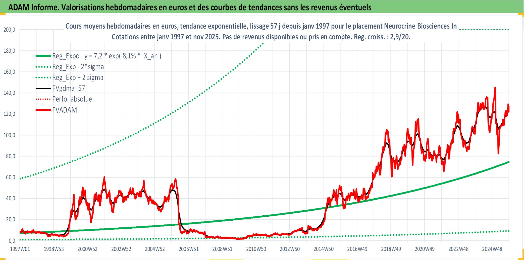 Site dédié aux investisseursPage dédiée sur site financeAnalyse des valorisations hebdomadaires de l'action Neurocrine Biosciences Inc. Cet actif est cote en USD. Les valorisations sont en contrevaleur EURO et couvrent les semaines 1997W01 a 2025W48. Les revenus de cet actif financier ne sont pas connus car non existants ou non disponibles sur le site Yahoo Finance. La note ESG de cet actif n'est pas connue.