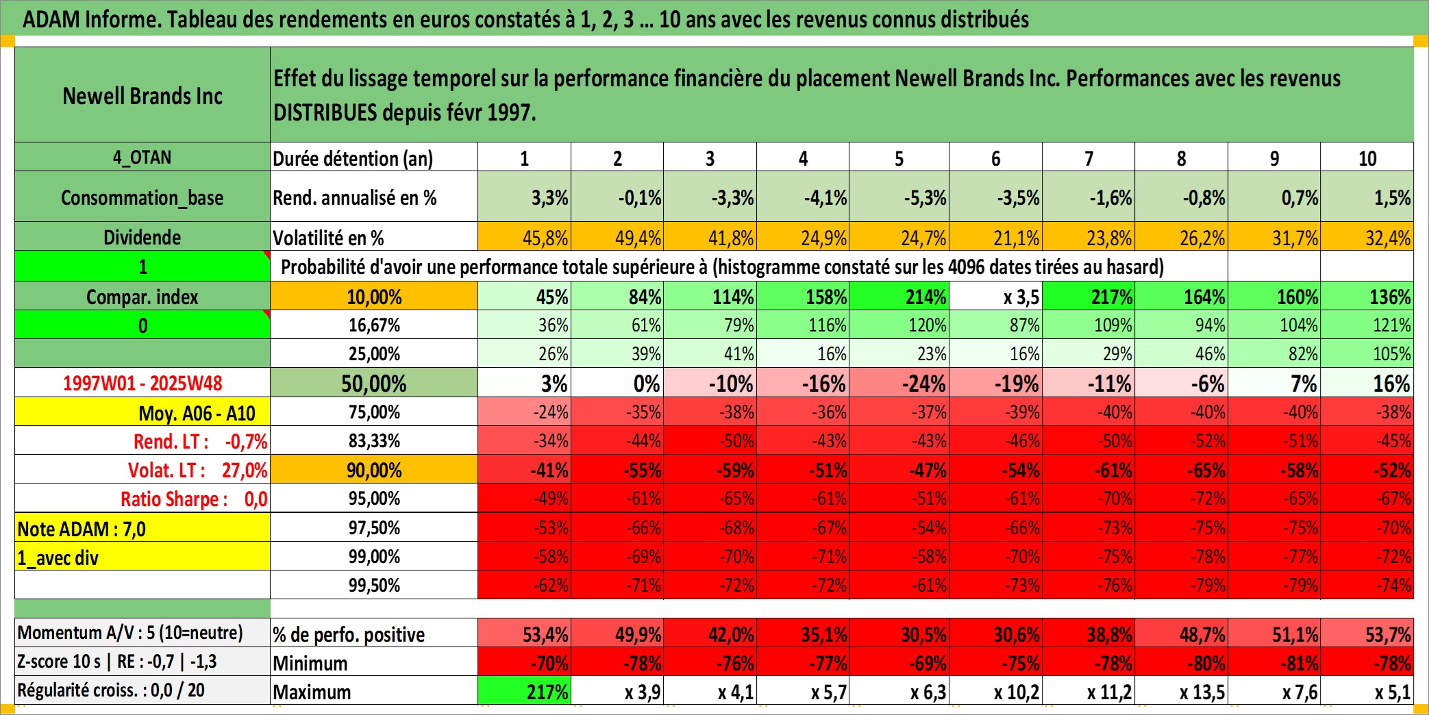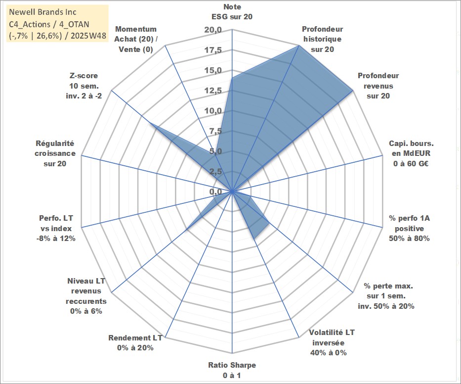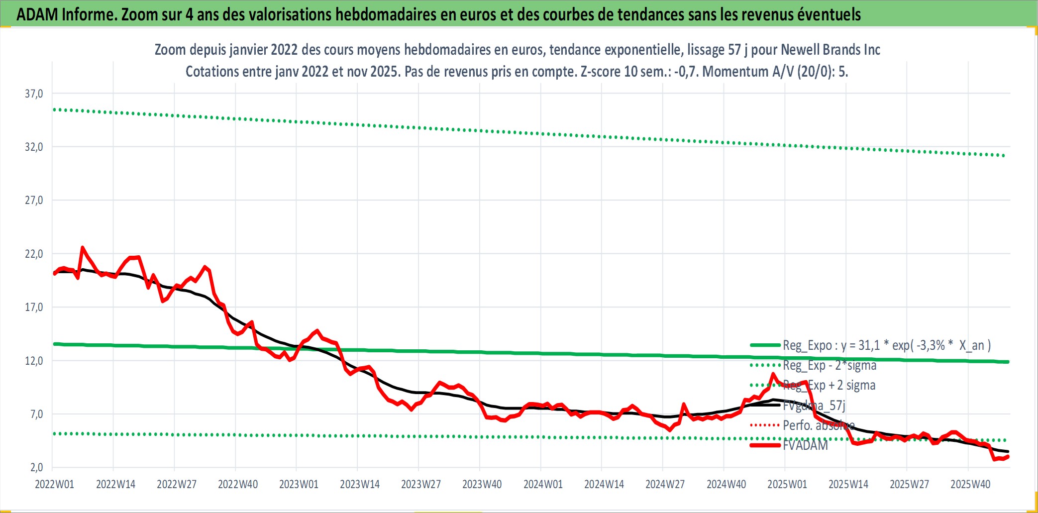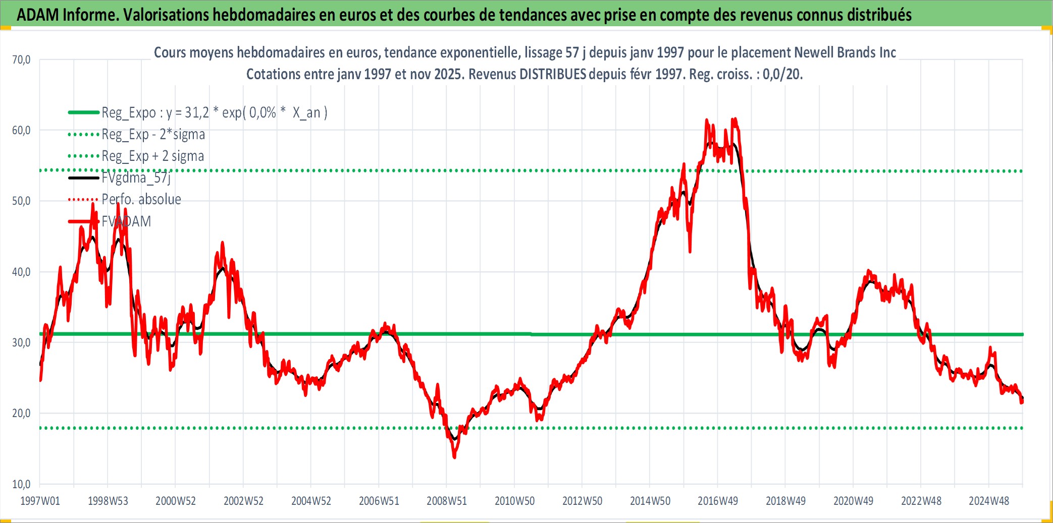 Site dédié aux investisseursPage dédiée sur site financeAnalyse des valorisations hebdomadaires de l'action Newell Brands Inc. Cet actif est cote en USD. Les valorisations sont en contrevaleur EURO et couvrent les semaines 1997W01 a 2025W48. Les revenus de cet actif financier sont pris en compte depuis la semaine 1997W08. La note globale ESG de cet actif est estimee a 14.0 (apres rebasage entre 0 et 20).