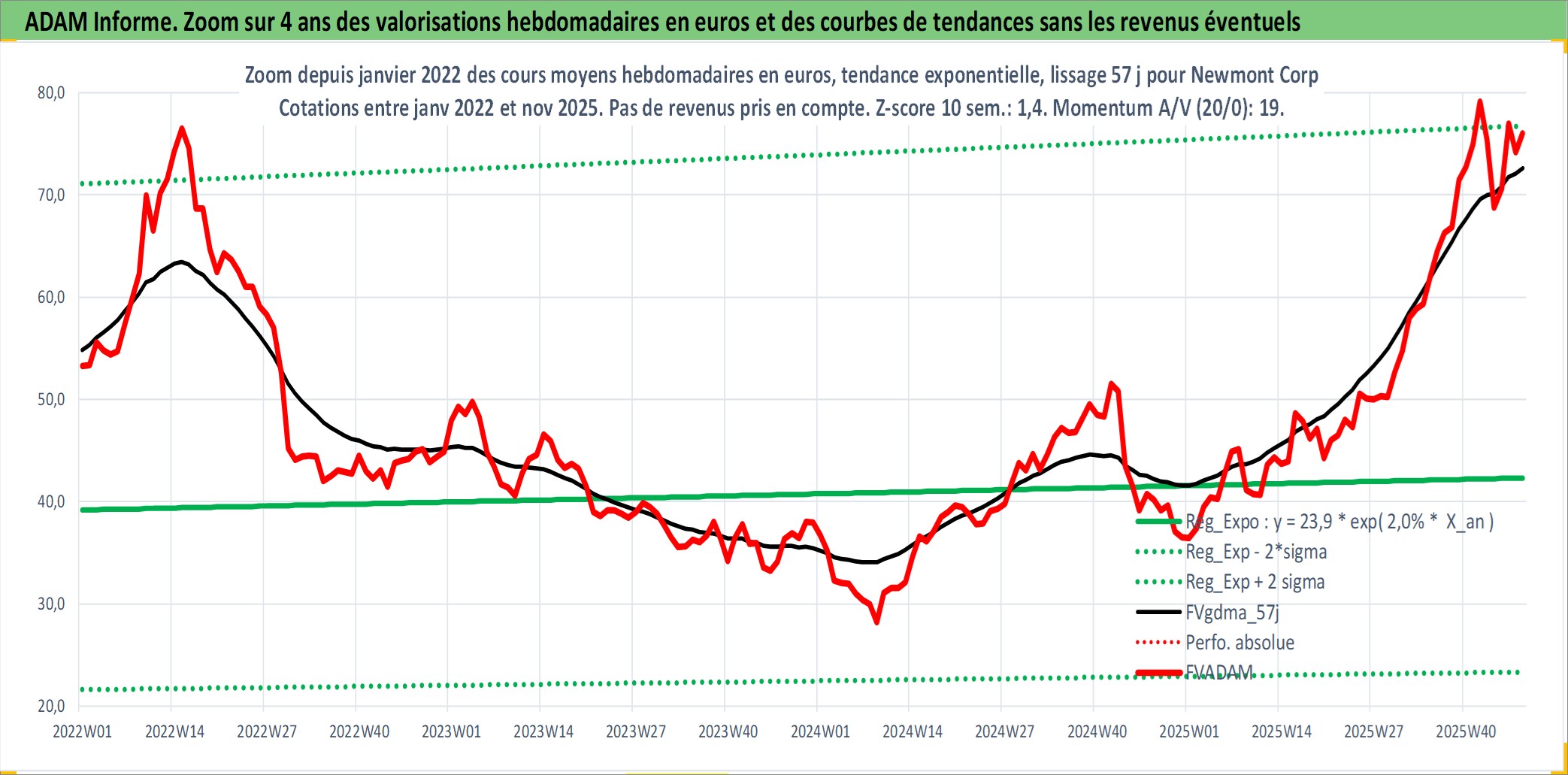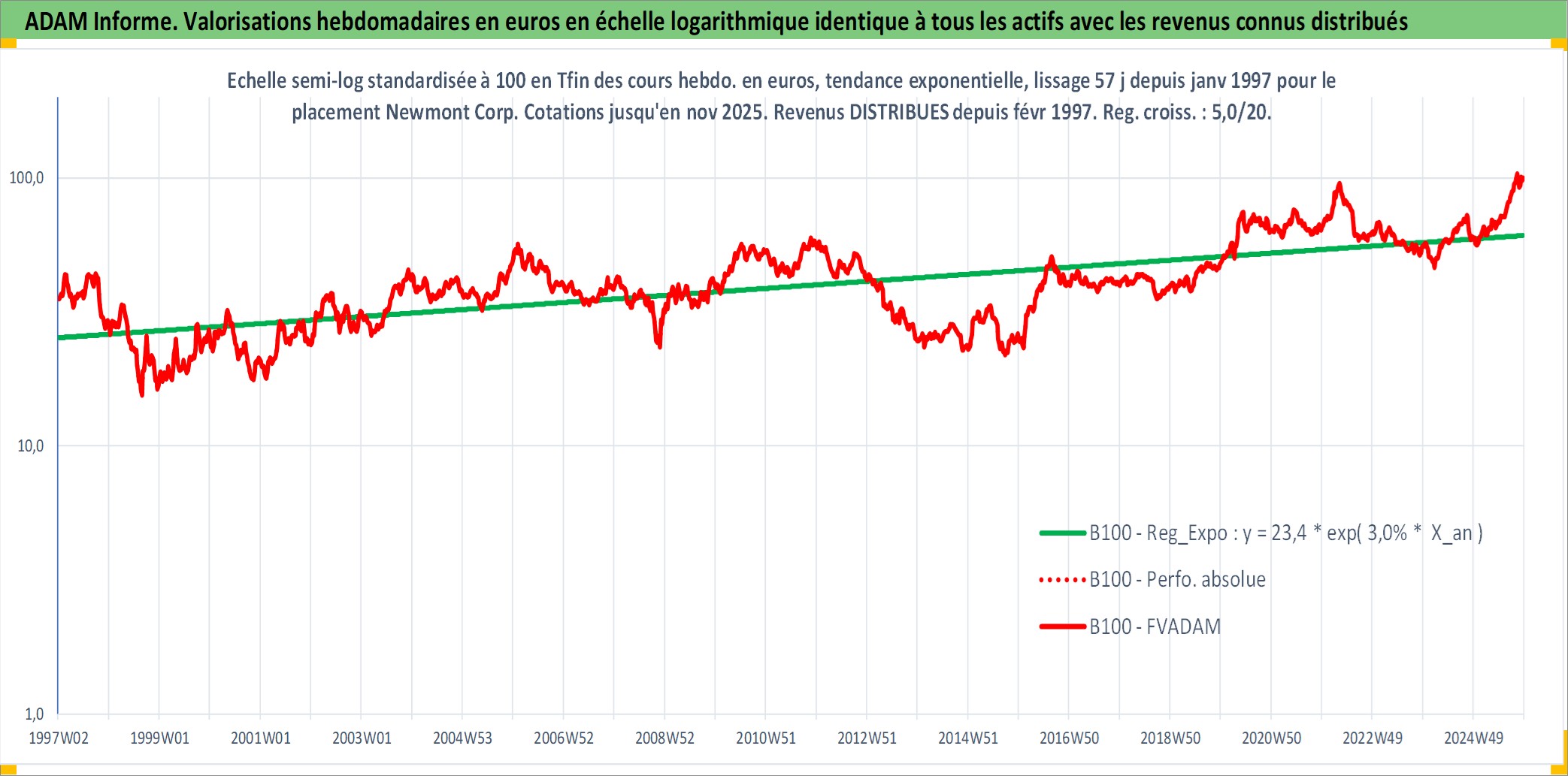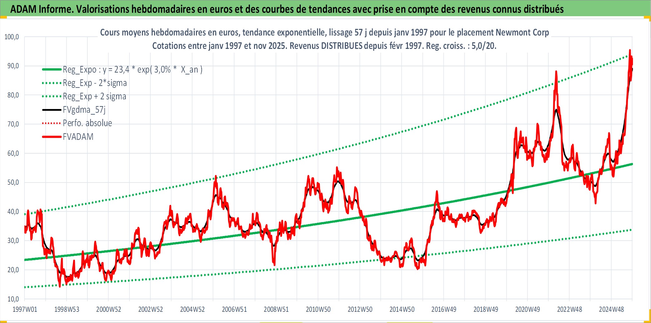 Site dédié aux investisseursPage dédiée sur site financeAnalyse des valorisations hebdomadaires de l'action Newmont Corp. Cet actif est cote en USD. Les valorisations sont en contrevaleur EURO et couvrent les semaines 1997W01 a 2025W48. Les revenus de cet actif financier sont pris en compte depuis la semaine 1997W07. La note globale ESG de cet actif est estimee a 10.0 (apres rebasage entre 0 et 20).