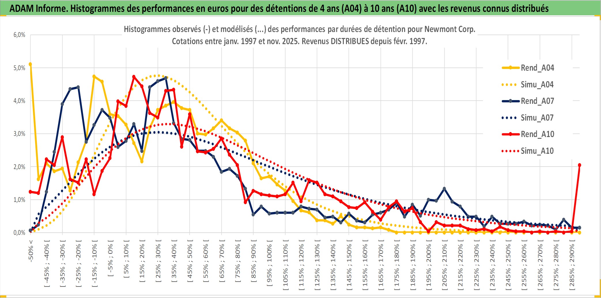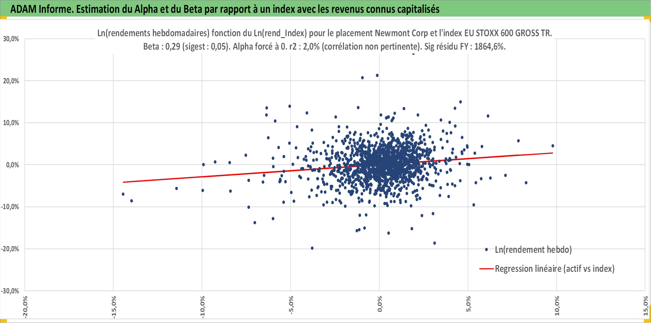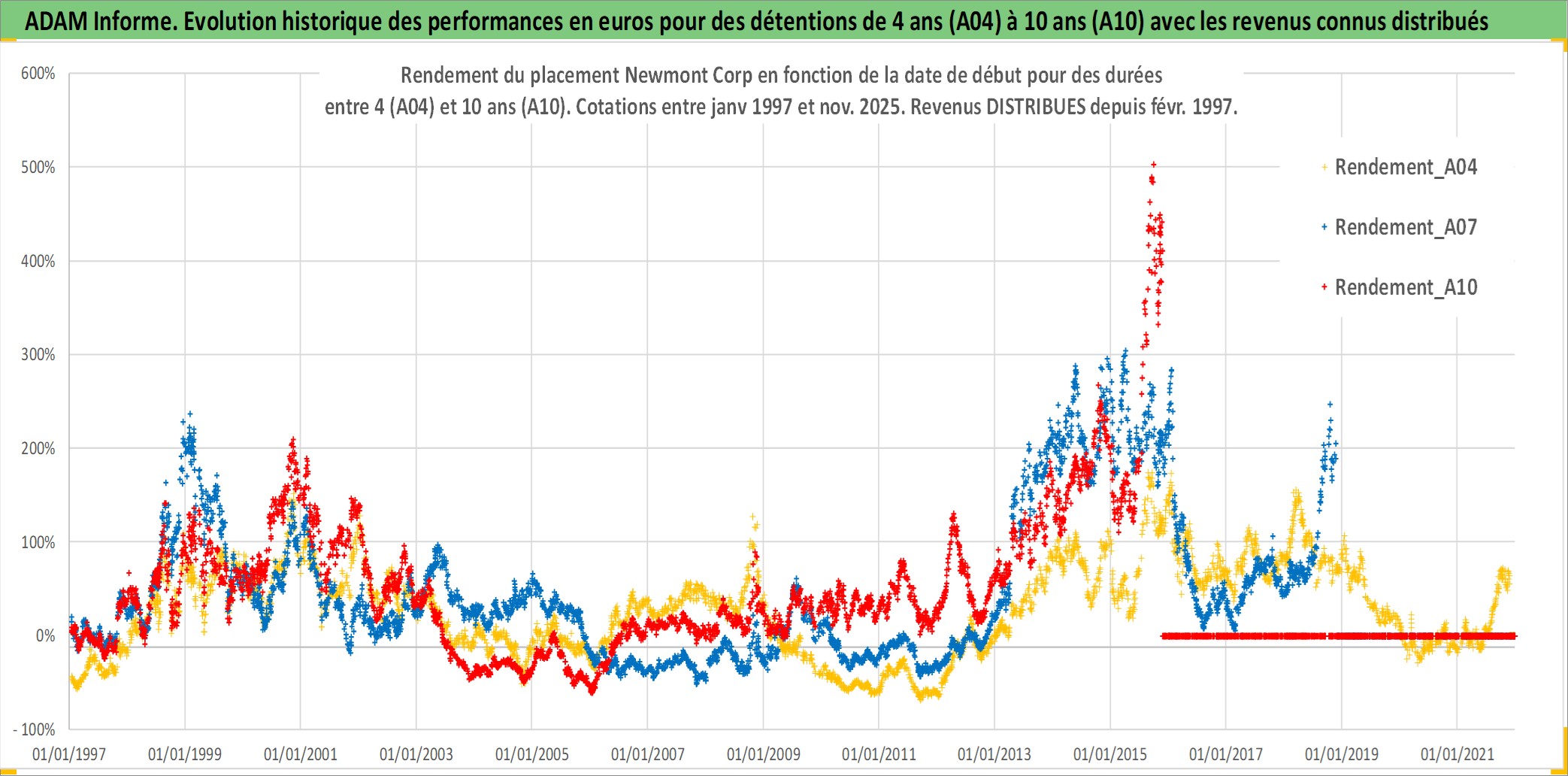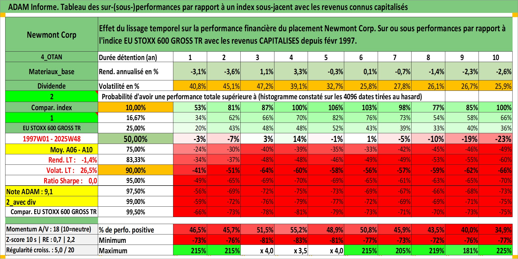 Site dédié aux investisseursPage dédiée sur site financeAnalyse des valorisations hebdomadaires de l'action Newmont Corp. Cet actif est cote en USD. Les valorisations sont en contrevaleur EURO et couvrent les semaines 1997W01 a 2025W48. Les revenus de cet actif financier sont pris en compte depuis la semaine 1997W07. La note globale ESG de cet actif est estimee a 10.0 (apres rebasage entre 0 et 20).