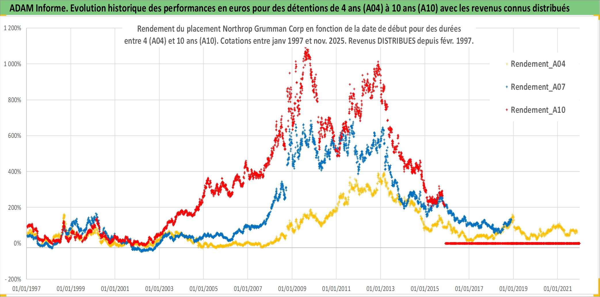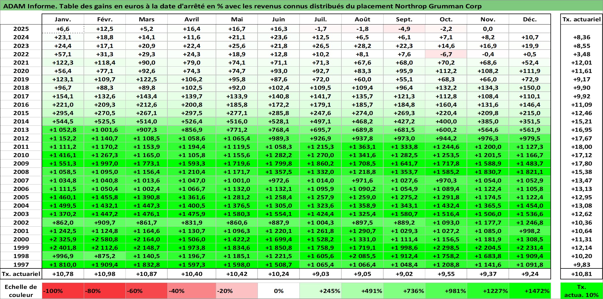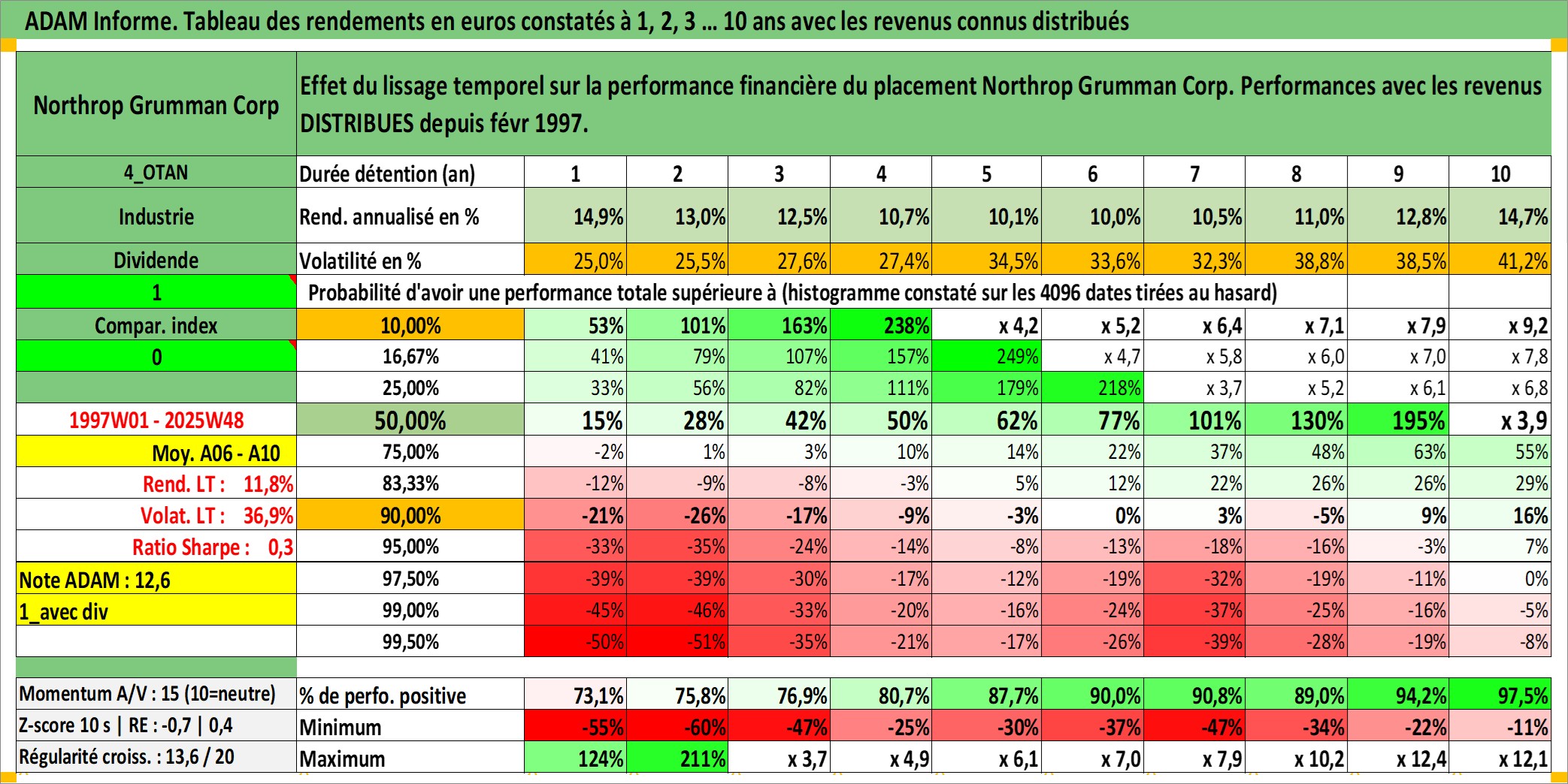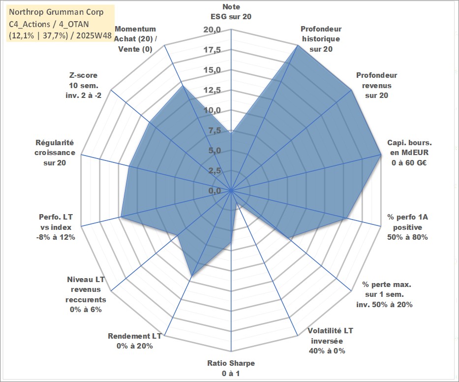 Site dédié aux investisseursPage dédiée sur site financeAnalyse des valorisations hebdomadaires de l'action Northrop Grumman Corp. Cet actif est cote en USD. Les valorisations sont en contrevaleur EURO et couvrent les semaines 1997W01 a 2025W48. Les revenus de cet actif financier sont pris en compte depuis la semaine 1997W09. La note globale ESG de cet actif est estimee a 7.0 (apres rebasage entre 0 et 20).