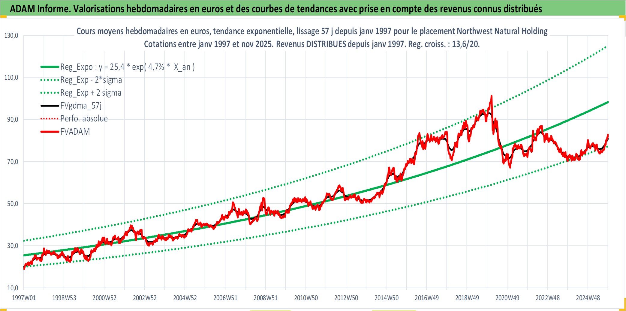 Site dédié aux investisseursPage dédiée sur site financeAnalyse des valorisations hebdomadaires de l'action Northwest Natural Holding Company. Cet actif est cote en USD. Les valorisations sont en contrevaleur EURO et couvrent les semaines 1997W01 a 2025W48. Les revenus de cet actif financier sont pris en compte depuis la semaine 1997W05. La note ESG de cet actif n'est pas connue.