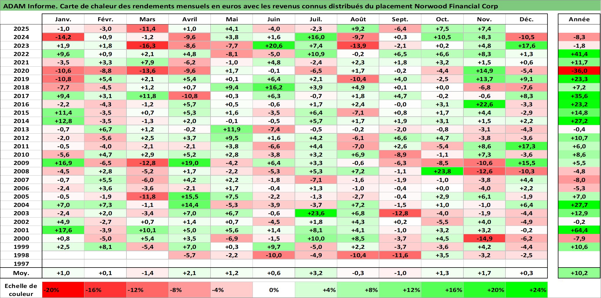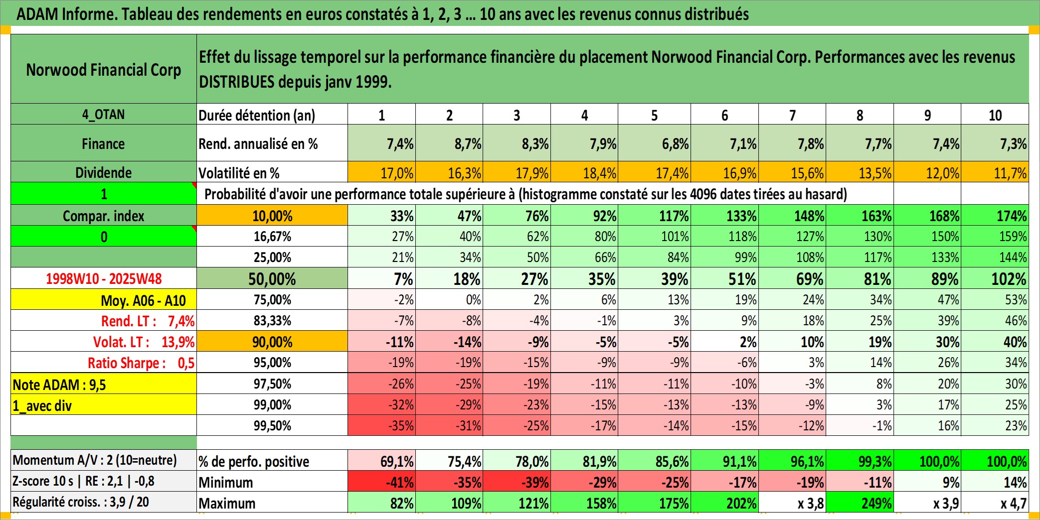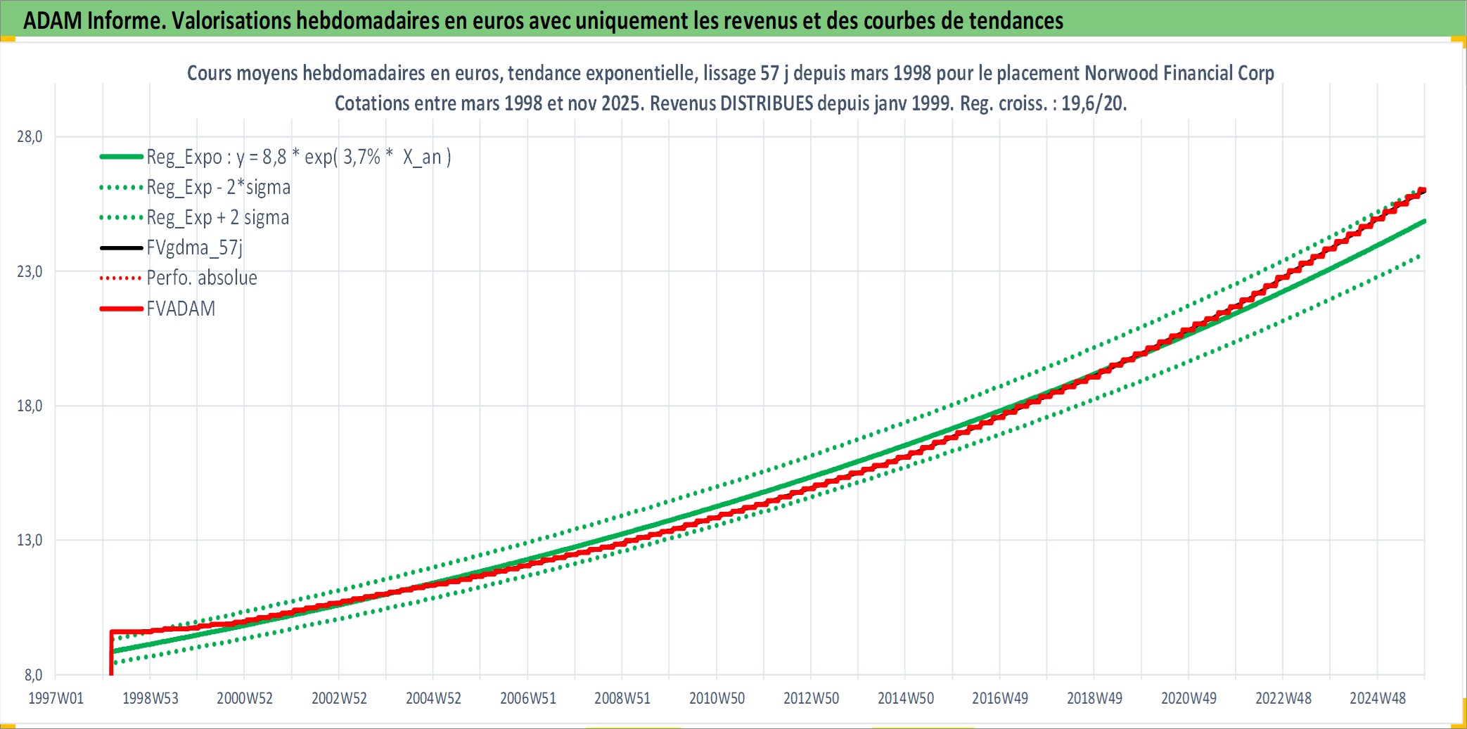 Site dédié aux investisseursPage dédiée sur site financeAnalyse des valorisations hebdomadaires de l'action Norwood Financial Corp. Cet actif est cote en USD. Les valorisations sont en contrevaleur EURO et couvrent les semaines 1998W10 a 2025W48. Les revenus de cet actif financier sont pris en compte depuis la semaine 1999W02. La note ESG de cet actif n'est pas connue.