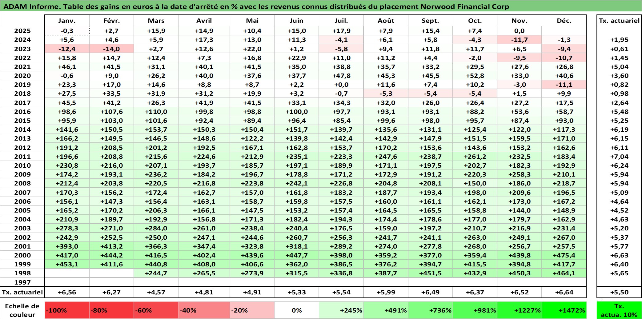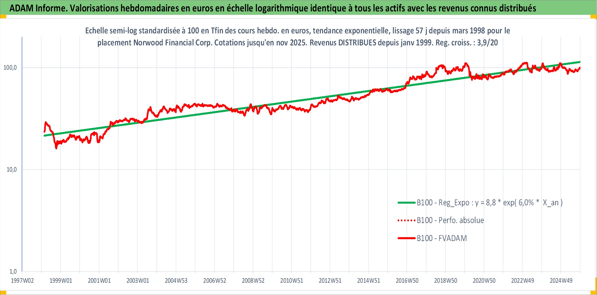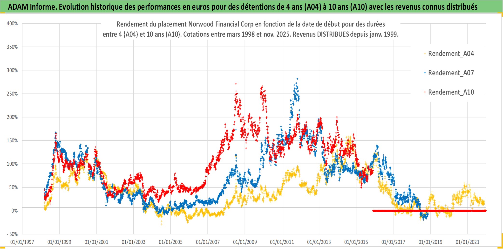 Site dédié aux investisseursPage dédiée sur site financeAnalyse des valorisations hebdomadaires de l'action Norwood Financial Corp. Cet actif est cote en USD. Les valorisations sont en contrevaleur EURO et couvrent les semaines 1998W10 a 2025W48. Les revenus de cet actif financier sont pris en compte depuis la semaine 1999W02. La note ESG de cet actif n'est pas connue.