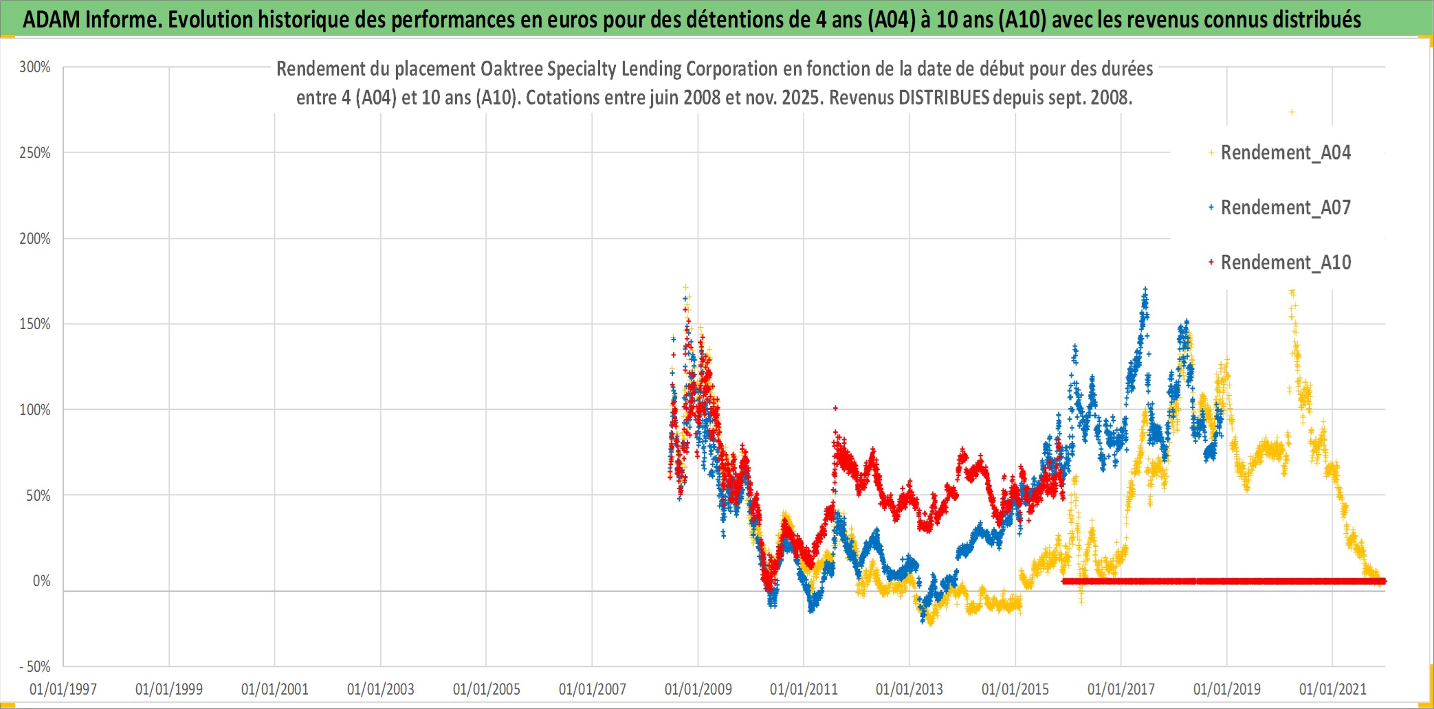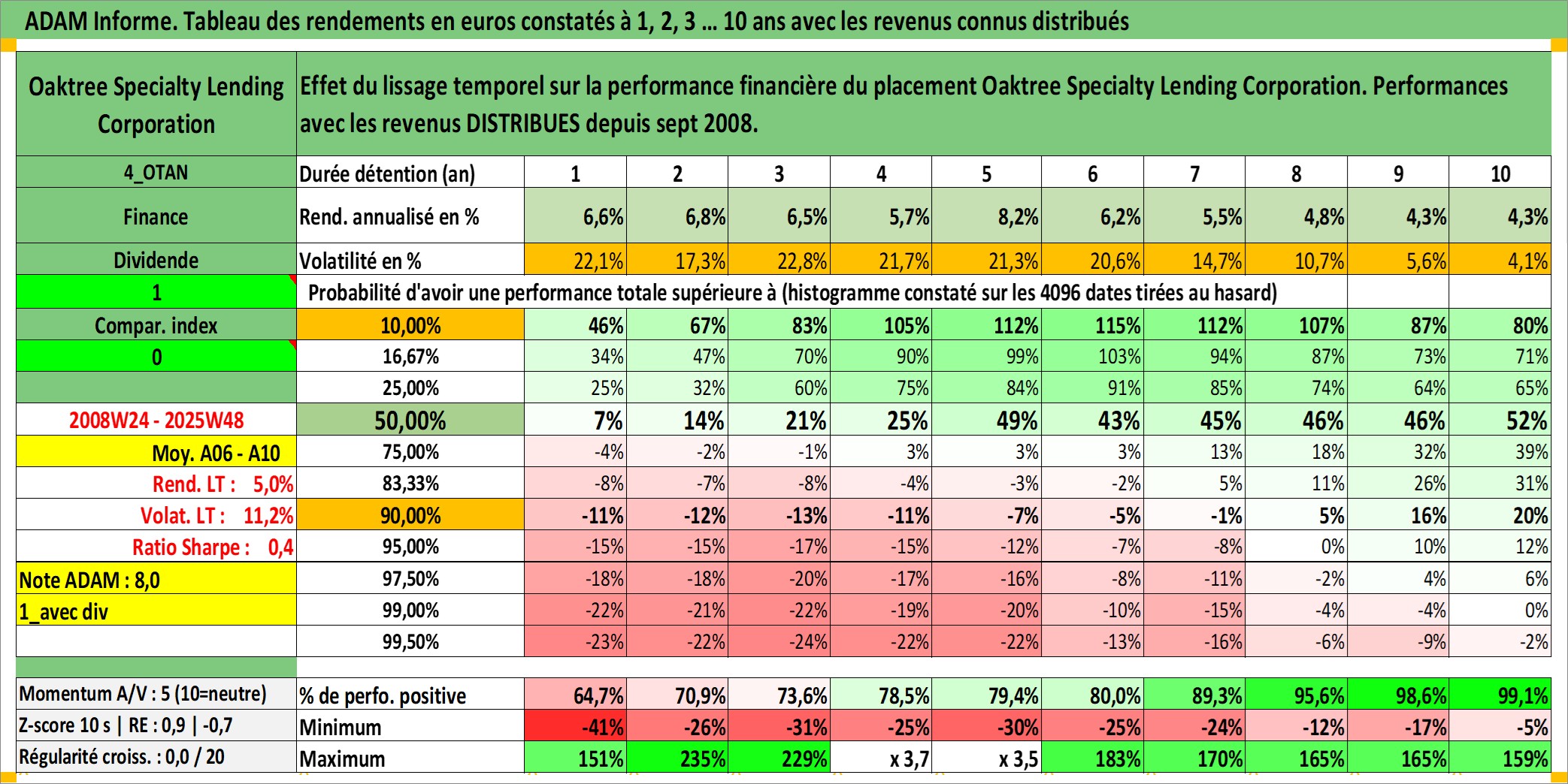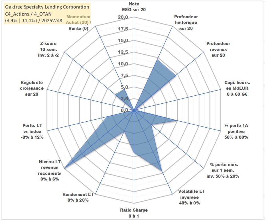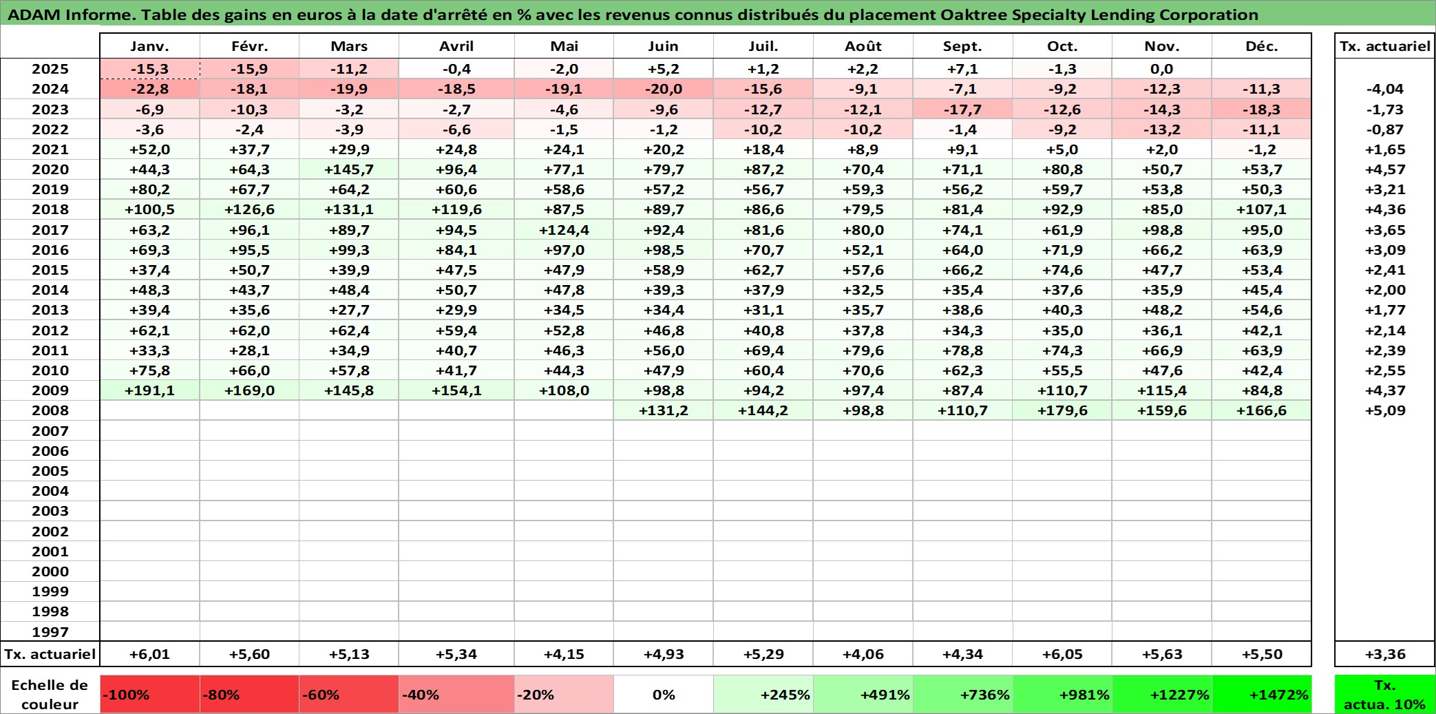 Site dédié aux investisseursPage dédiée sur site financeAnalyse des valorisations hebdomadaires de l'action Oaktree Specialty Lending Corporation. Cet actif est cote en USD. Les valorisations sont en contrevaleur EURO et couvrent les semaines 2008W24 a 2025W48. Les revenus de cet actif financier sont pris en compte depuis la semaine 2008W37. La note ESG de cet actif n'est pas connue.