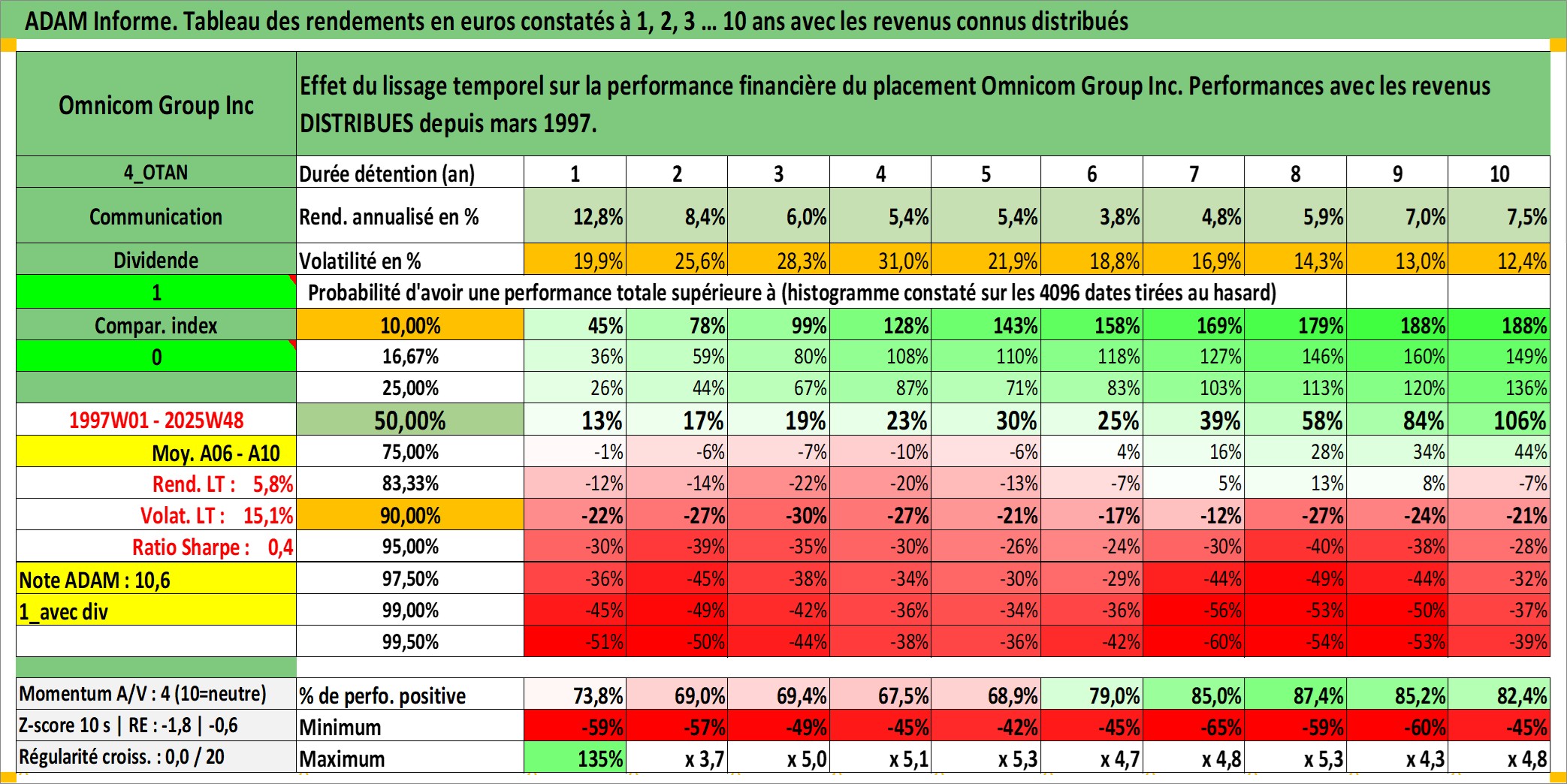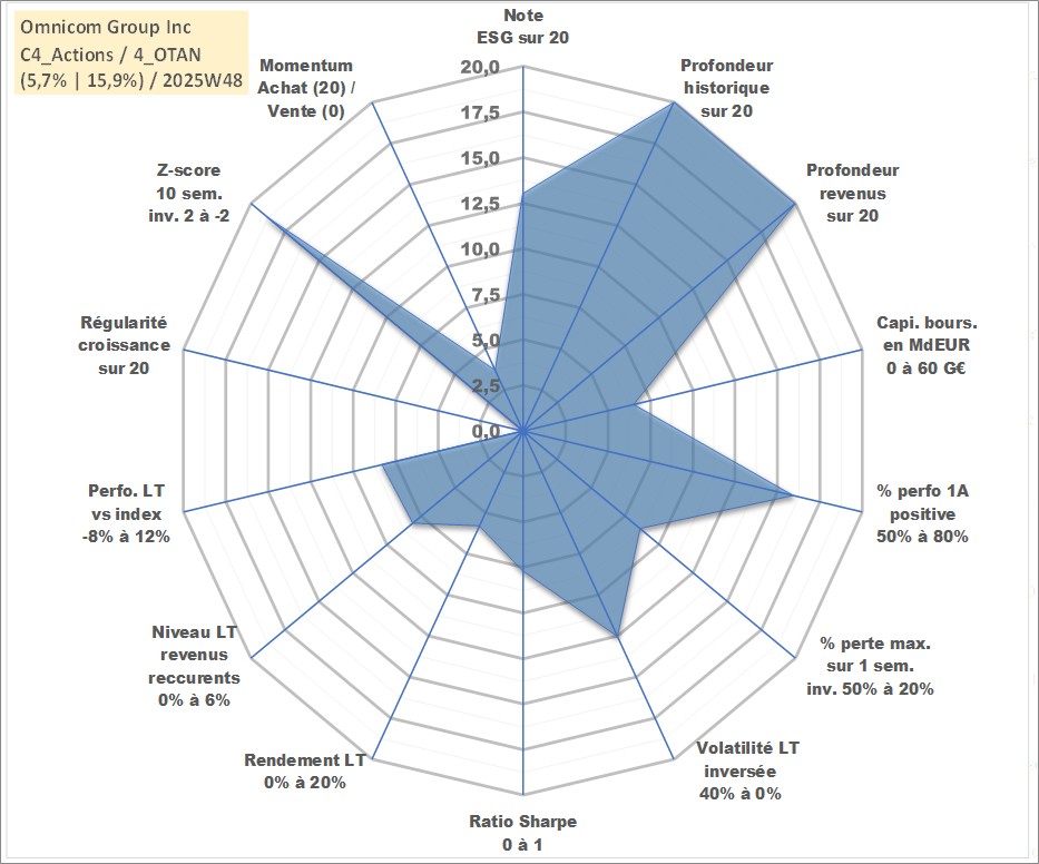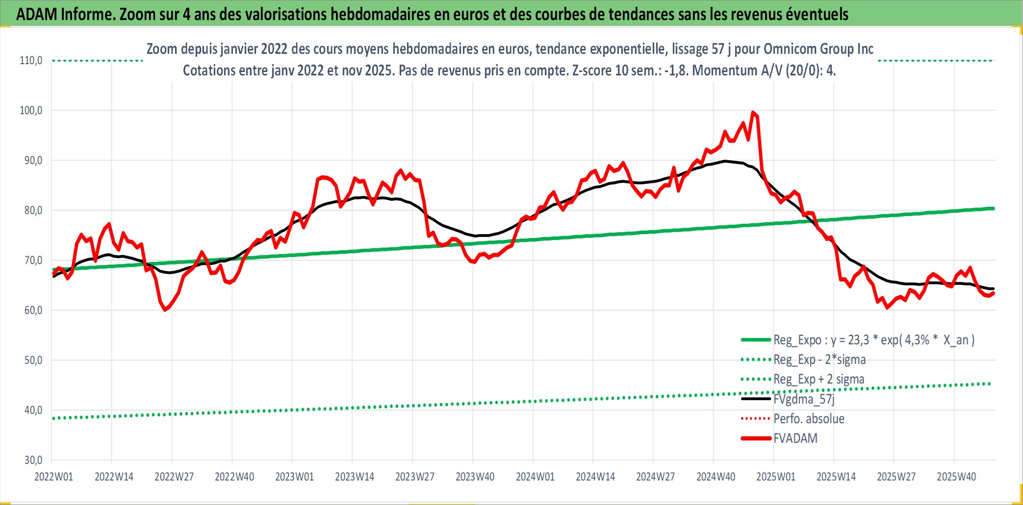 Site dédié aux investisseursPage dédiée sur site financeAnalyse des valorisations hebdomadaires de l'action Omnicom Group Inc. Cet actif est cote en USD. Les valorisations sont en contrevaleur EURO et couvrent les semaines 1997W01 a 2025W48. Les revenus de cet actif financier sont pris en compte depuis la semaine 1997W11. La note globale ESG de cet actif est estimee a 13.0 (apres rebasage entre 0 et 20).