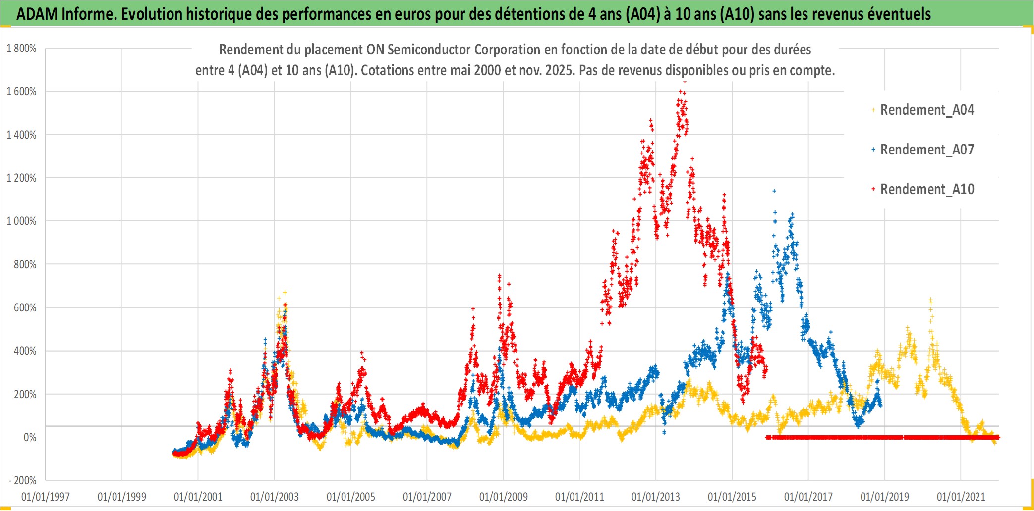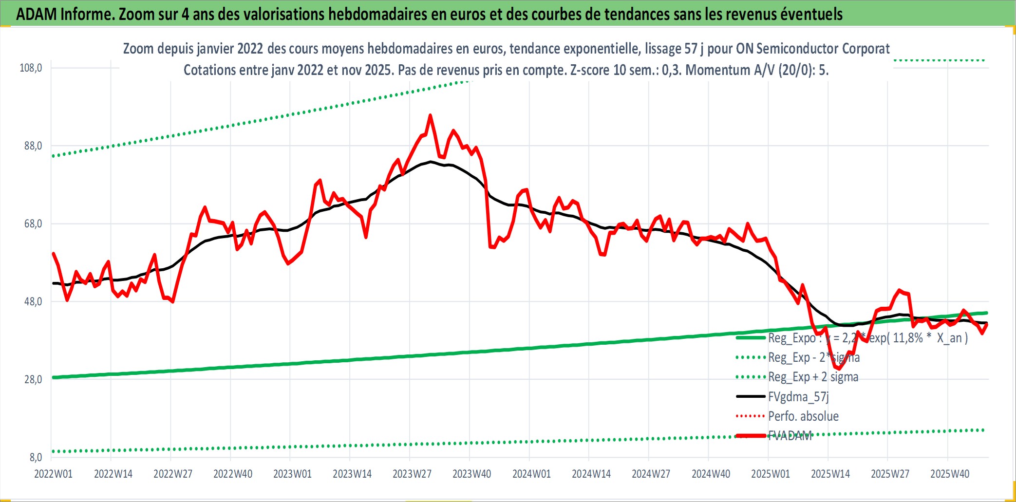 Site dédié aux investisseursPage dédiée sur site financeAnalyse des valorisations hebdomadaires de l'action ON Semiconductor Corporation. Cet actif est cote en USD. Les valorisations sont en contrevaleur EURO et couvrent les semaines 2000W18 a 2025W48. Les revenus de cet actif financier ne sont pas connus car non existants ou non disponibles sur le site Yahoo Finance. La note globale ESG de cet actif est estimee a 7.0 (apres rebasage entre 0 et 20).
