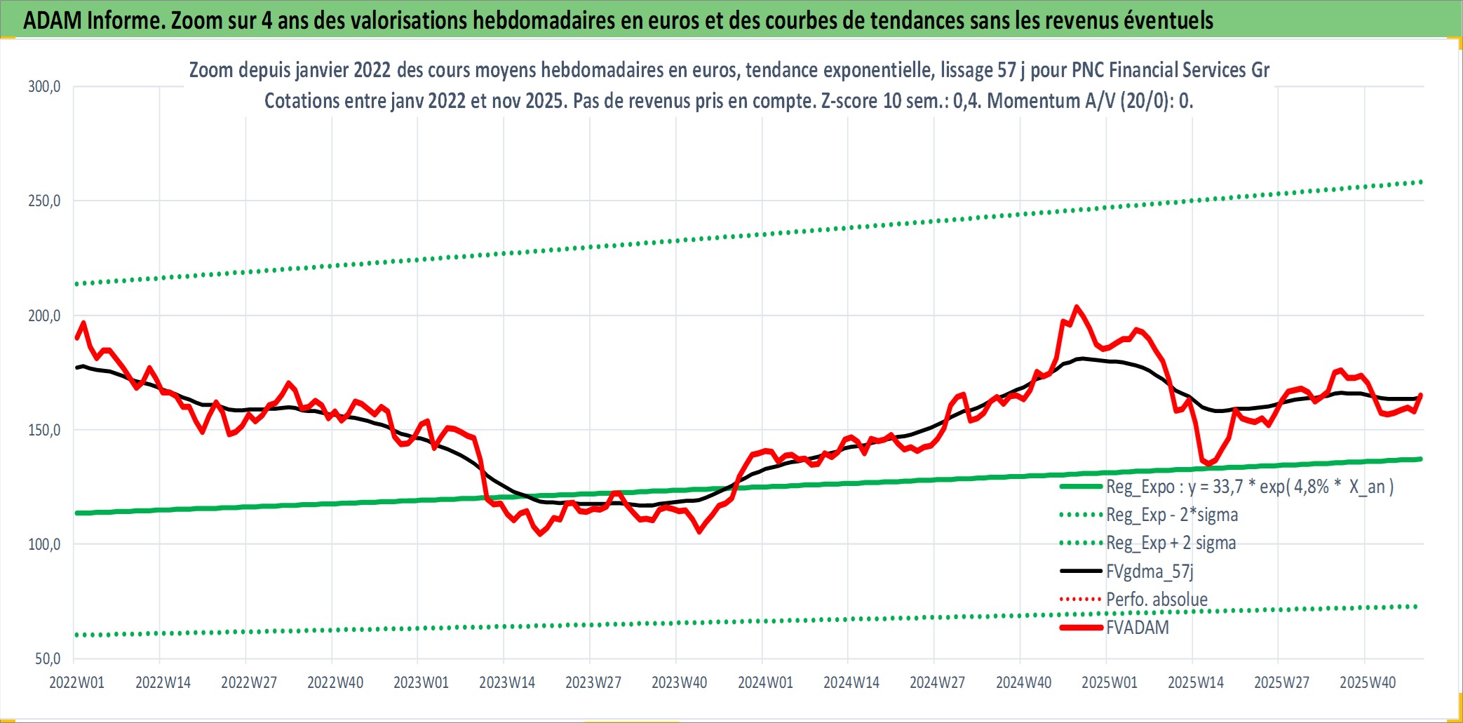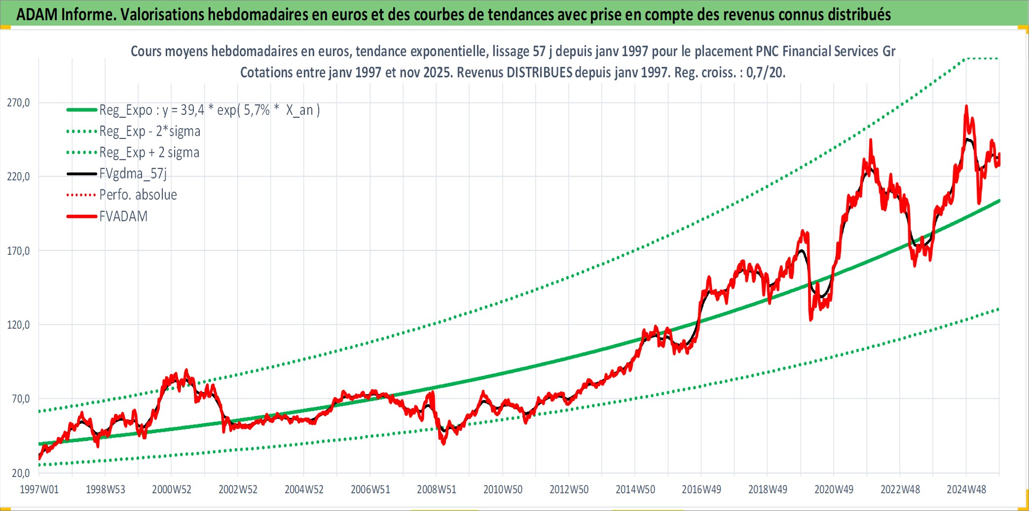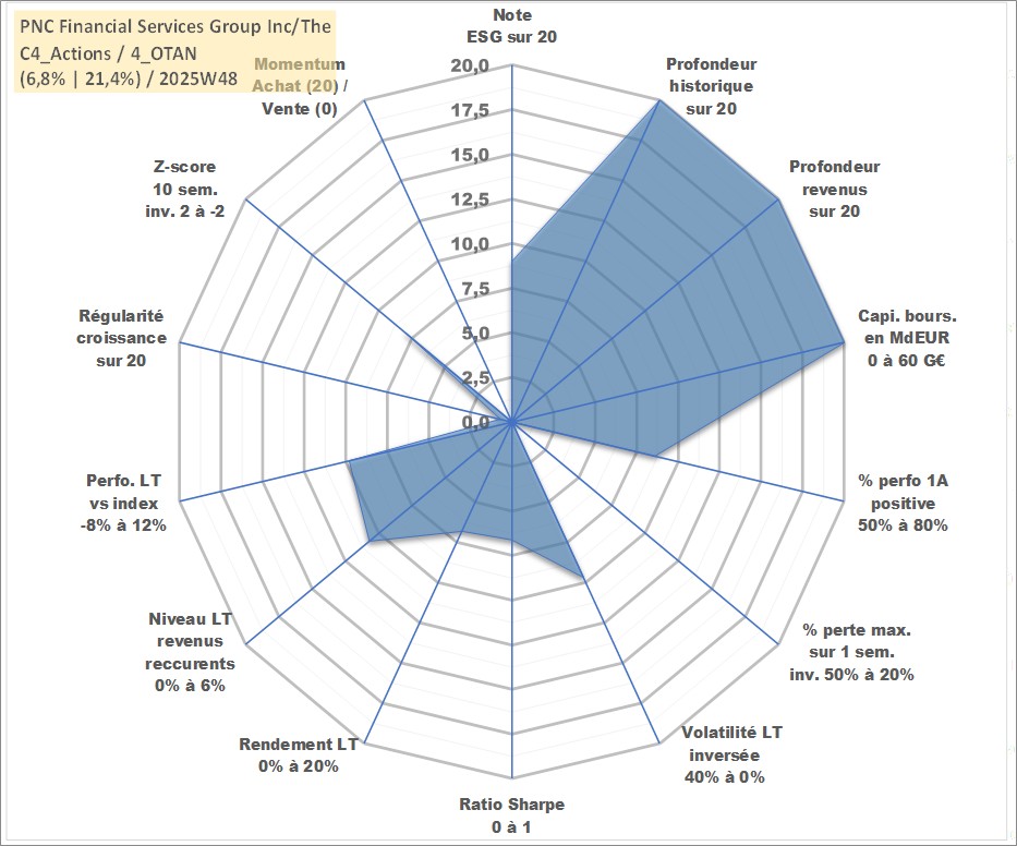 Site dédié aux investisseursPage dédiée sur site financeAnalyse des valorisations hebdomadaires de l'action PNC Financial Services Group Inc/The. Cet actif est cote en USD. Les valorisations sont en contrevaleur EURO et couvrent les semaines 1997W01 a 2025W48. Les revenus de cet actif financier sont pris en compte depuis la semaine 1997W02. La note globale ESG de cet actif est estimee a 9.0 (apres rebasage entre 0 et 20).