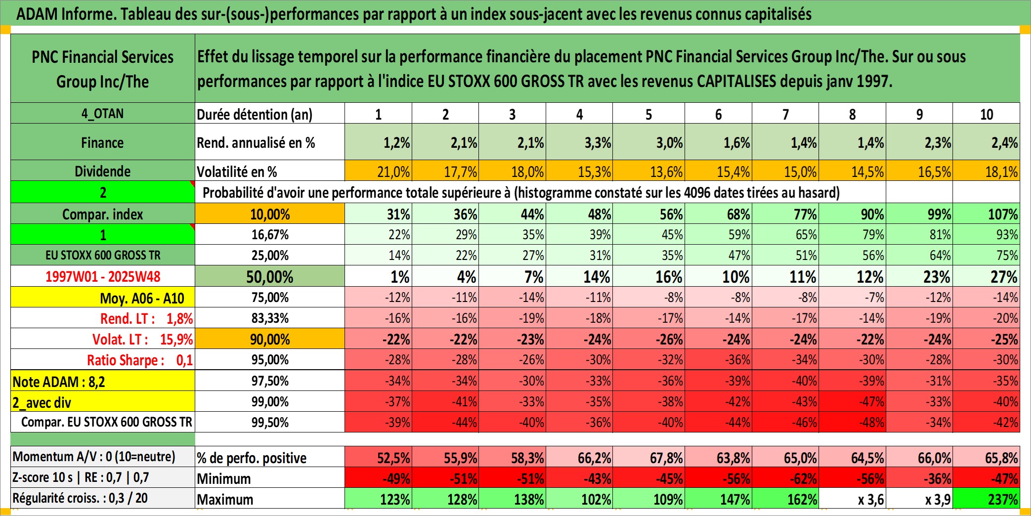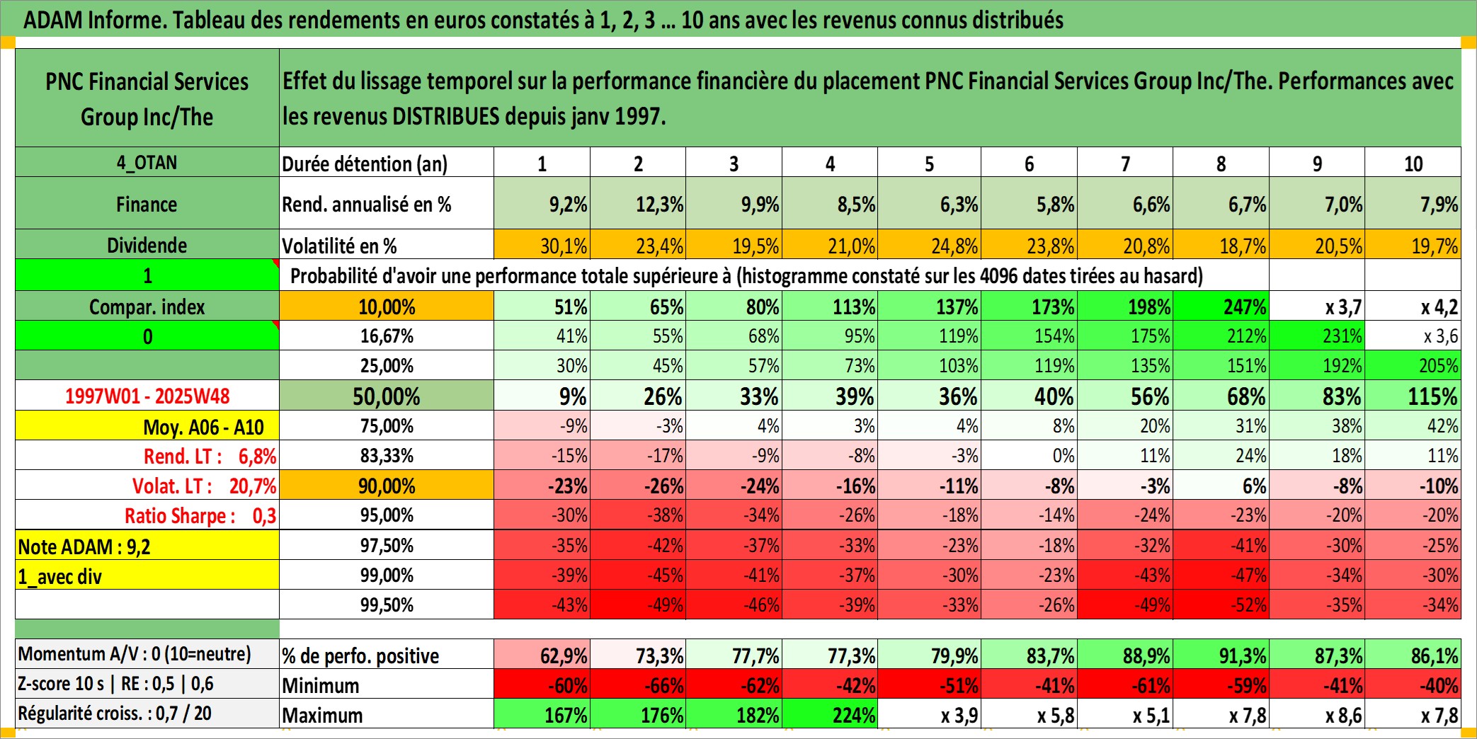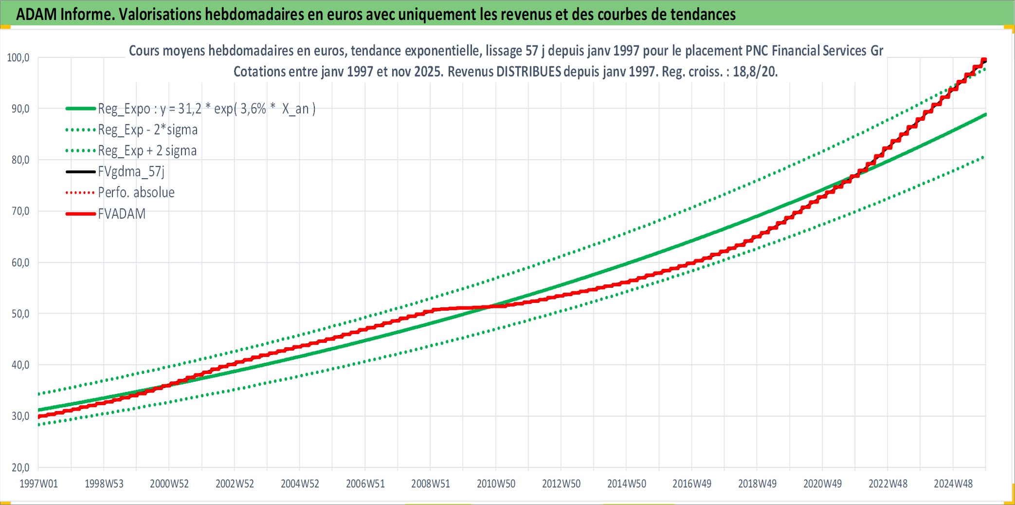 Site dédié aux investisseursPage dédiée sur site financeAnalyse des valorisations hebdomadaires de l'action PNC Financial Services Group Inc/The. Cet actif est cote en USD. Les valorisations sont en contrevaleur EURO et couvrent les semaines 1997W01 a 2025W48. Les revenus de cet actif financier sont pris en compte depuis la semaine 1997W02. La note globale ESG de cet actif est estimee a 9.0 (apres rebasage entre 0 et 20).