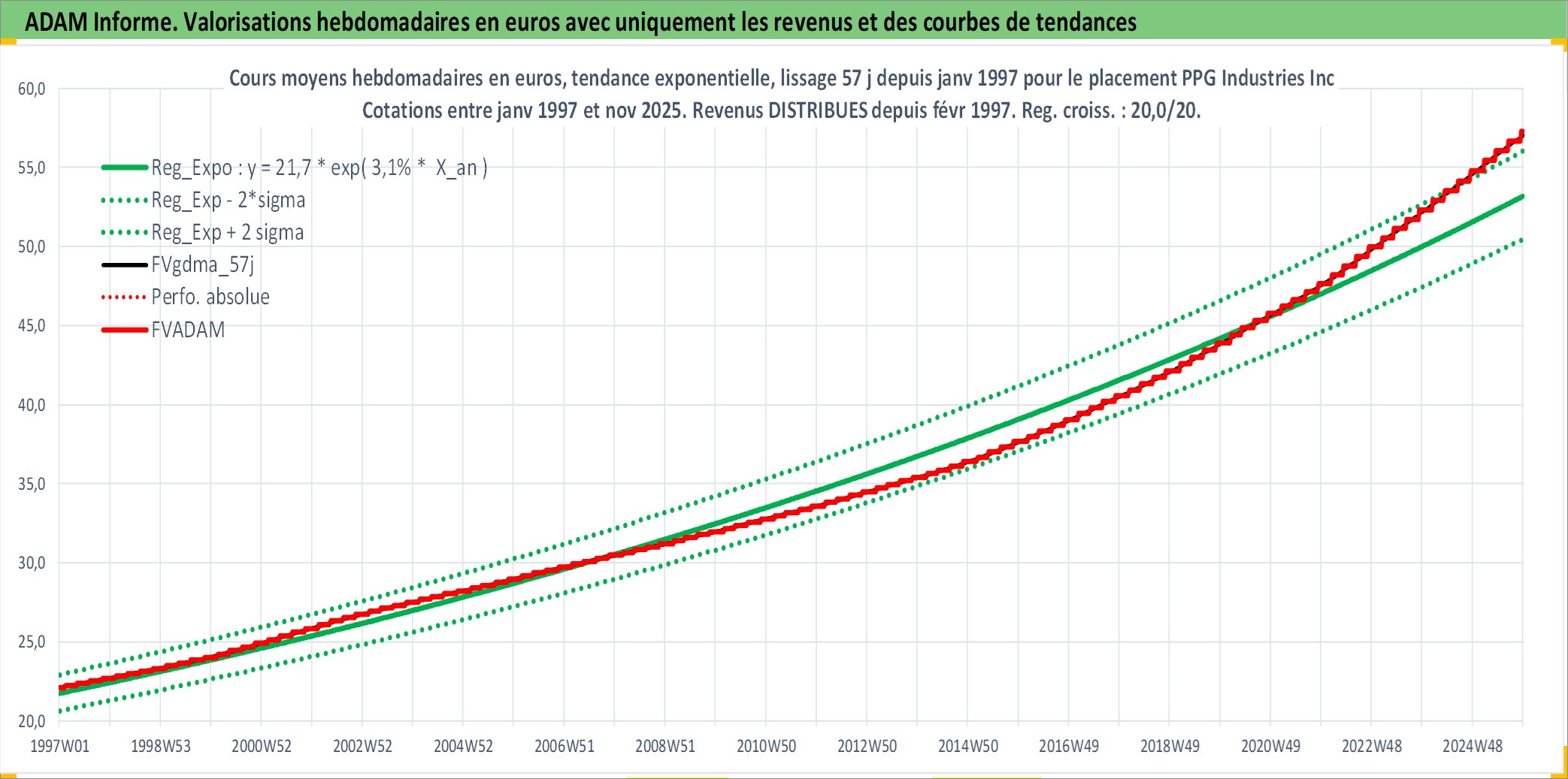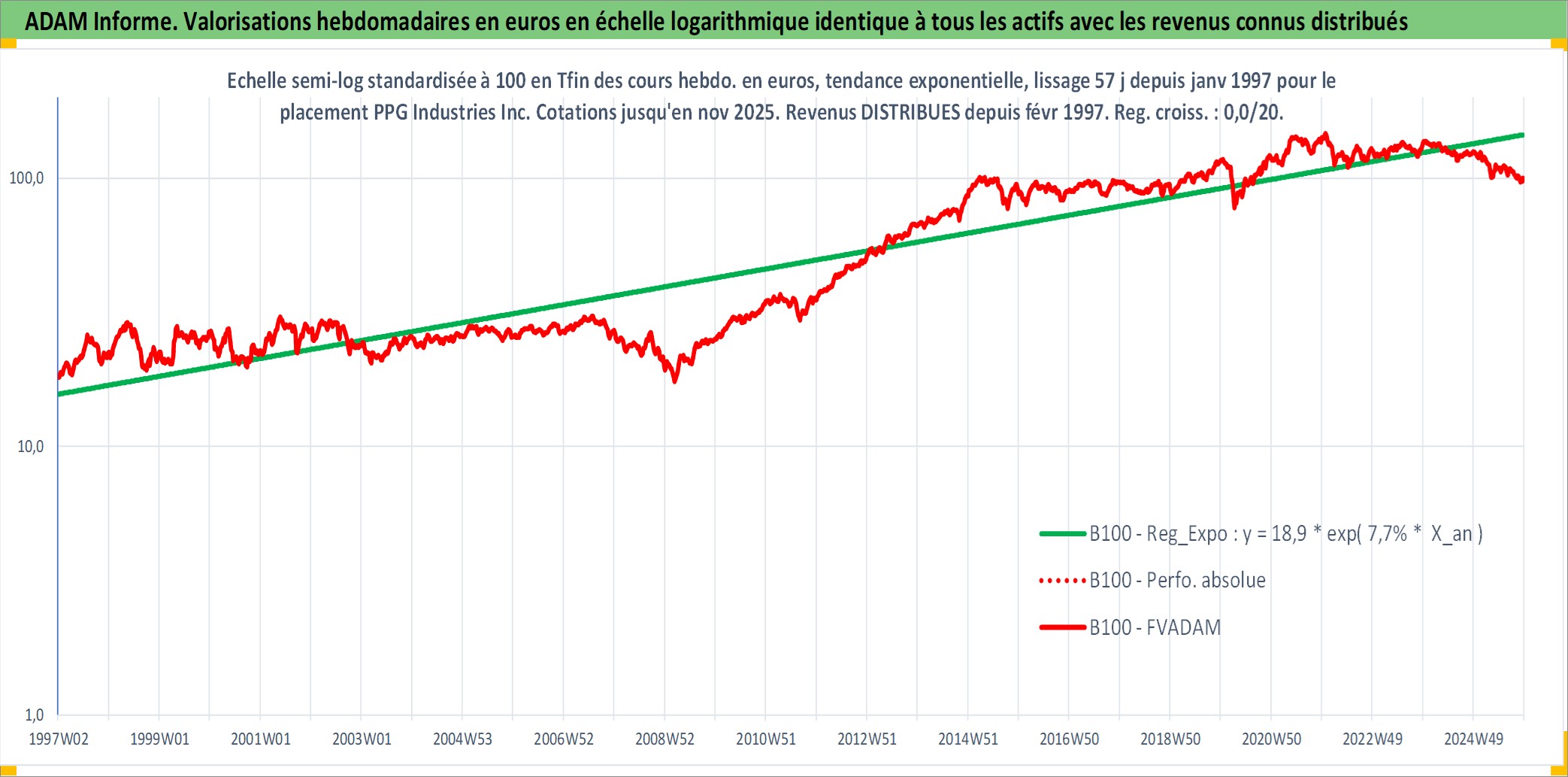 Site dédié aux investisseursPage dédiée sur site financeAnalyse des valorisations hebdomadaires de l'action PPG Industries Inc. Cet actif est cote en USD. Les valorisations sont en contrevaleur EURO et couvrent les semaines 1997W01 a 2025W48. Les revenus de cet actif financier sont pris en compte depuis la semaine 1997W07. La note globale ESG de cet actif est estimee a 8.0 (apres rebasage entre 0 et 20).