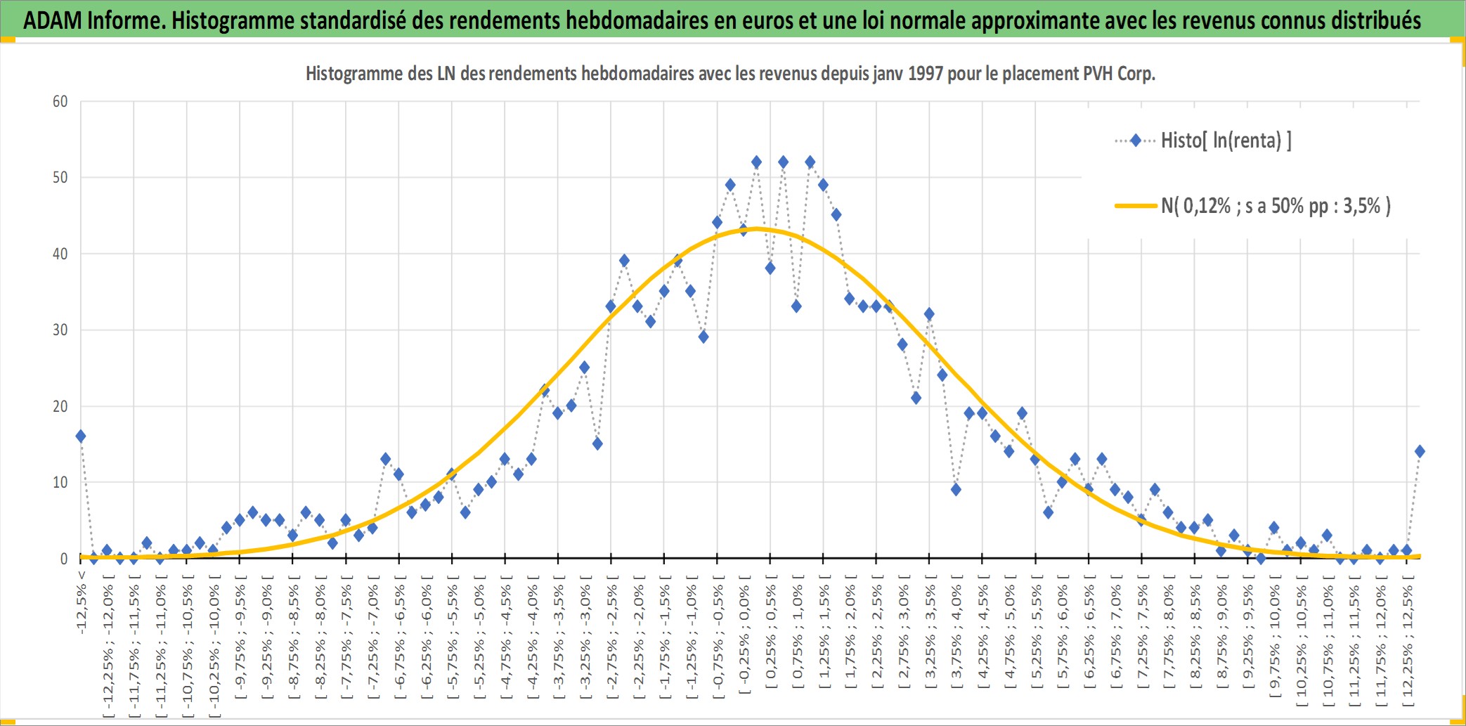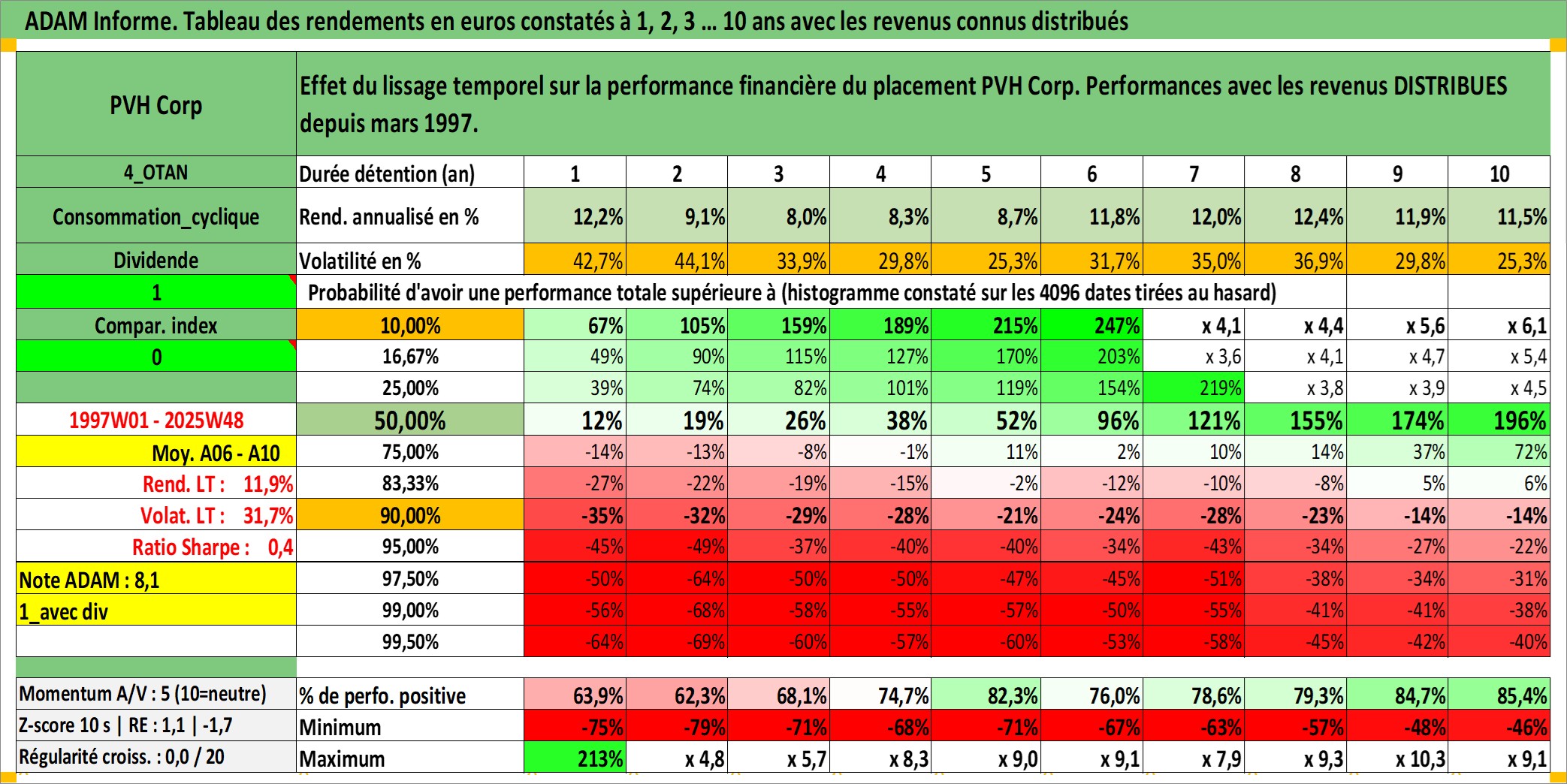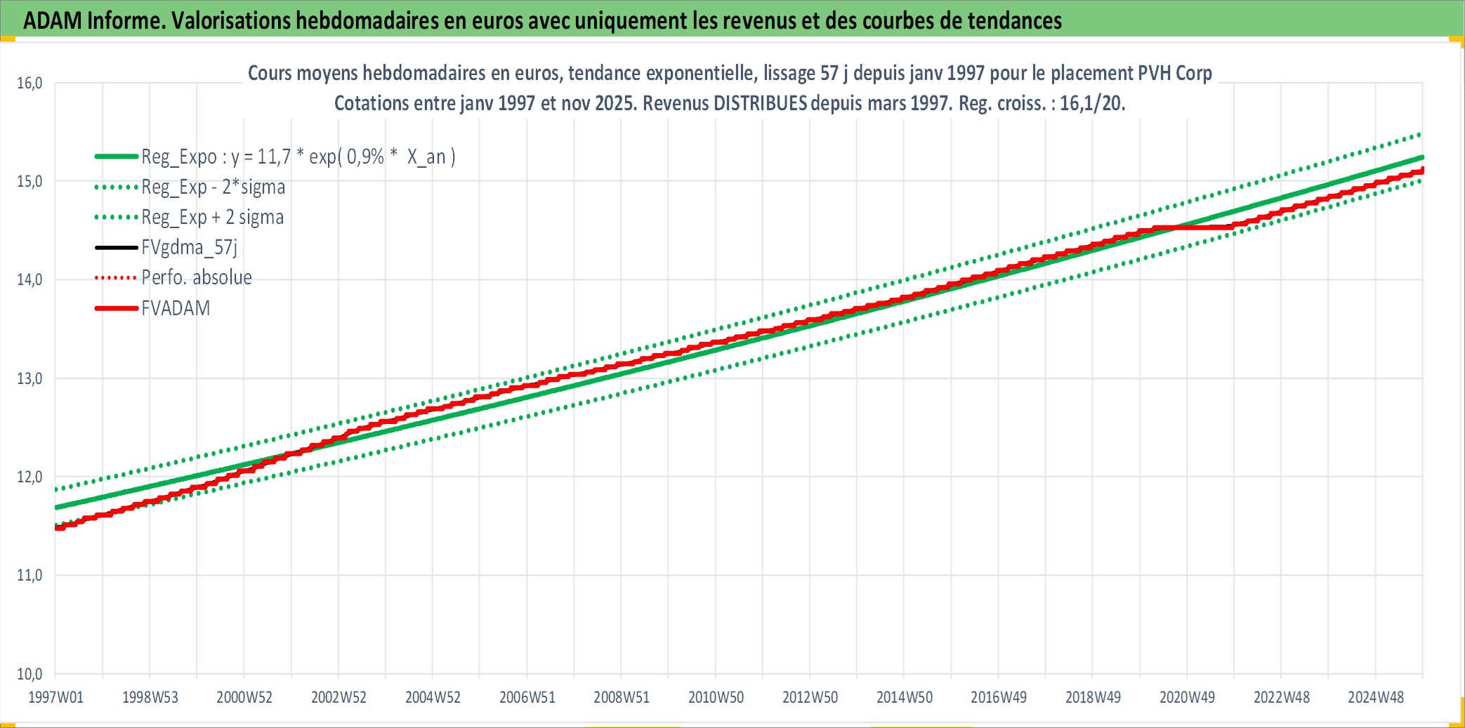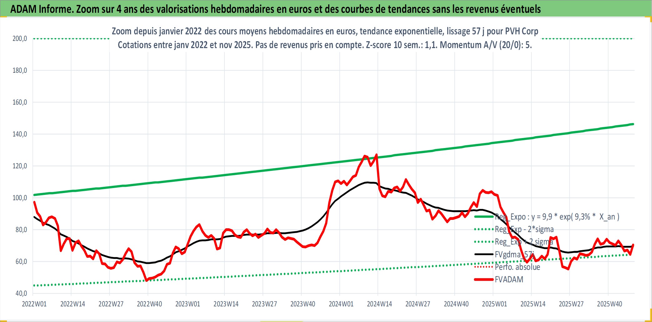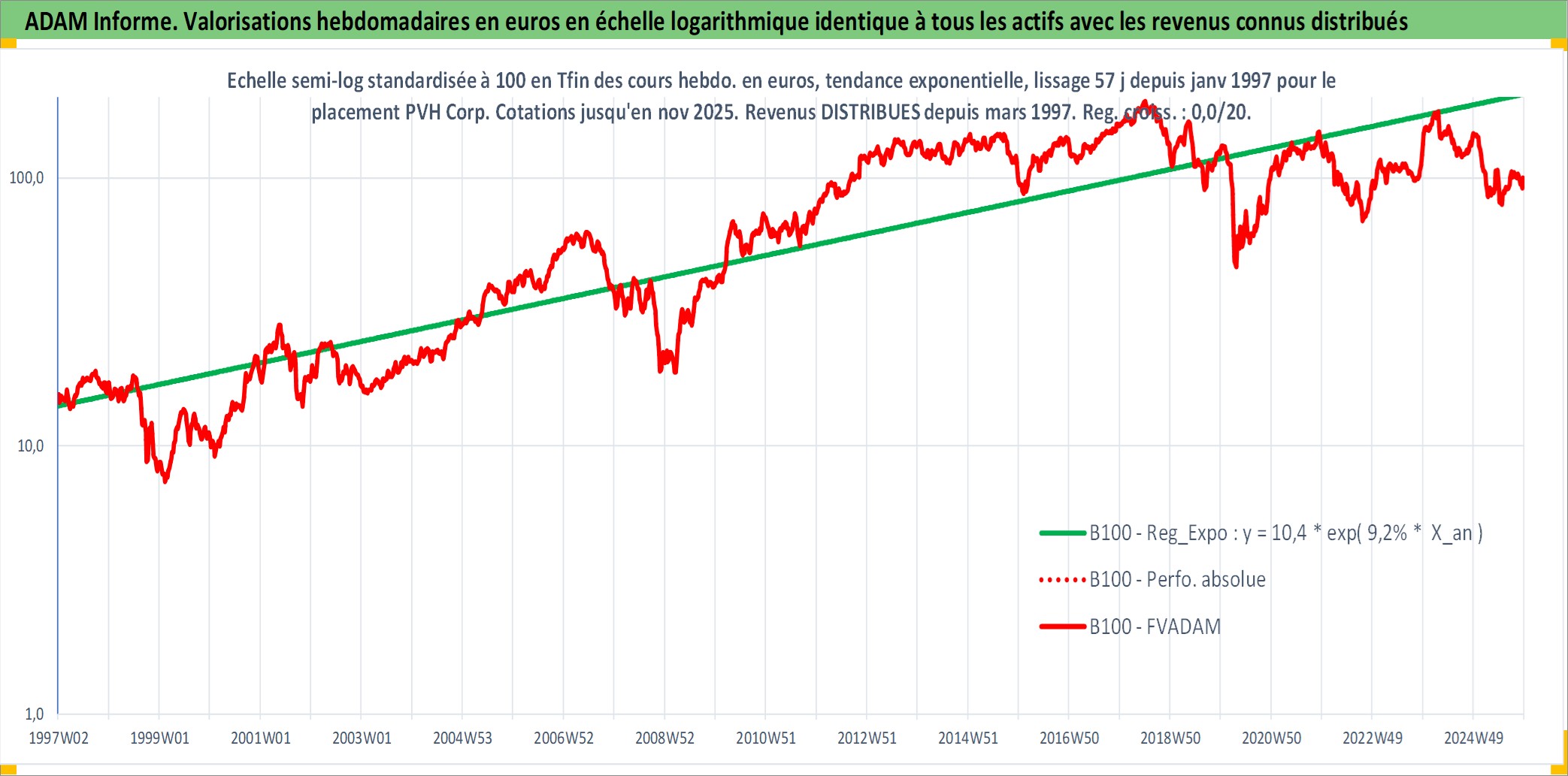 Site dédié aux investisseursPage dédiée sur site financeAnalyse des valorisations hebdomadaires de l'action PVH Corp. Cet actif est cote en USD. Les valorisations sont en contrevaleur EURO et couvrent les semaines 1997W01 a 2025W48. Les revenus de cet actif financier sont pris en compte depuis la semaine 1997W11. La note globale ESG de cet actif est estimee a 13.0 (apres rebasage entre 0 et 20).