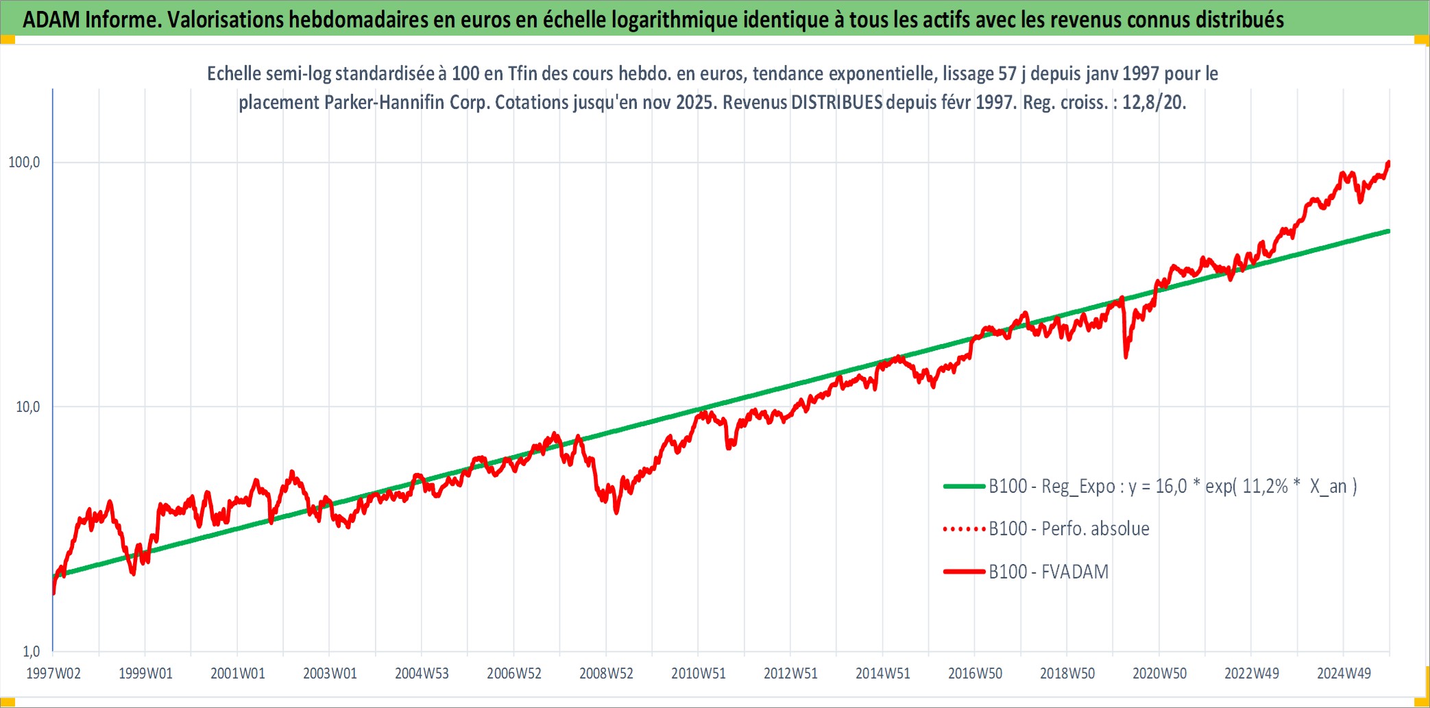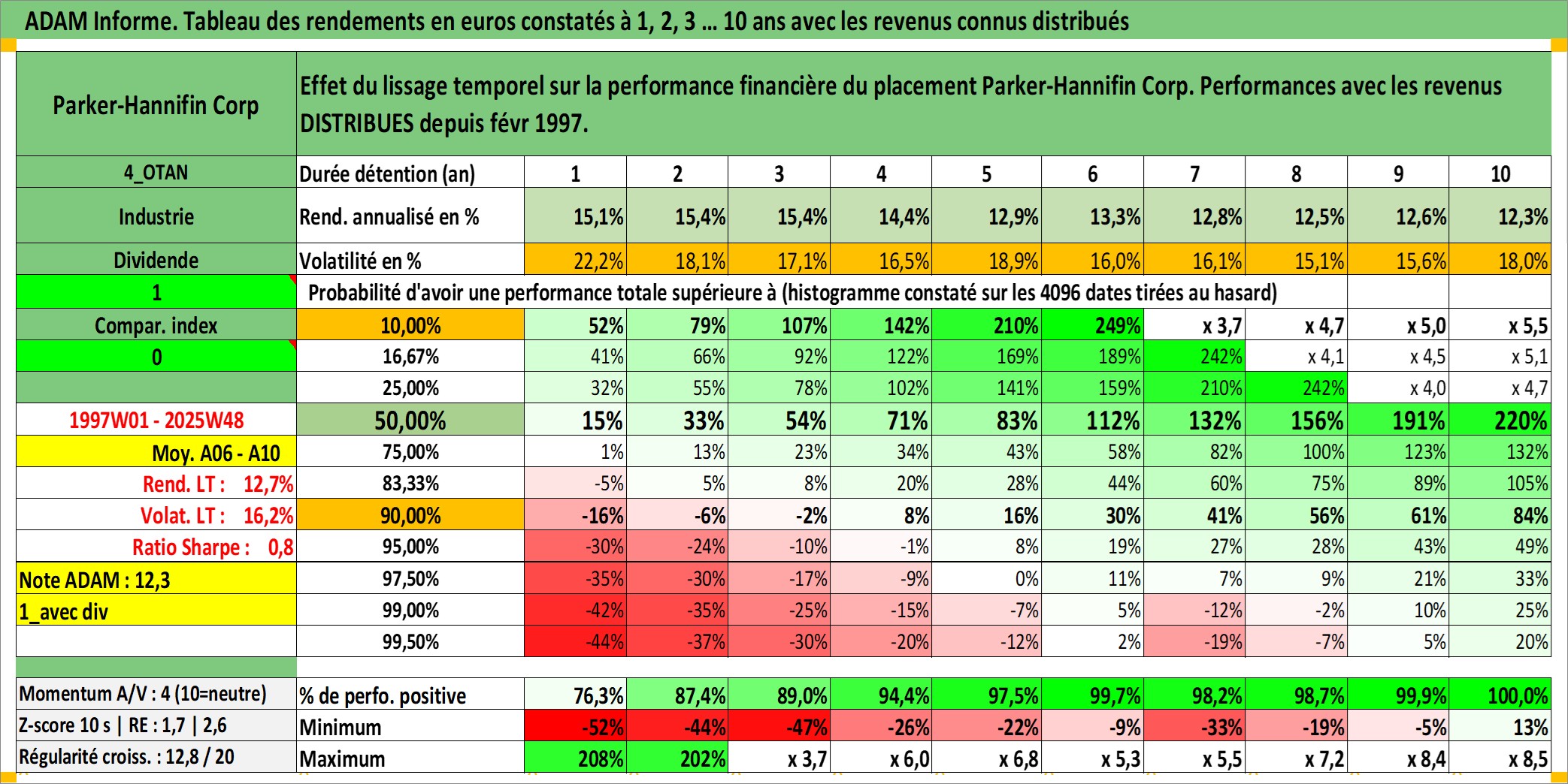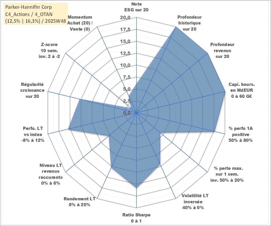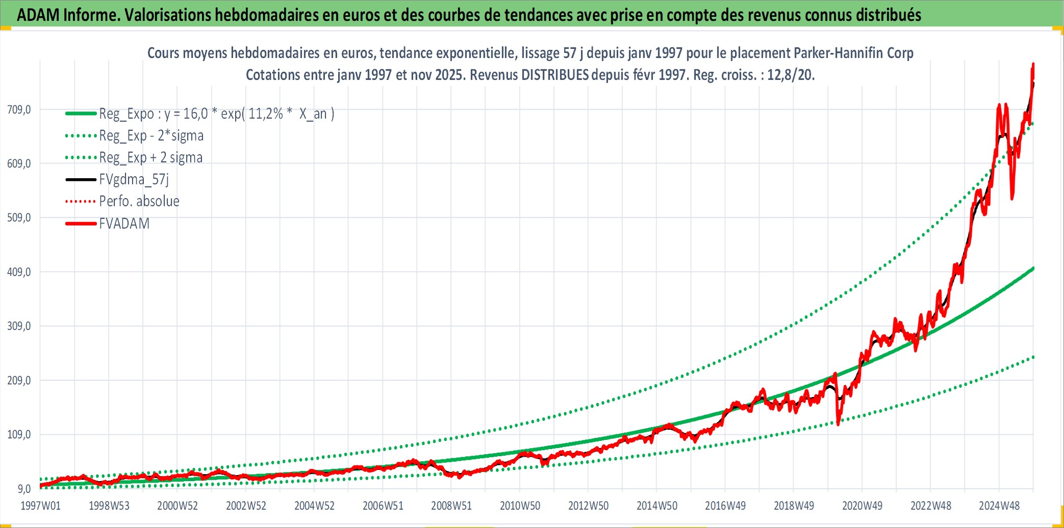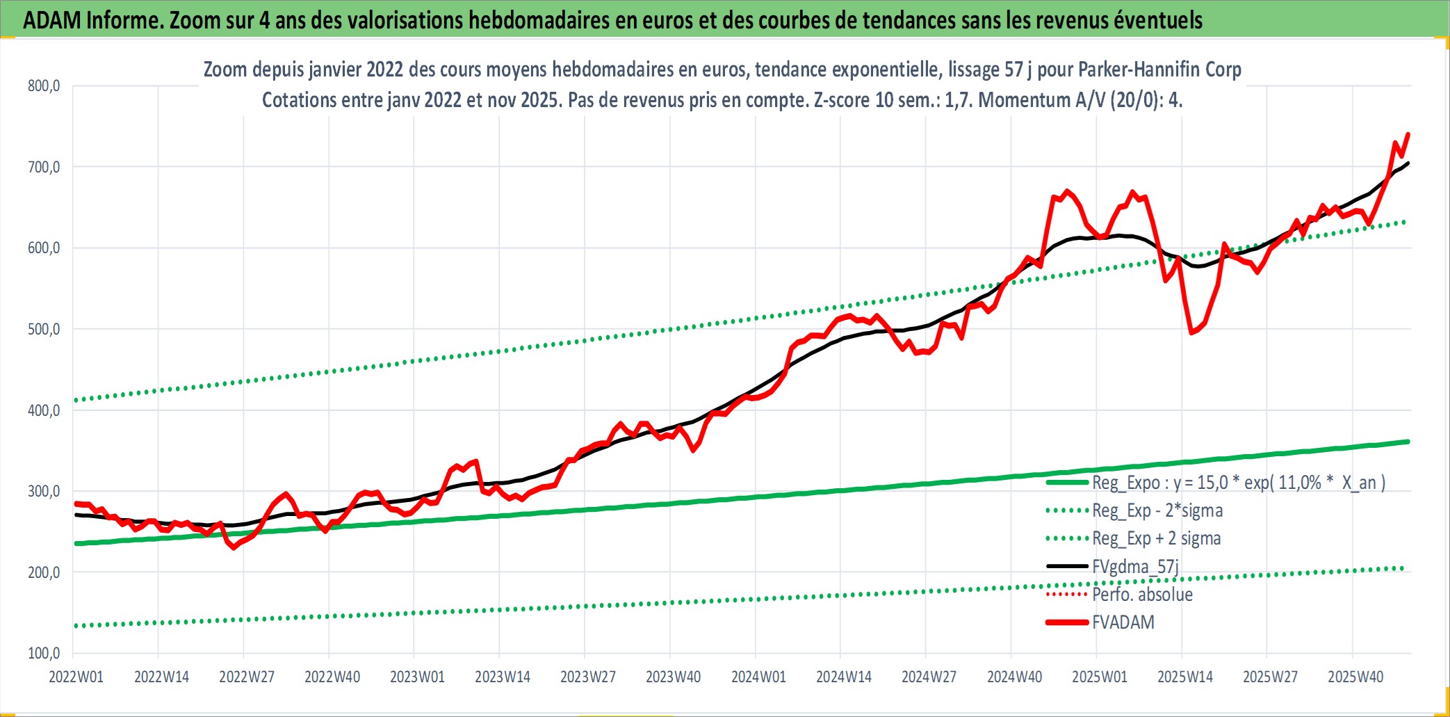 Site dédié aux investisseursPage dédiée sur site financeAnalyse des valorisations hebdomadaires de l'action Parker-Hannifin Corp. Cet actif est cote en USD. Les valorisations sont en contrevaleur EURO et couvrent les semaines 1997W01 a 2025W48. Les revenus de cet actif financier sont pris en compte depuis la semaine 1997W08. La note globale ESG de cet actif est estimee a 6.0 (apres rebasage entre 0 et 20).