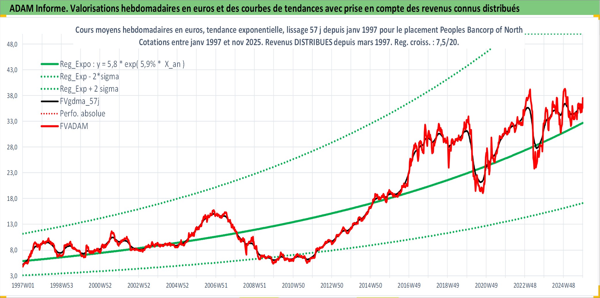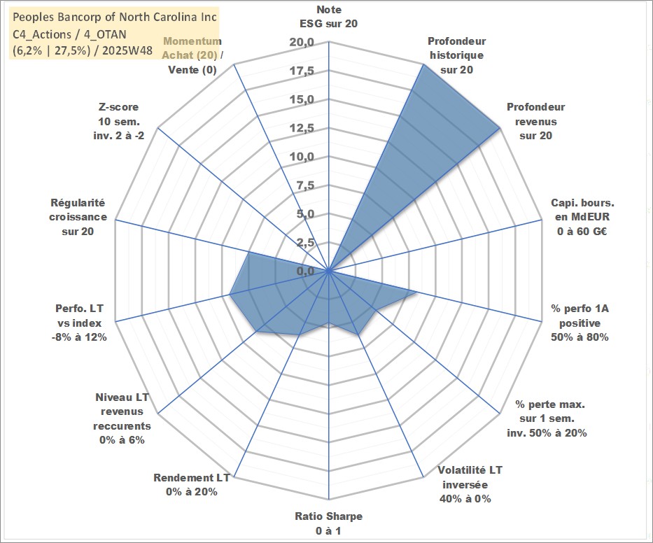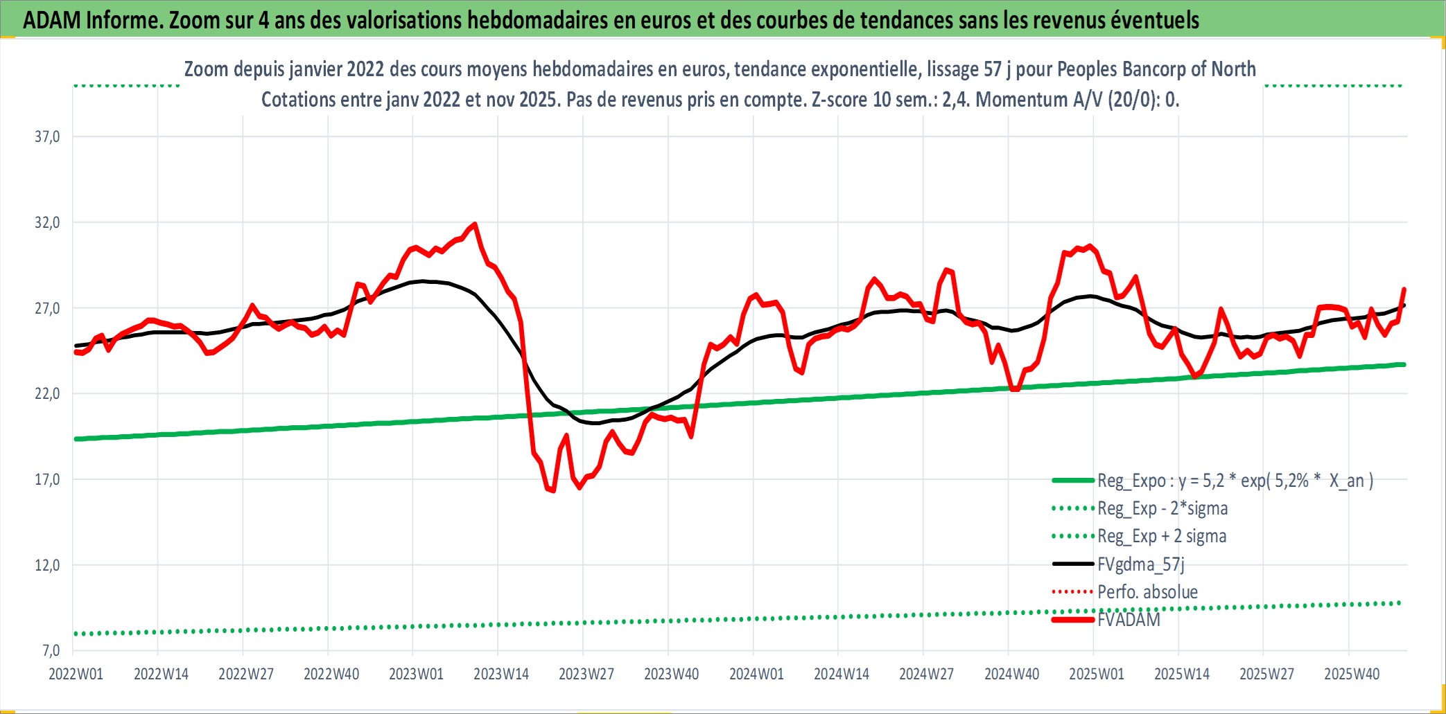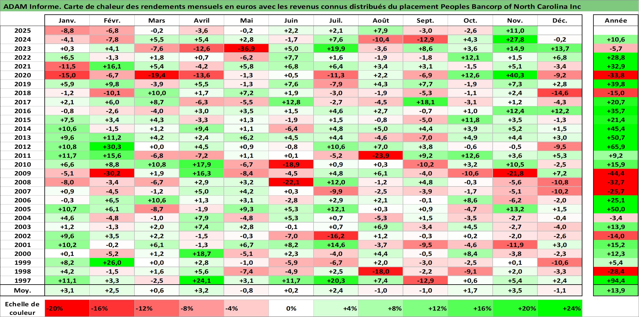 Site dédié aux investisseursPage dédiée sur site financeAnalyse des valorisations hebdomadaires de l'action Peoples Bancorp of North Carolina Inc. Cet actif est cote en USD. Les valorisations sont en contrevaleur EURO et couvrent les semaines 1997W01 a 2025W48. Les revenus de cet actif financier sont pris en compte depuis la semaine 1997W11. La note ESG de cet actif n'est pas connue.