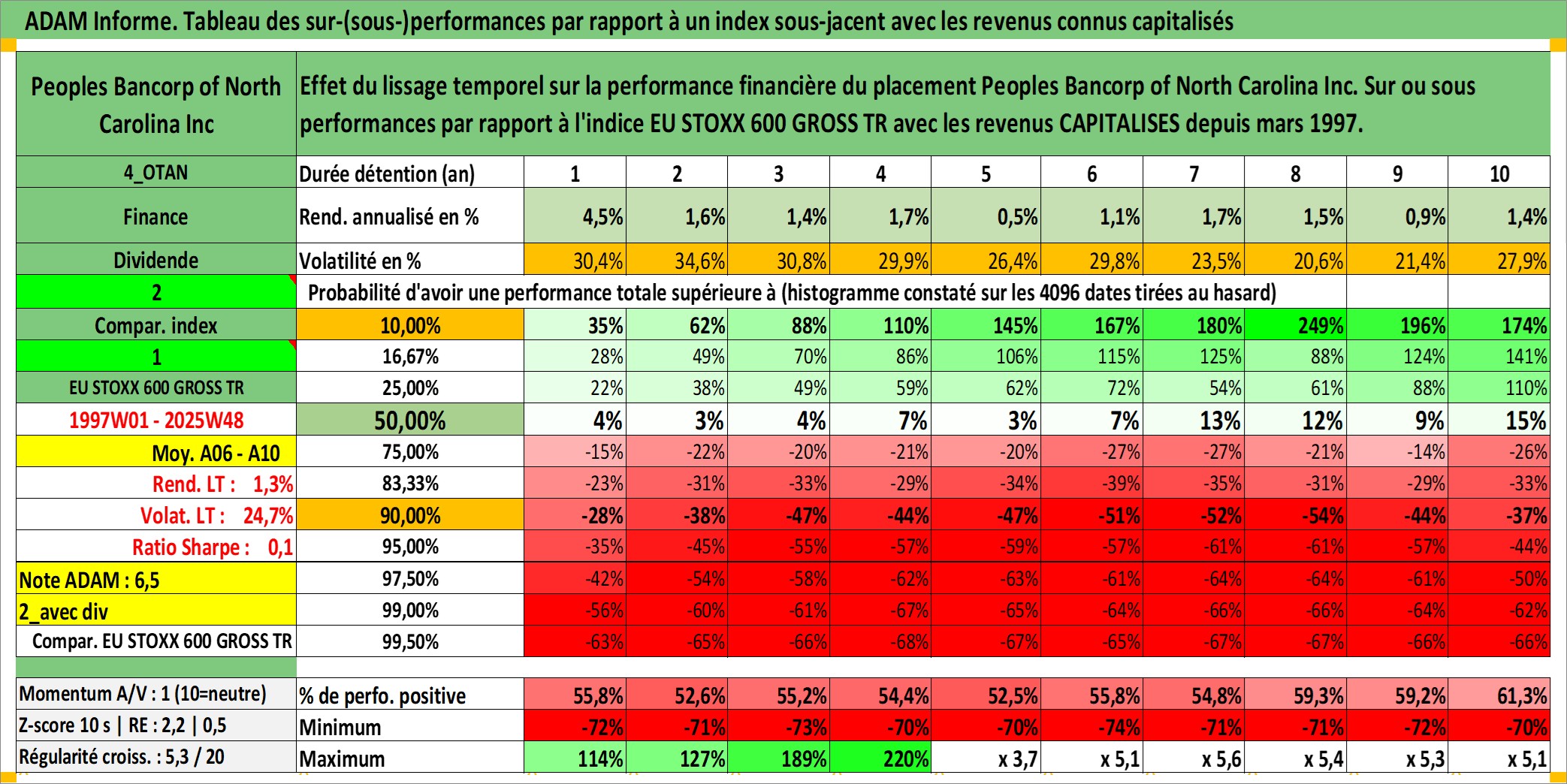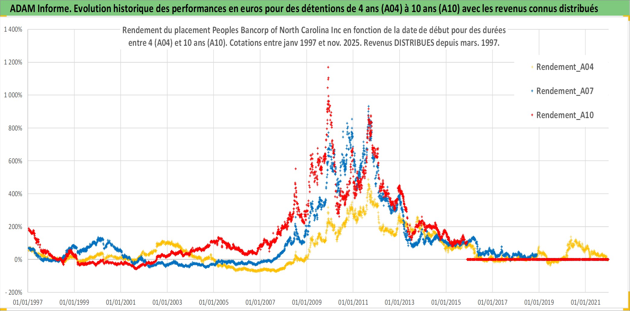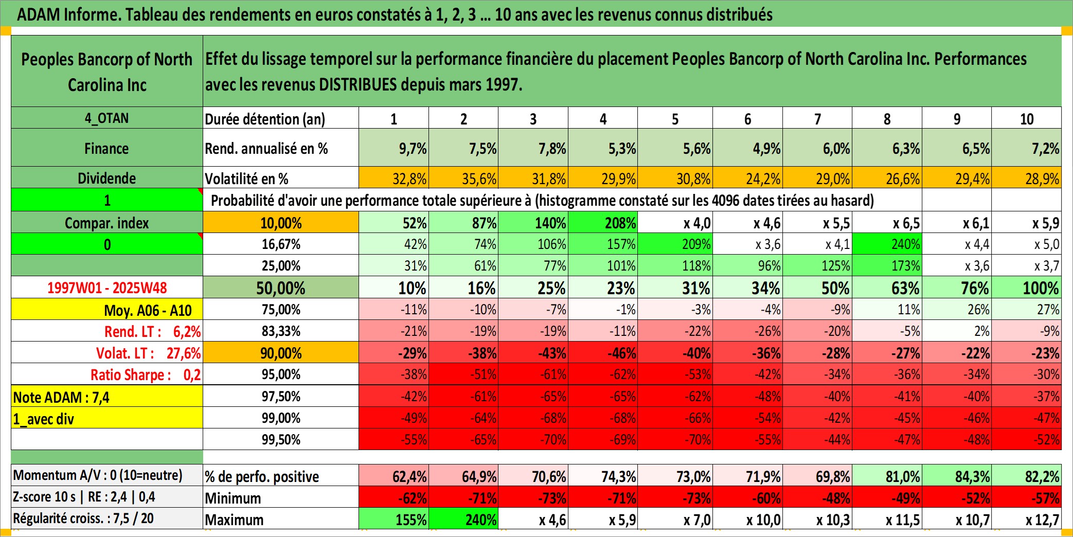 Site dédié aux investisseursPage dédiée sur site financeAnalyse des valorisations hebdomadaires de l'action Peoples Bancorp of North Carolina Inc. Cet actif est cote en USD. Les valorisations sont en contrevaleur EURO et couvrent les semaines 1997W01 a 2025W48. Les revenus de cet actif financier sont pris en compte depuis la semaine 1997W11. La note ESG de cet actif n'est pas connue.