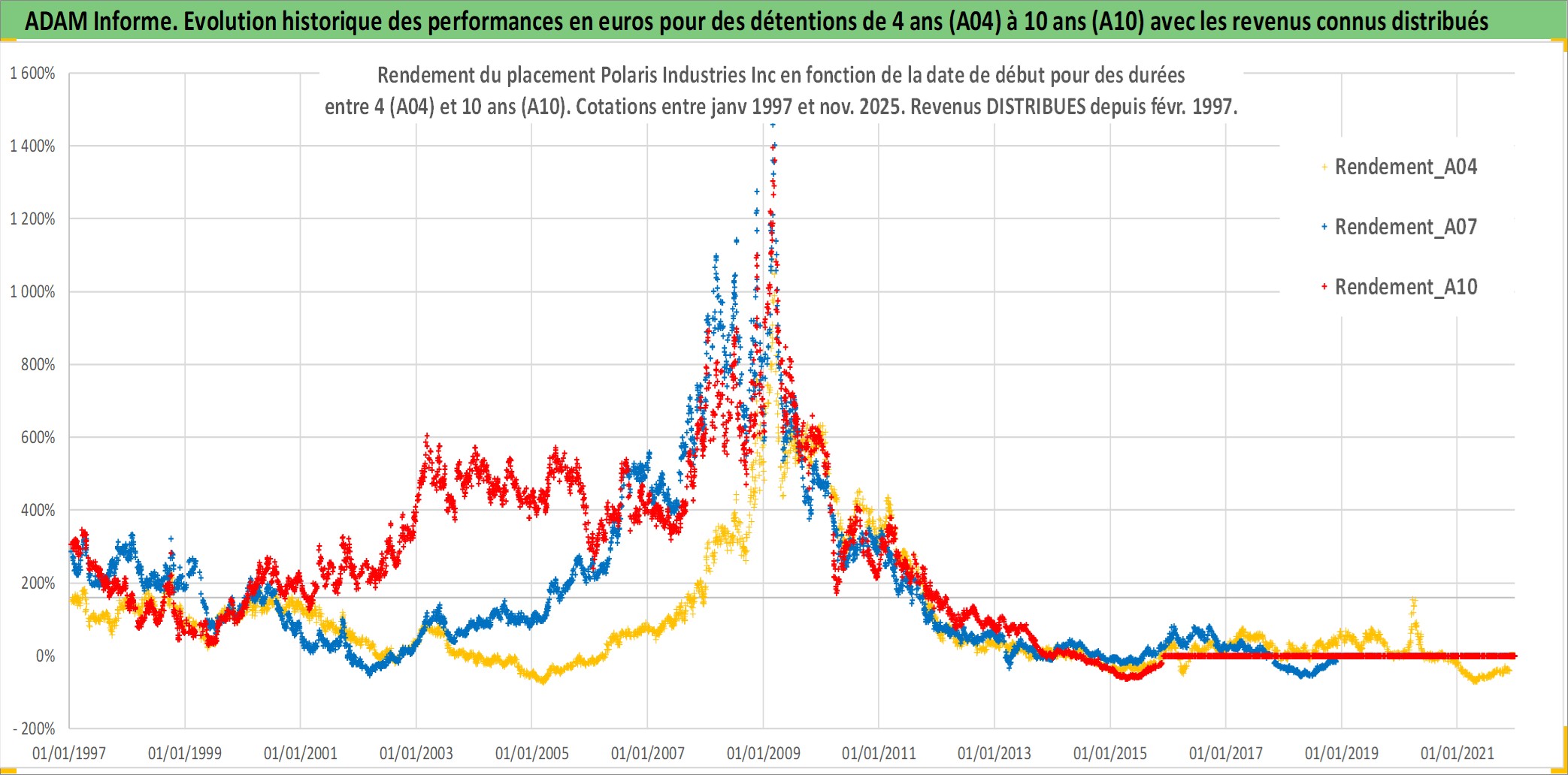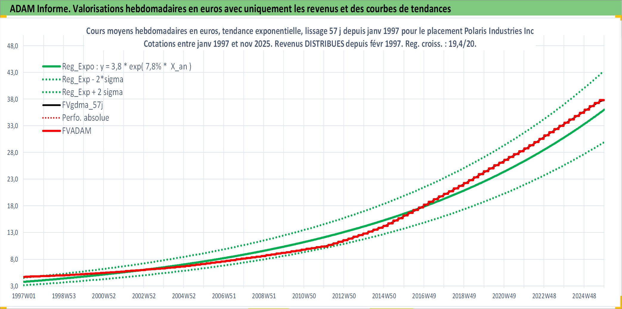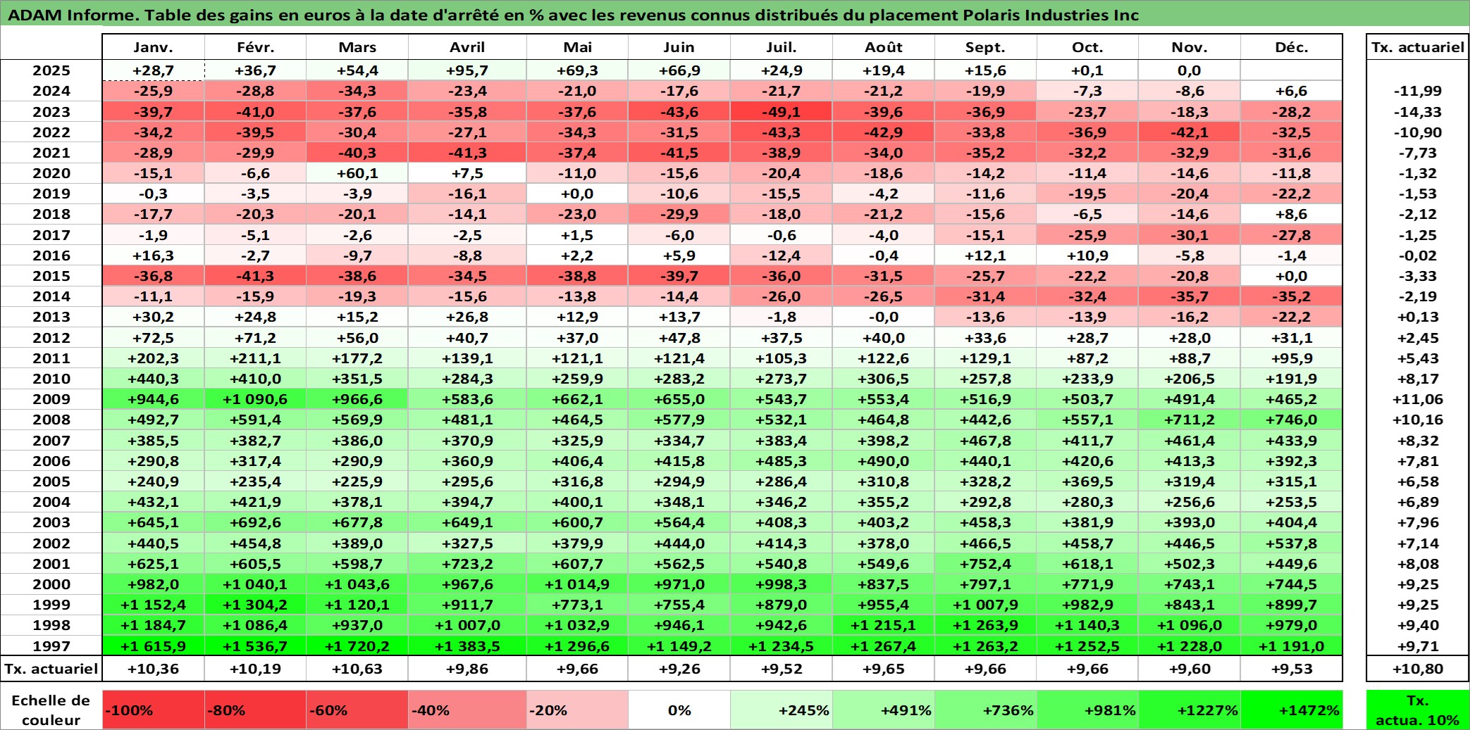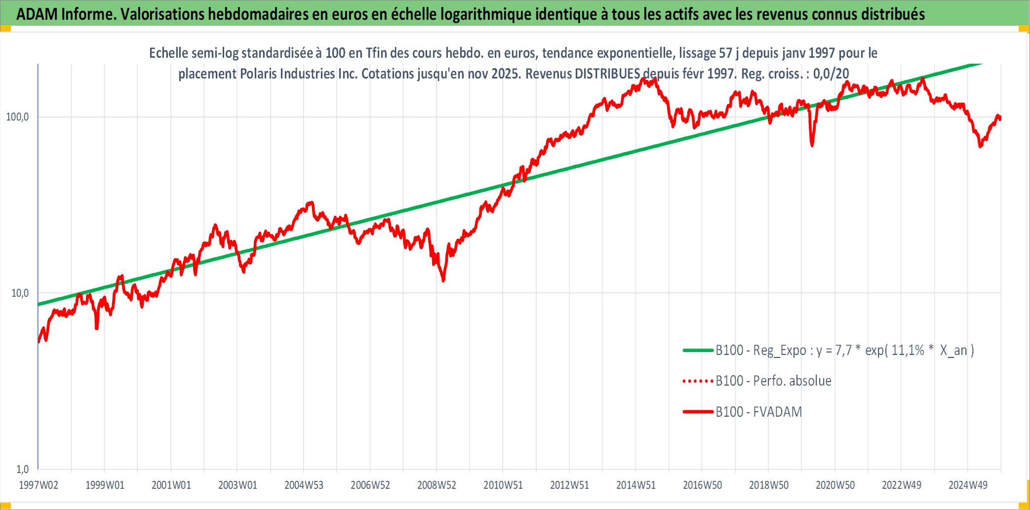 Site dédié aux investisseursPage dédiée sur site financeAnalyse des valorisations hebdomadaires de l'action Polaris Industries Inc. Cet actif est cote en USD. Les valorisations sont en contrevaleur EURO et couvrent les semaines 1997W01 a 2025W48. Les revenus de cet actif financier sont pris en compte depuis la semaine 1997W06. La note globale ESG de cet actif est estimee a 16.0 (apres rebasage entre 0 et 20).