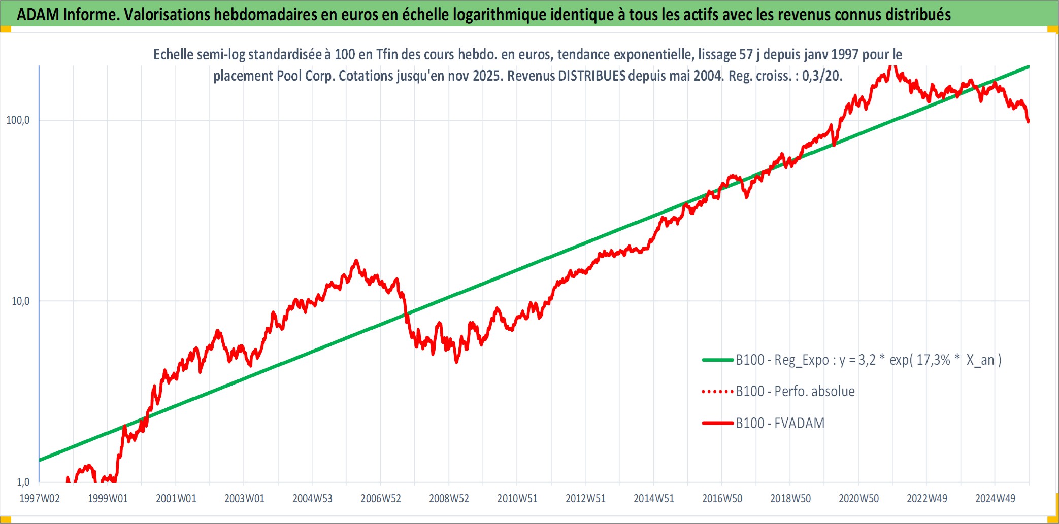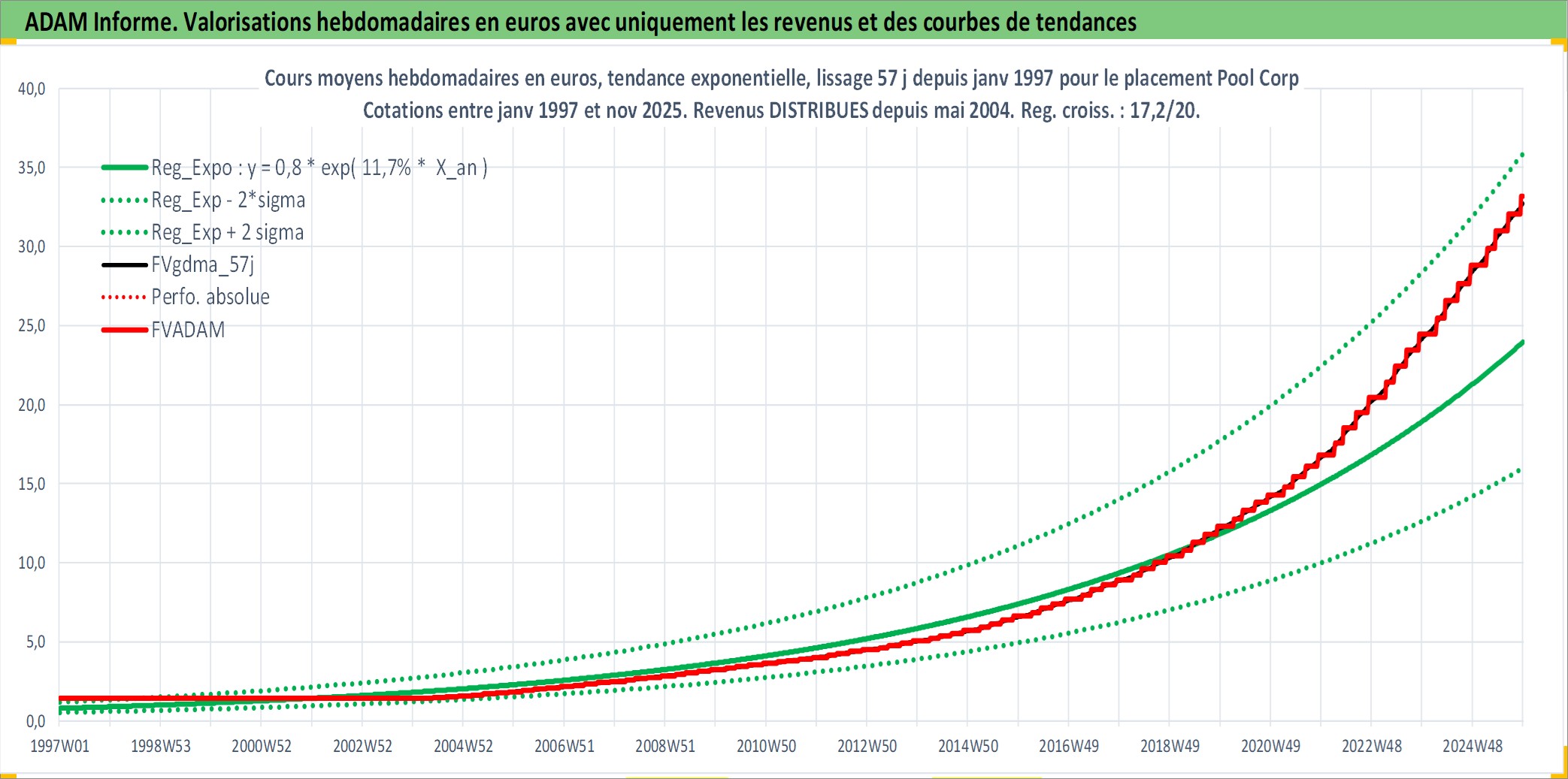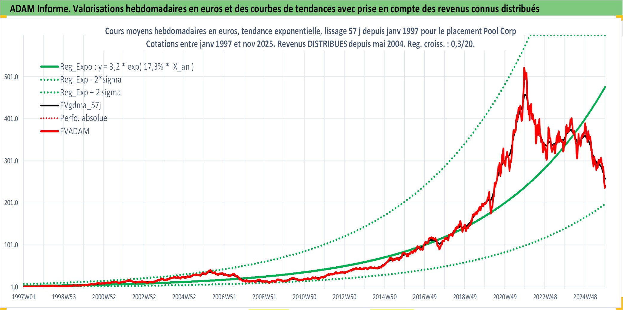 Site dédié aux investisseursPage dédiée sur site financeAnalyse des valorisations hebdomadaires de l'action Pool Corp. Cet actif est cote en USD. Les valorisations sont en contrevaleur EURO et couvrent les semaines 1997W01 a 2025W48. Les revenus de cet actif financier sont pris en compte depuis la semaine 2004W21. La note ESG de cet actif n'est pas connue.