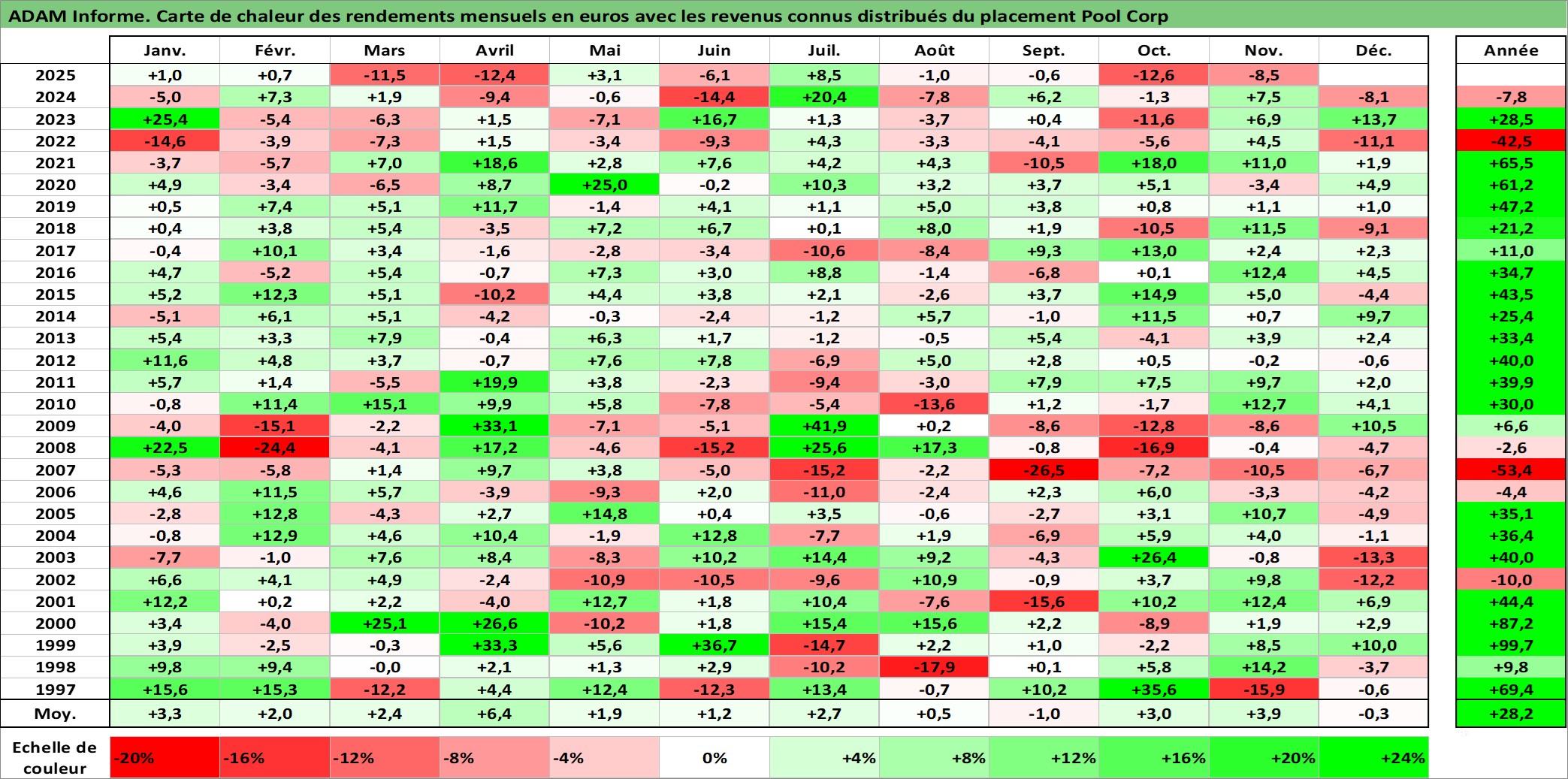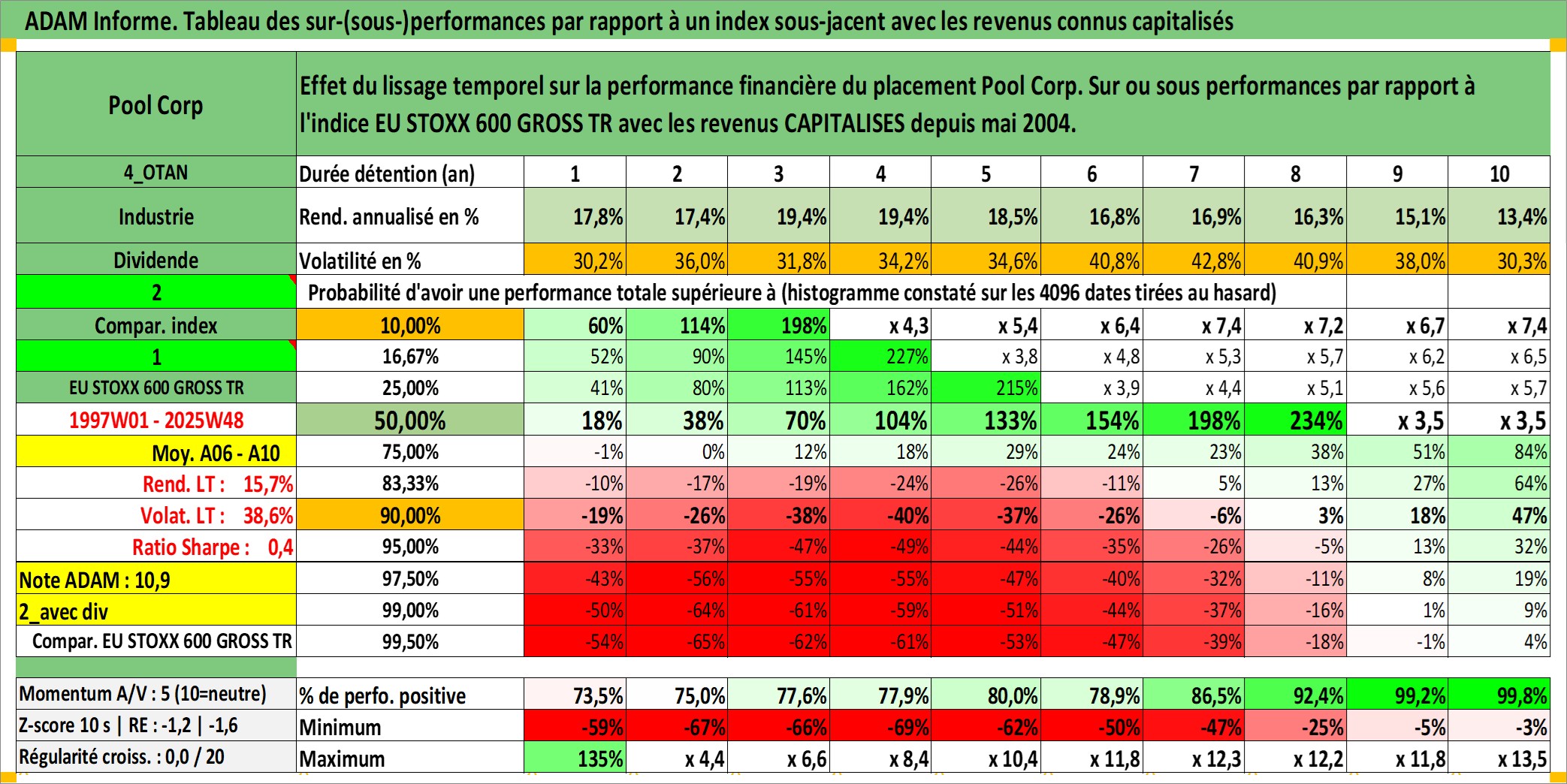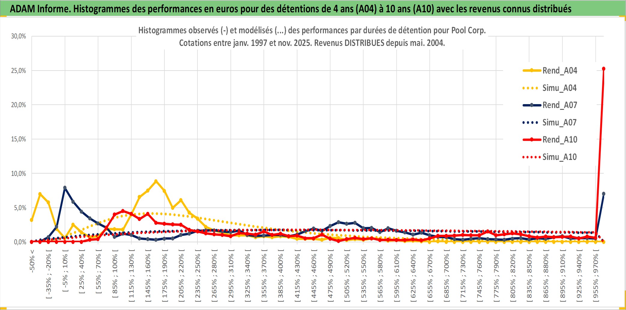 Site dédié aux investisseursPage dédiée sur site financeAnalyse des valorisations hebdomadaires de l'action Pool Corp. Cet actif est cote en USD. Les valorisations sont en contrevaleur EURO et couvrent les semaines 1997W01 a 2025W48. Les revenus de cet actif financier sont pris en compte depuis la semaine 2004W21. La note ESG de cet actif n'est pas connue.