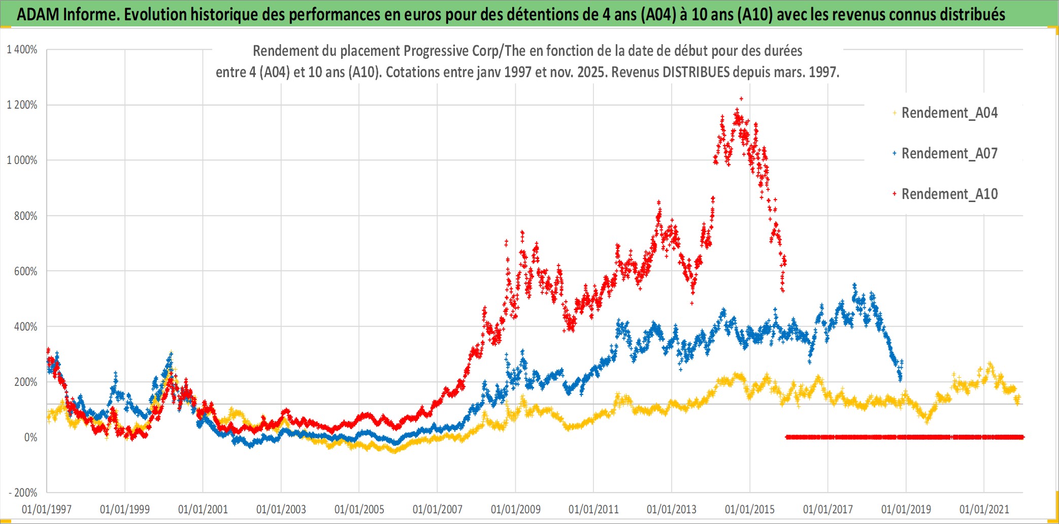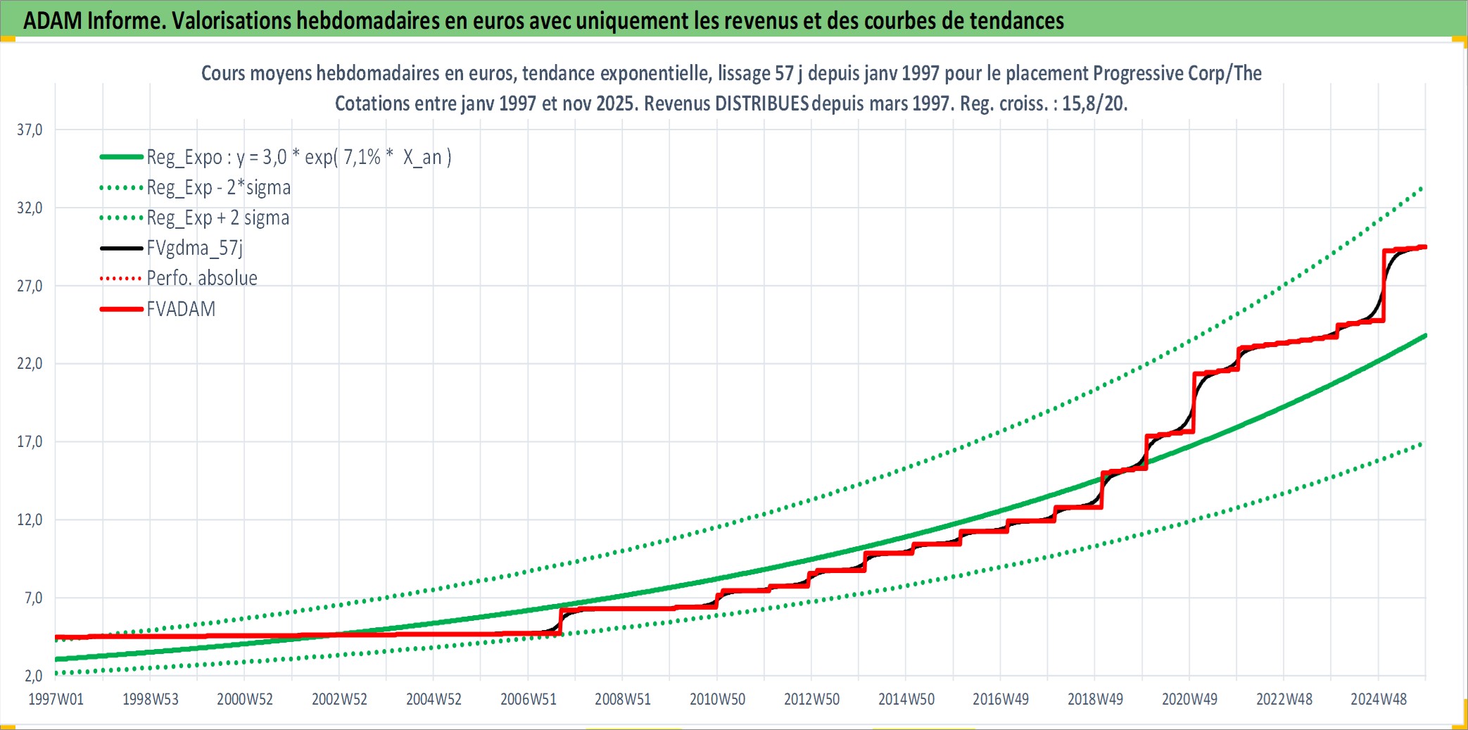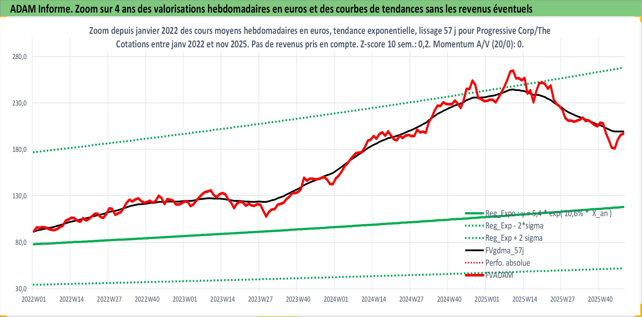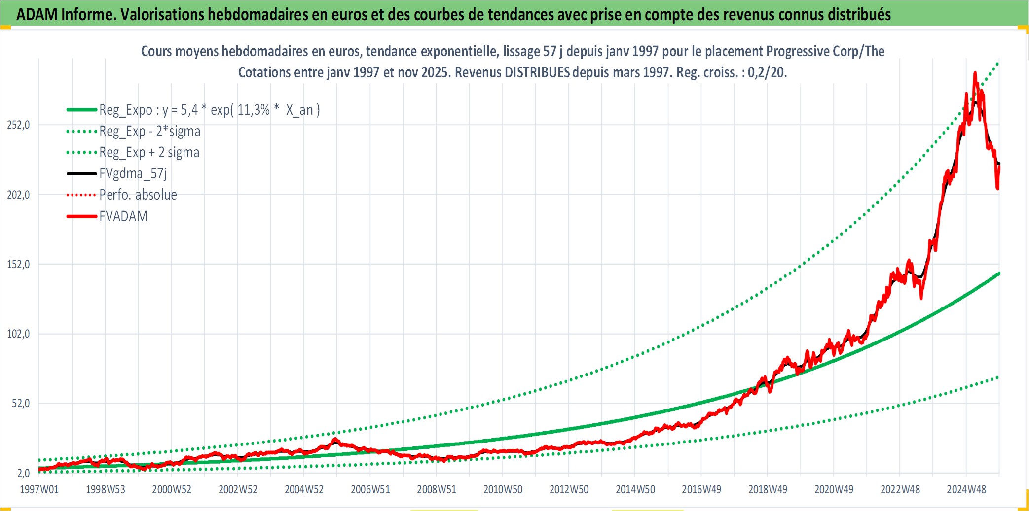 Site dédié aux investisseursPage dédiée sur site financeAnalyse des valorisations hebdomadaires de l'action Progressive Corp/The. Cet actif est cote en USD. Les valorisations sont en contrevaleur EURO et couvrent les semaines 1997W01 a 2025W48. Les revenus de cet actif financier sont pris en compte depuis la semaine 1997W11. La note globale ESG de cet actif est estimee a 10.0 (apres rebasage entre 0 et 20).