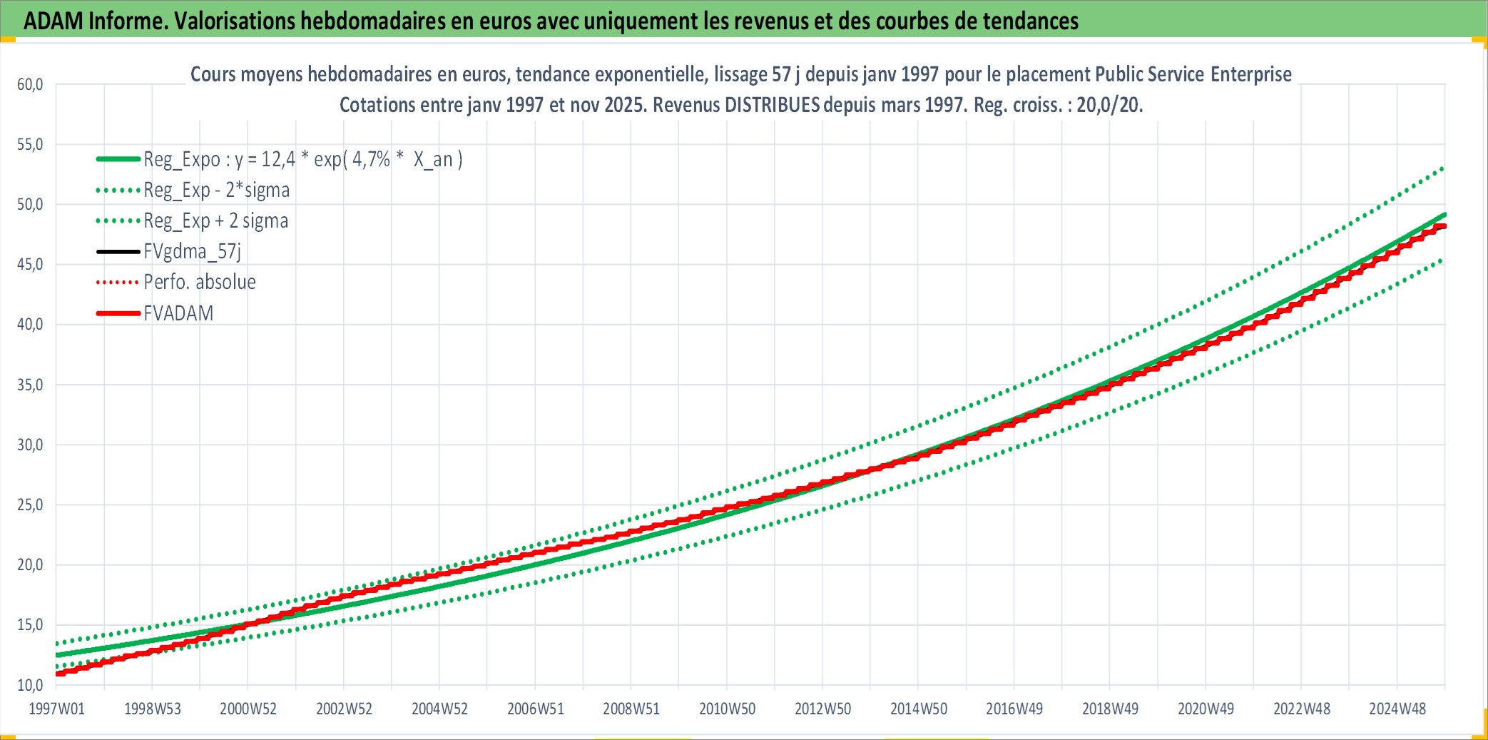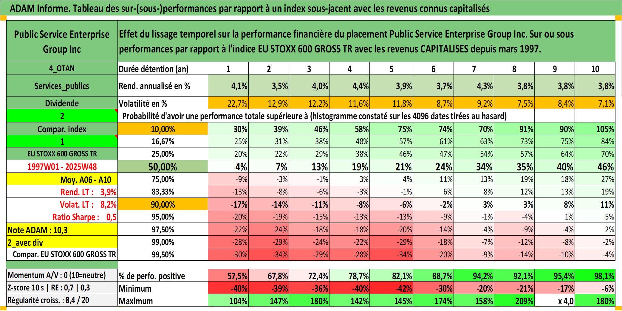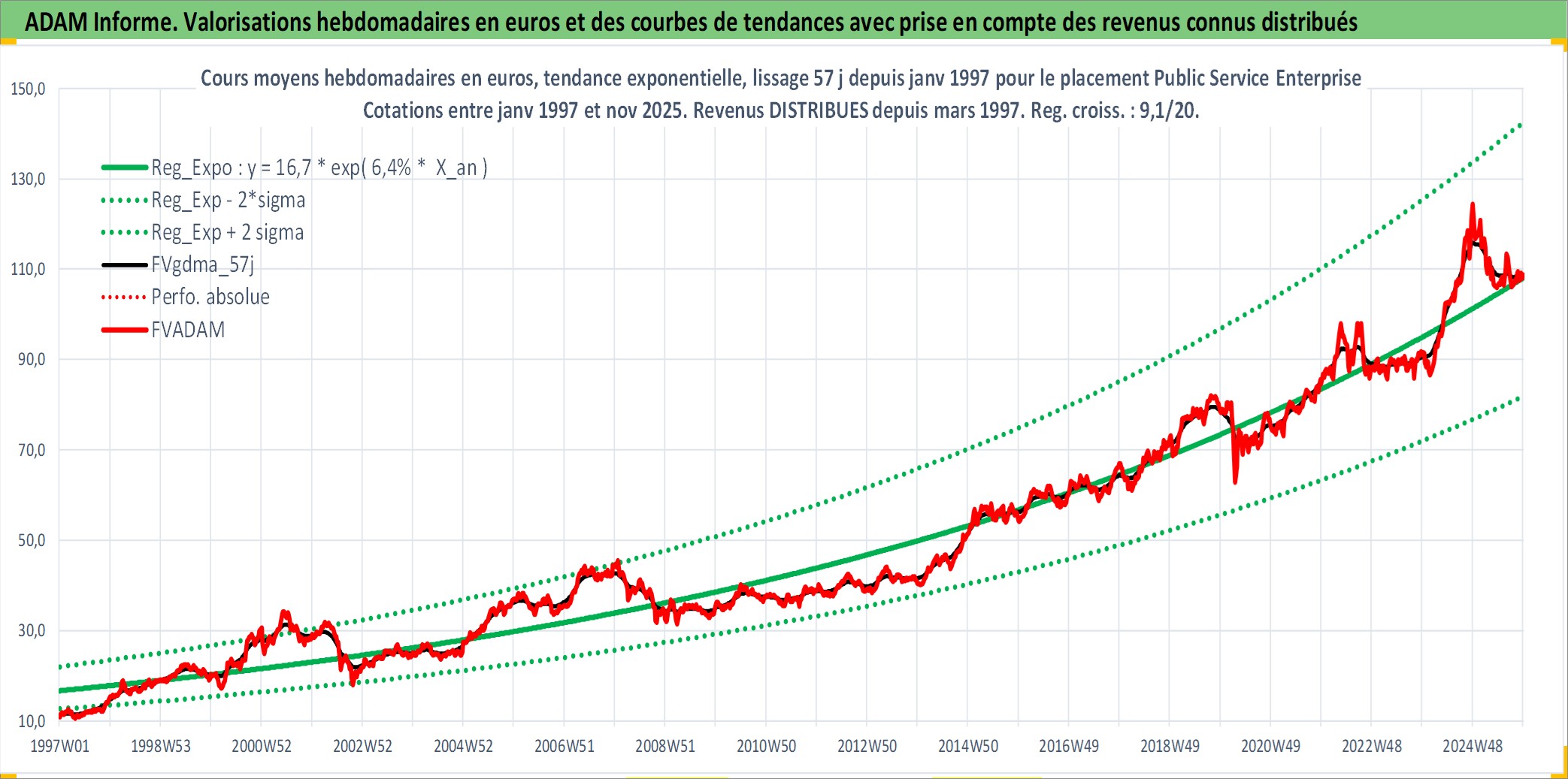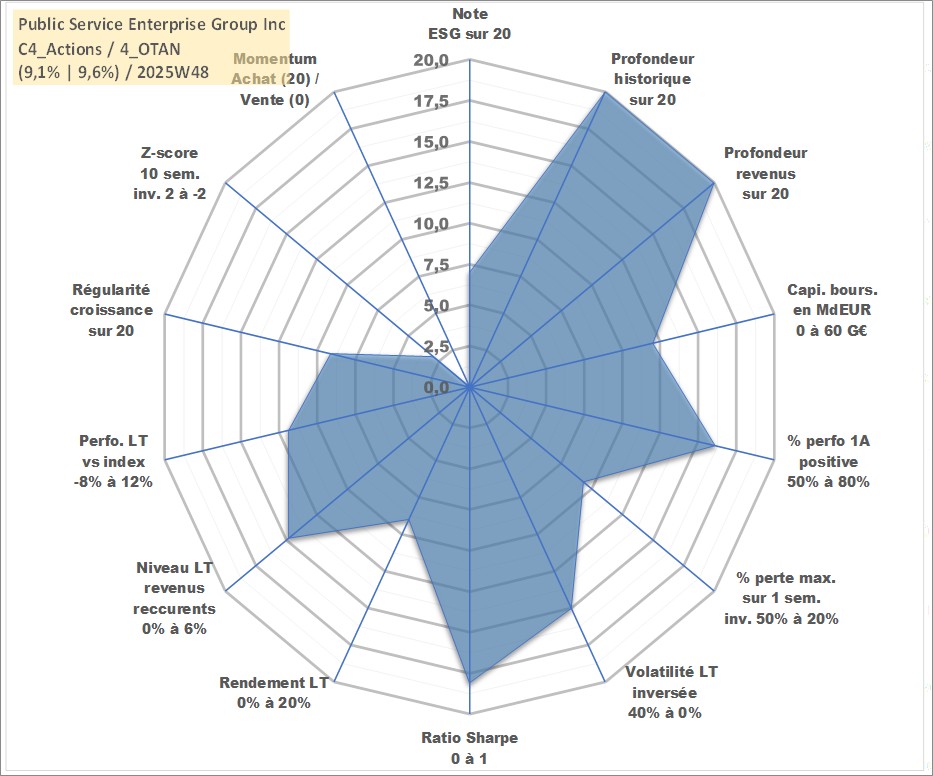 Site dédié aux investisseursPage dédiée sur site financeAnalyse des valorisations hebdomadaires de l'action Public Service Enterprise Group Inc. Cet actif est cote en USD. Les valorisations sont en contrevaleur EURO et couvrent les semaines 1997W01 a 2025W48. Les revenus de cet actif financier sont pris en compte depuis la semaine 1997W10. La note globale ESG de cet actif est estimee a 7.0 (apres rebasage entre 0 et 20).
