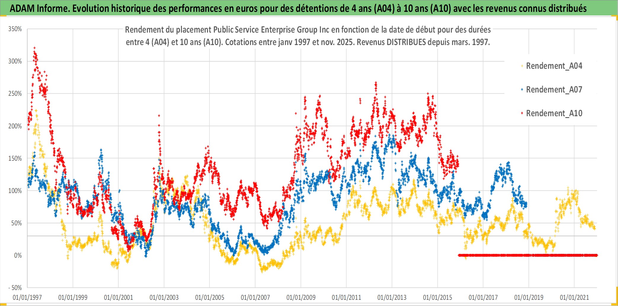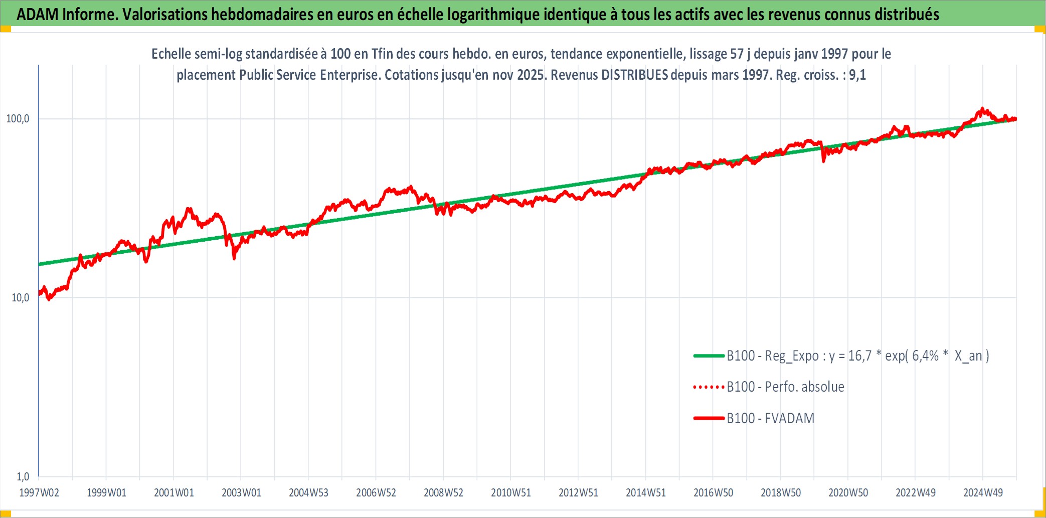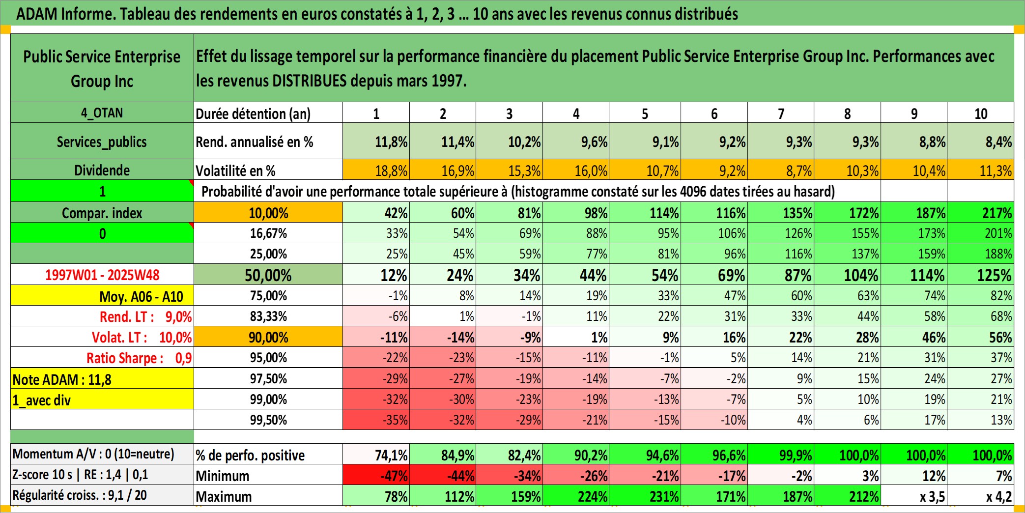 Site dédié aux investisseursPage dédiée sur site financeAnalyse des valorisations hebdomadaires de l'action Public Service Enterprise Group Inc. Cet actif est cote en USD. Les valorisations sont en contrevaleur EURO et couvrent les semaines 1997W01 a 2025W48. Les revenus de cet actif financier sont pris en compte depuis la semaine 1997W10. La note globale ESG de cet actif est estimee a 7.0 (apres rebasage entre 0 et 20).