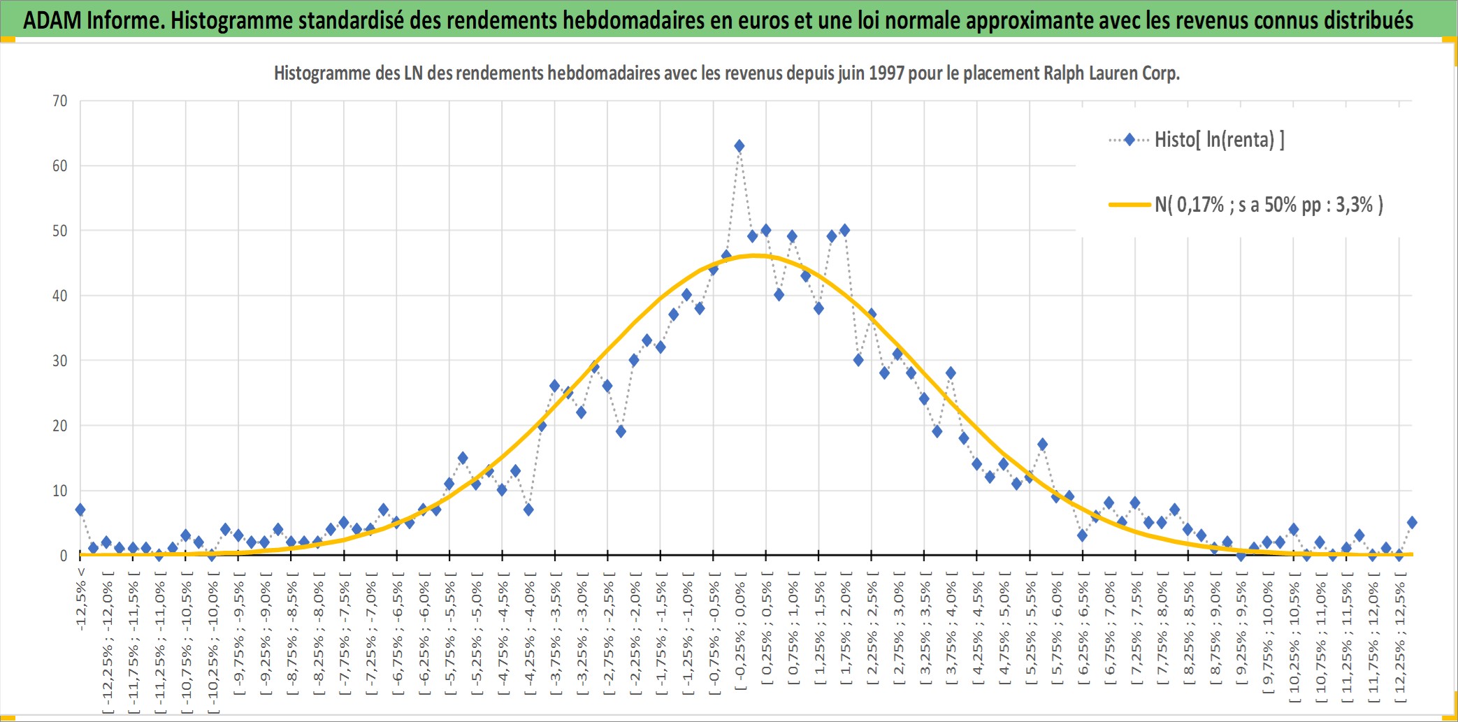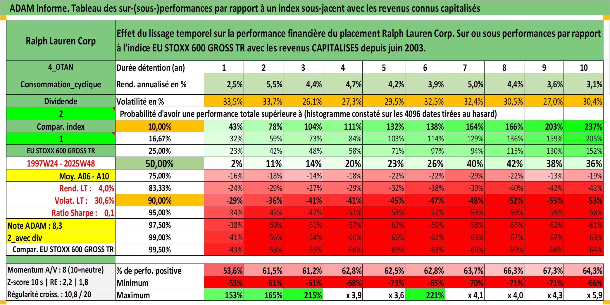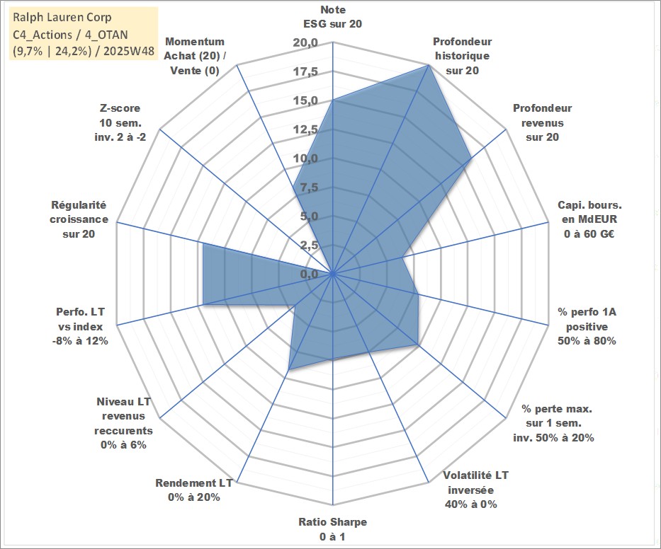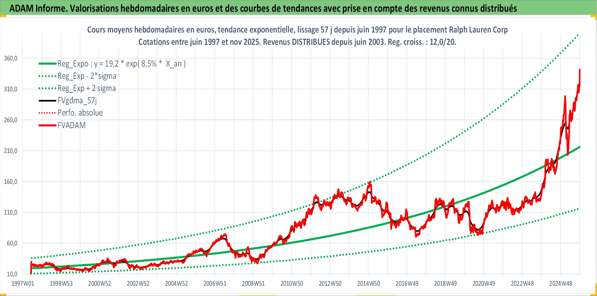 Site dédié aux investisseursPage dédiée sur site financeAnalyse des valorisations hebdomadaires de l'action Ralph Lauren Corp. Cet actif est cote en USD. Les valorisations sont en contrevaleur EURO et couvrent les semaines 1997W24 a 2025W48. Les revenus de cet actif financier sont pris en compte depuis la semaine 2003W26. La note globale ESG de cet actif est estimee a 15.0 (apres rebasage entre 0 et 20).