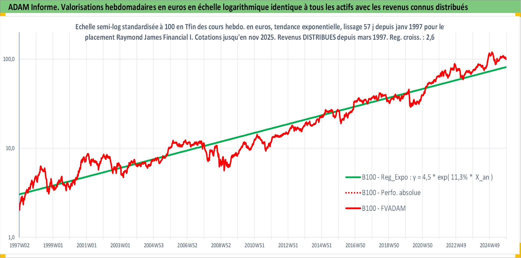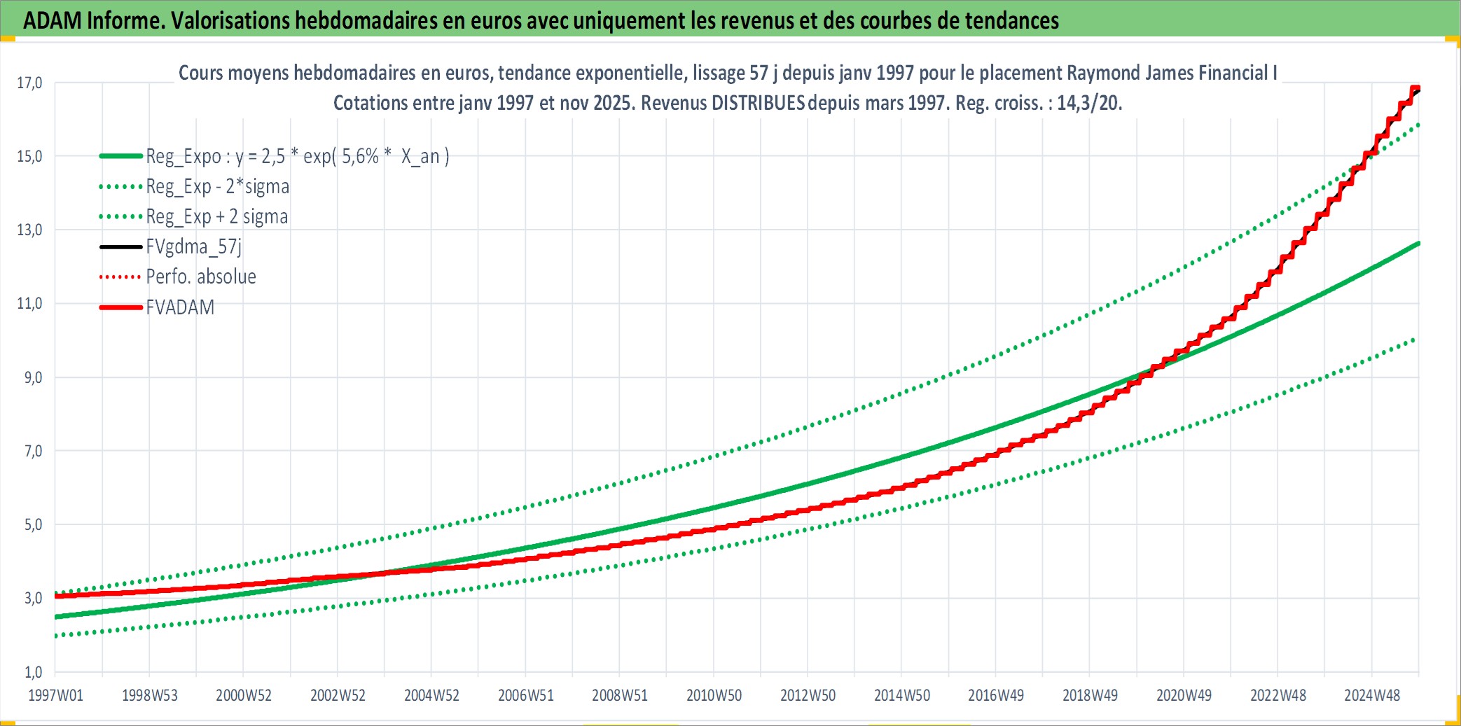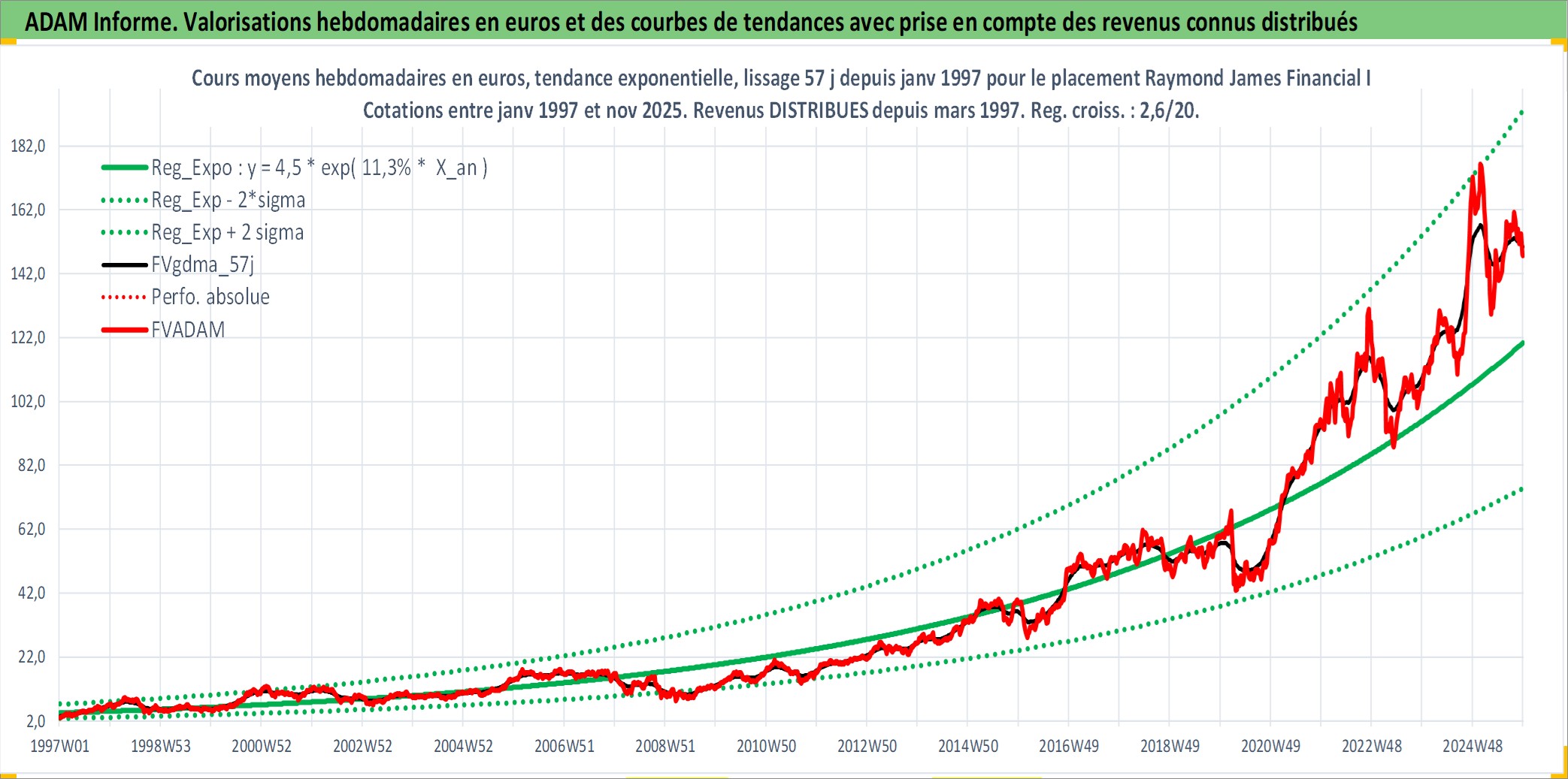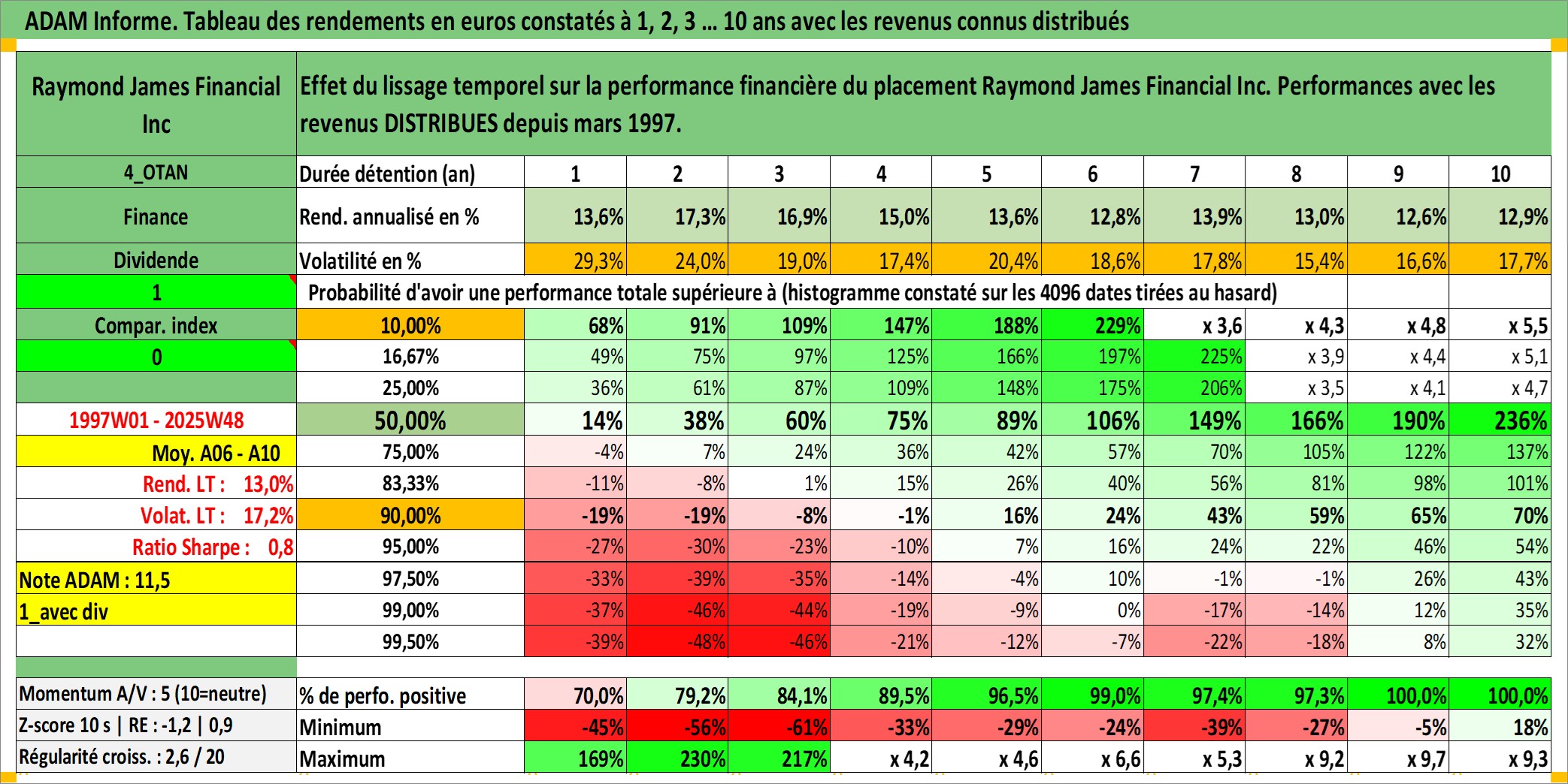 Site dédié aux investisseursPage dédiée sur site financeAnalyse des valorisations hebdomadaires de l'action Raymond James Financial Inc. Cet actif est cote en USD. Les valorisations sont en contrevaleur EURO et couvrent les semaines 1997W01 a 2025W48. Les revenus de cet actif financier sont pris en compte depuis la semaine 1997W10. La note globale ESG de cet actif est estimee a 8.0 (apres rebasage entre 0 et 20).