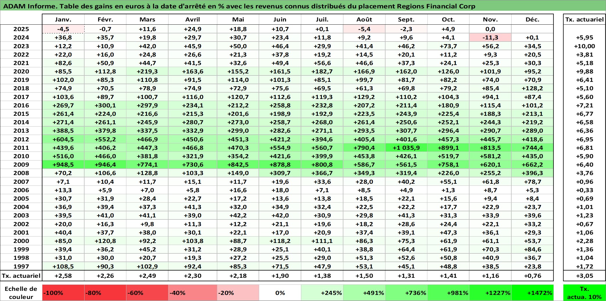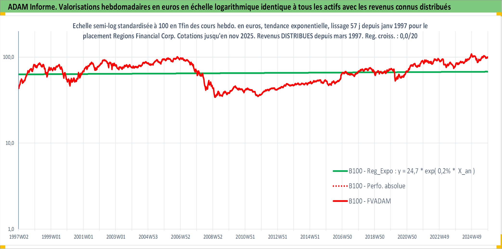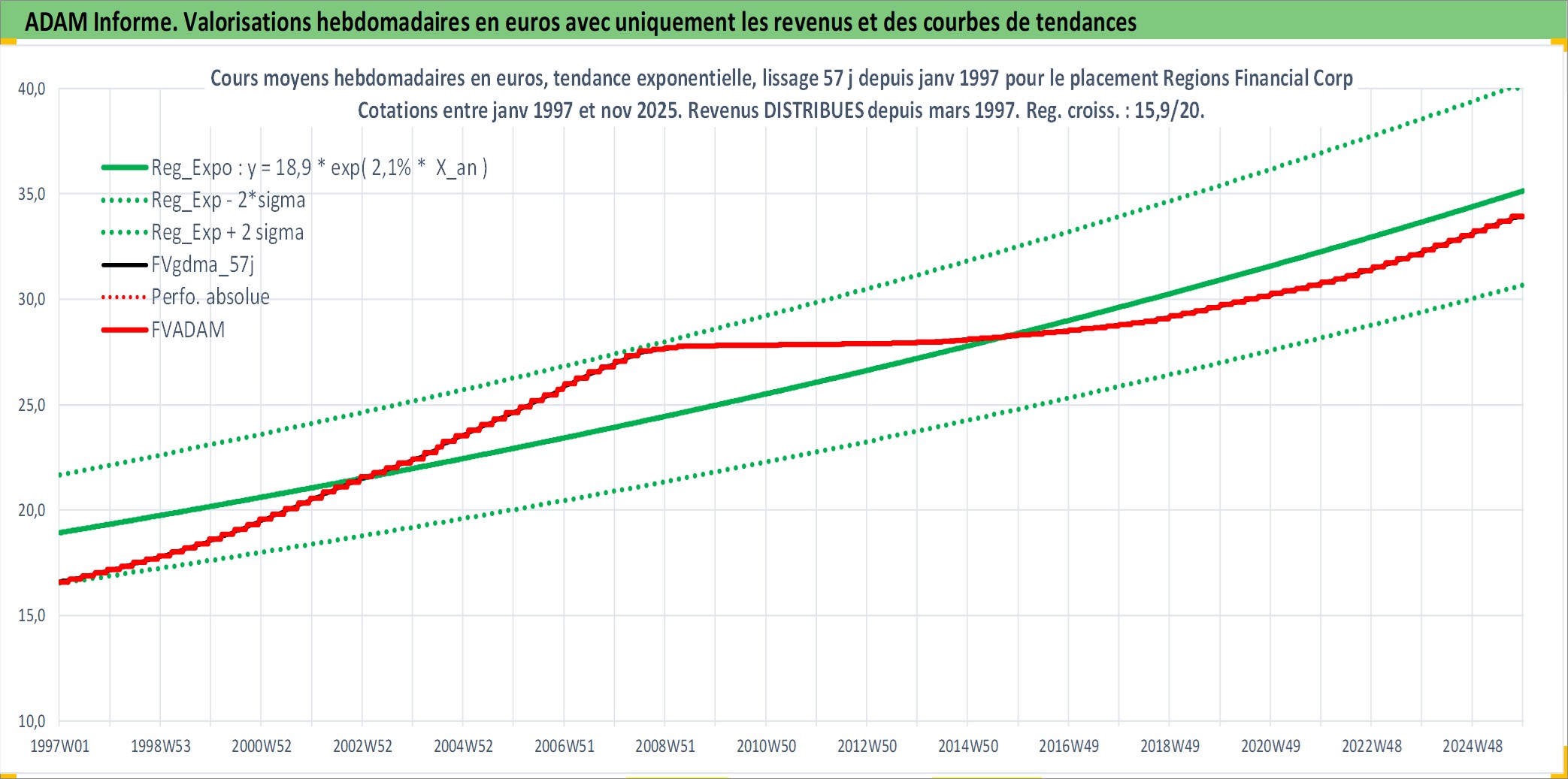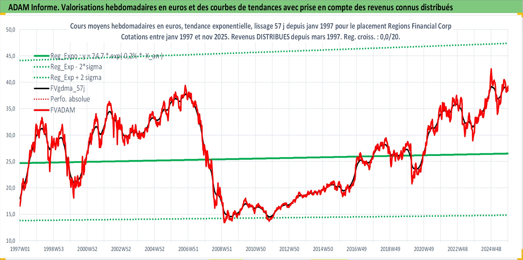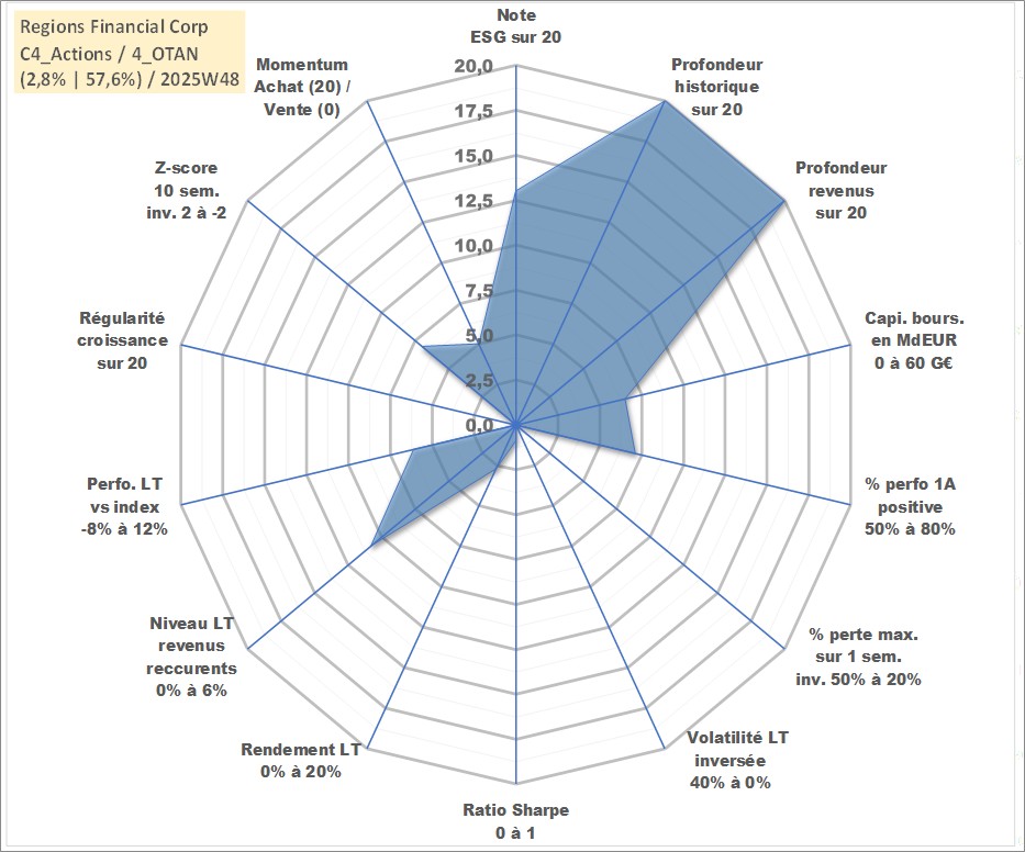 Site dédié aux investisseursPage dédiée sur site financeAnalyse des valorisations hebdomadaires de l'action Regions Financial Corp. Cet actif est cote en USD. Les valorisations sont en contrevaleur EURO et couvrent les semaines 1997W01 a 2025W48. Les revenus de cet actif financier sont pris en compte depuis la semaine 1997W11. La note globale ESG de cet actif est estimee a 13.0 (apres rebasage entre 0 et 20).