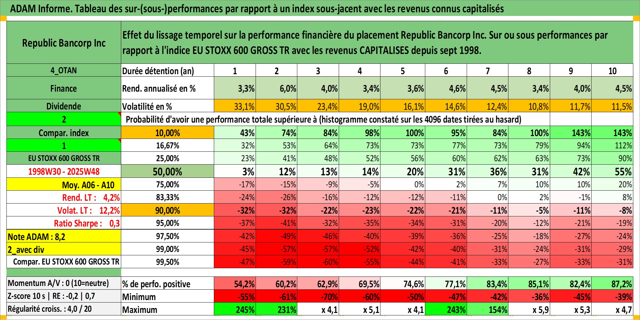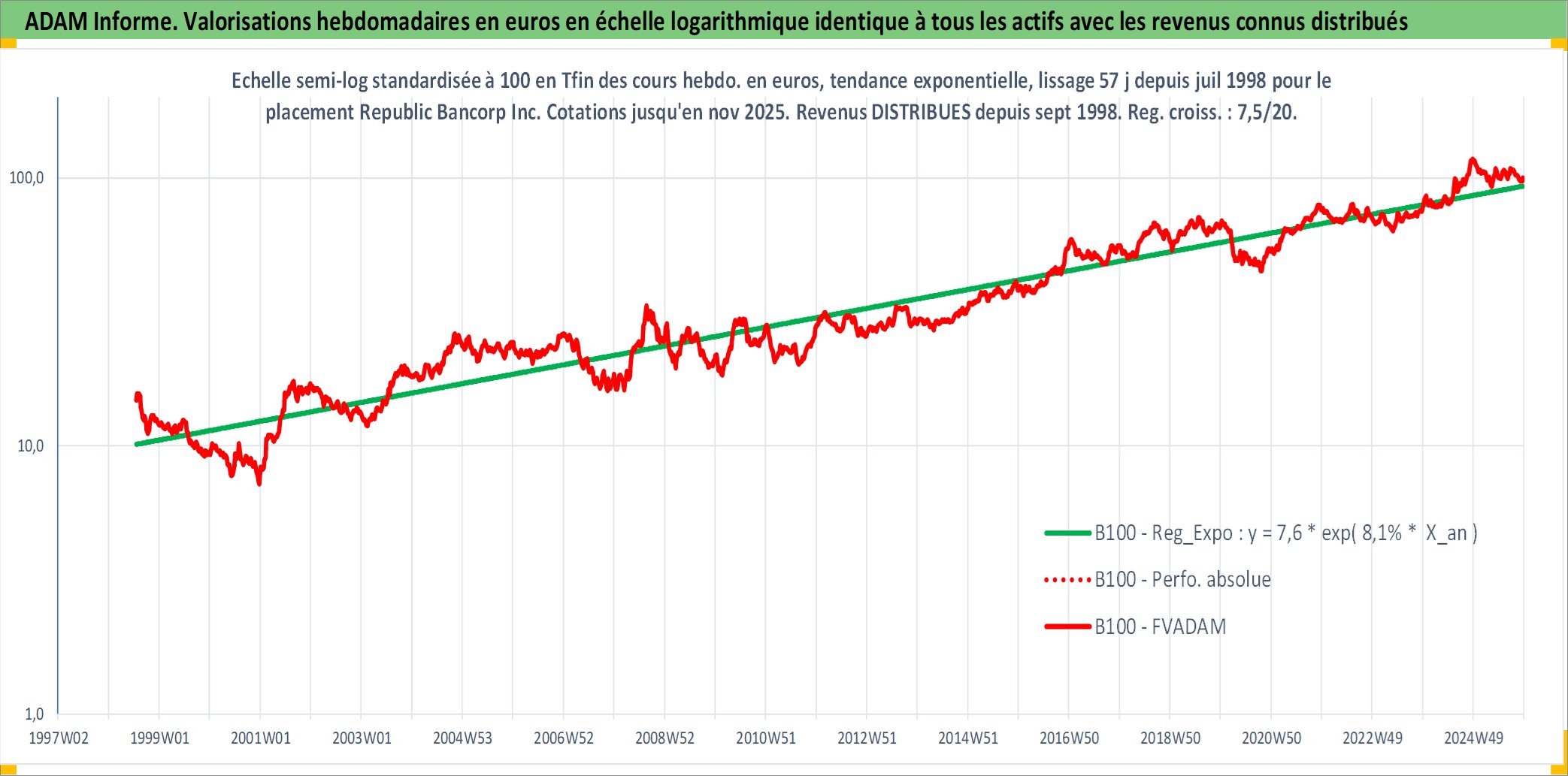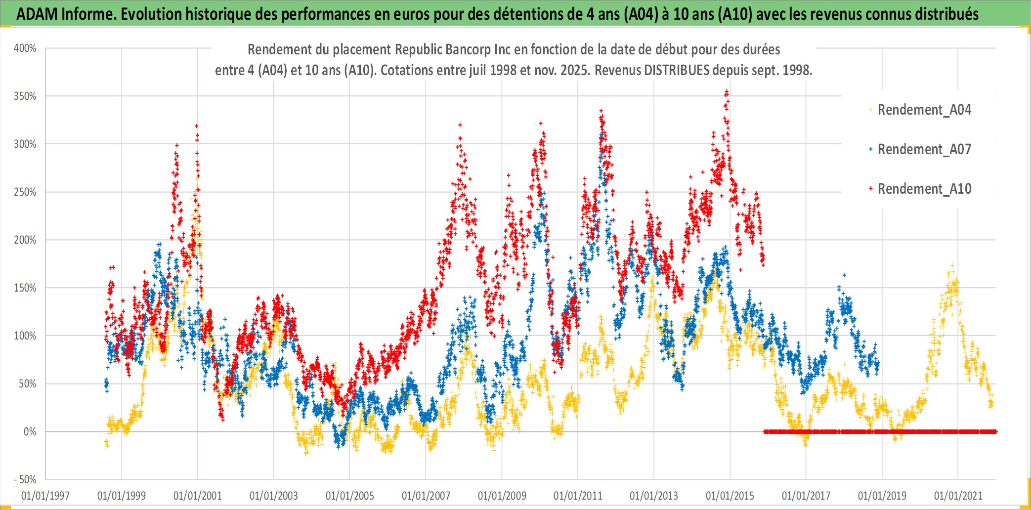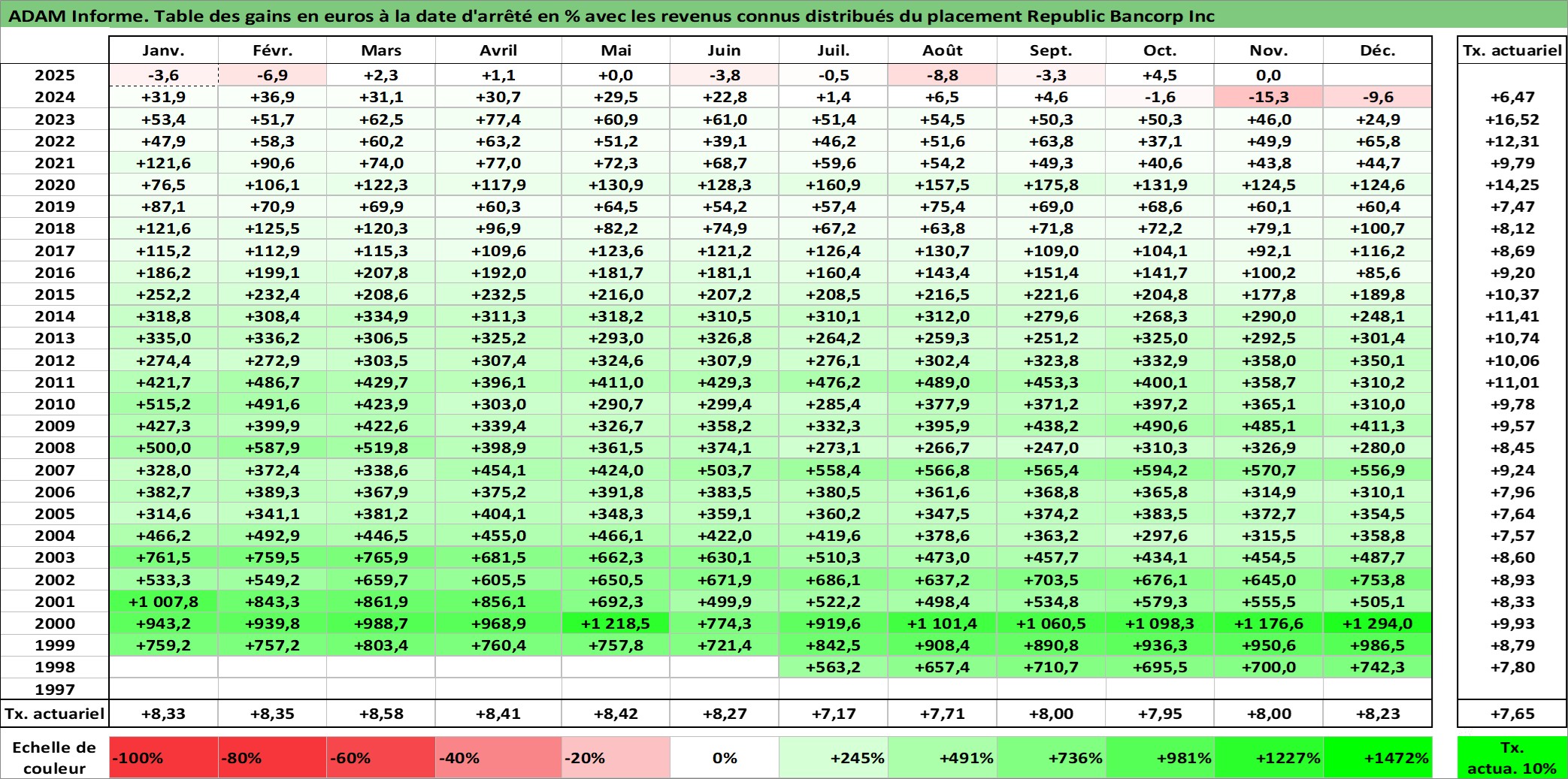 Site dédié aux investisseursPage dédiée sur site financeAnalyse des valorisations hebdomadaires de l'action Republic Bancorp Inc. Cet actif est cote en USD. Les valorisations sont en contrevaleur EURO et couvrent les semaines 1998W30 a 2025W48. Les revenus de cet actif financier sont pris en compte depuis la semaine 1998W38. La note ESG de cet actif n'est pas connue.