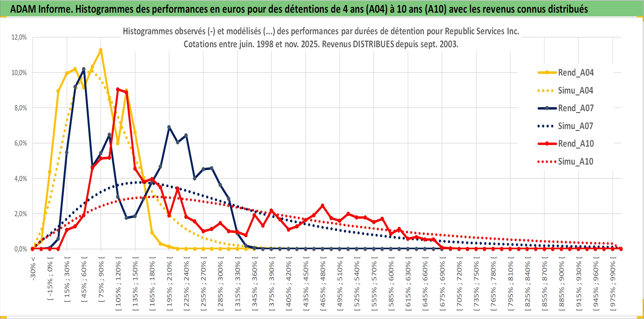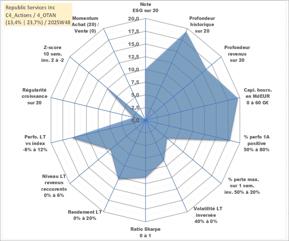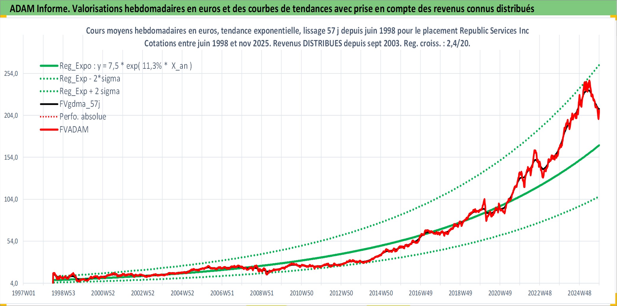 Site dédié aux investisseursPage dédiée sur site financeAnalyse des valorisations hebdomadaires de l'action Republic Services Inc. Cet actif est cote en USD. Les valorisations sont en contrevaleur EURO et couvrent les semaines 1998W27 a 2025W48. Les revenus de cet actif financier sont pris en compte depuis la semaine 2003W39. La note globale ESG de cet actif est estimee a 10.0 (apres rebasage entre 0 et 20).