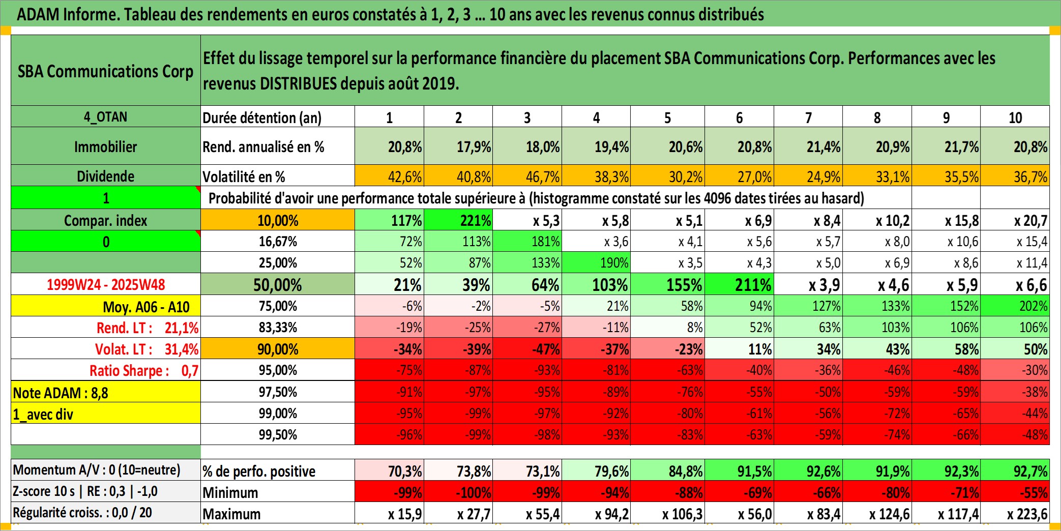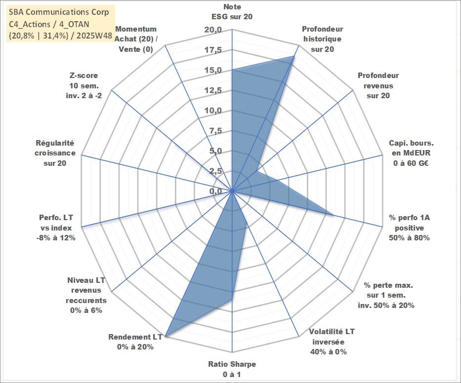 Site dédié aux investisseursPage dédiée sur site financeAnalyse des valorisations hebdomadaires de l'action SBA Communications Corp. Cet actif est cote en USD. Les valorisations sont en contrevaleur EURO et couvrent les semaines 1999W24 a 2025W48. Les revenus de cet actif financier sont pris en compte depuis la semaine 2019W35. La note globale ESG de cet actif est estimee a 15.0 (apres rebasage entre 0 et 20).