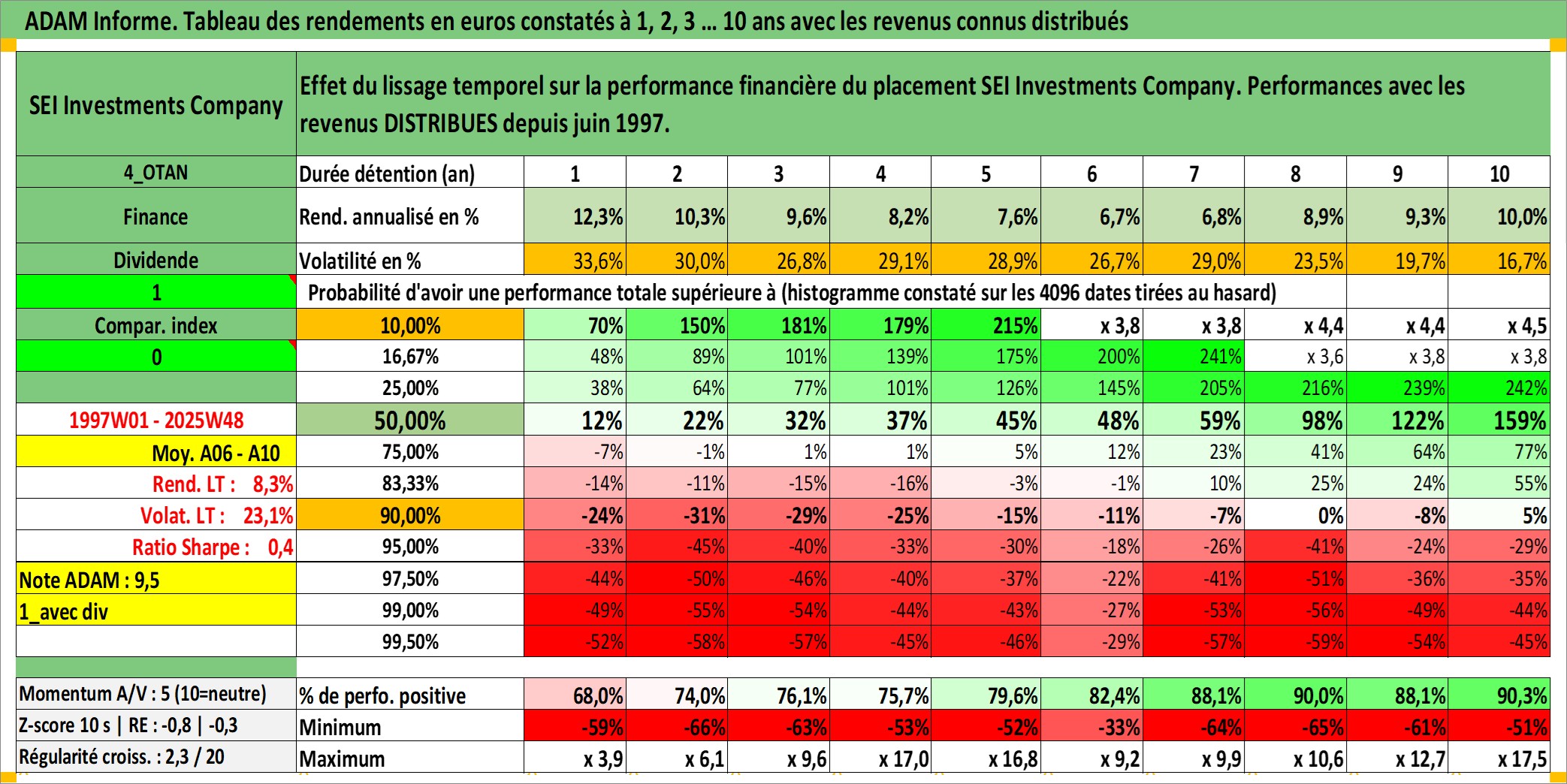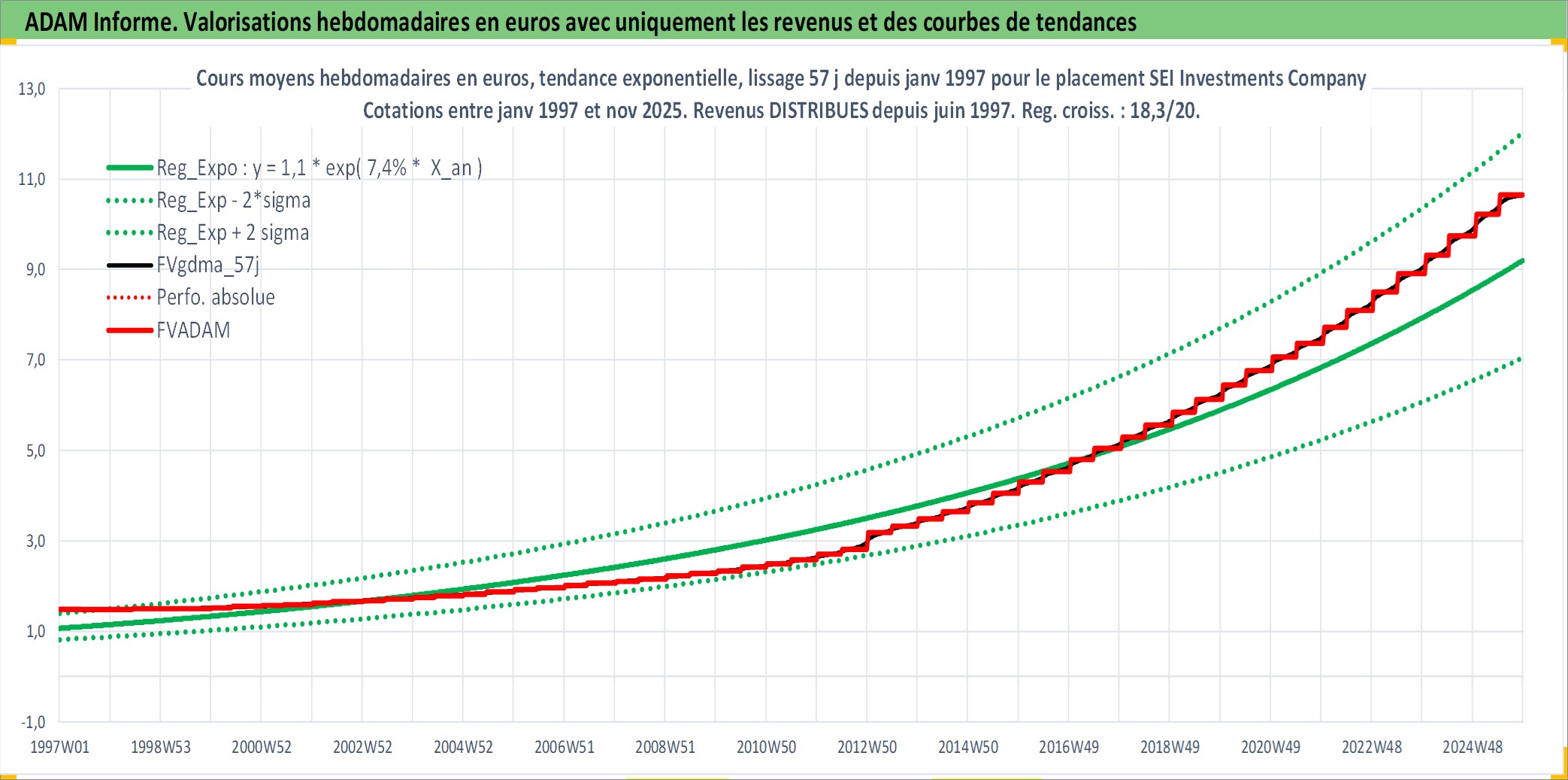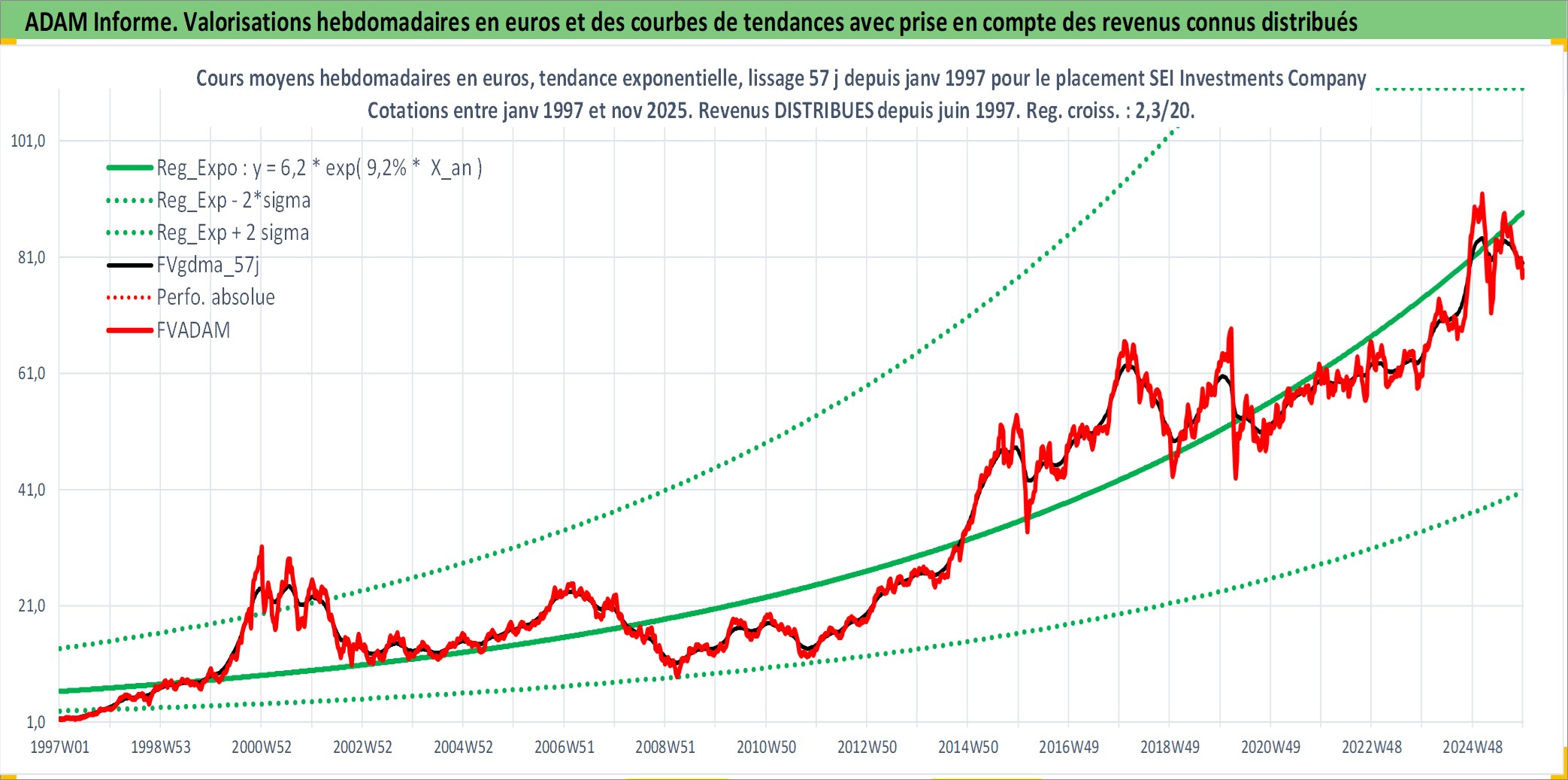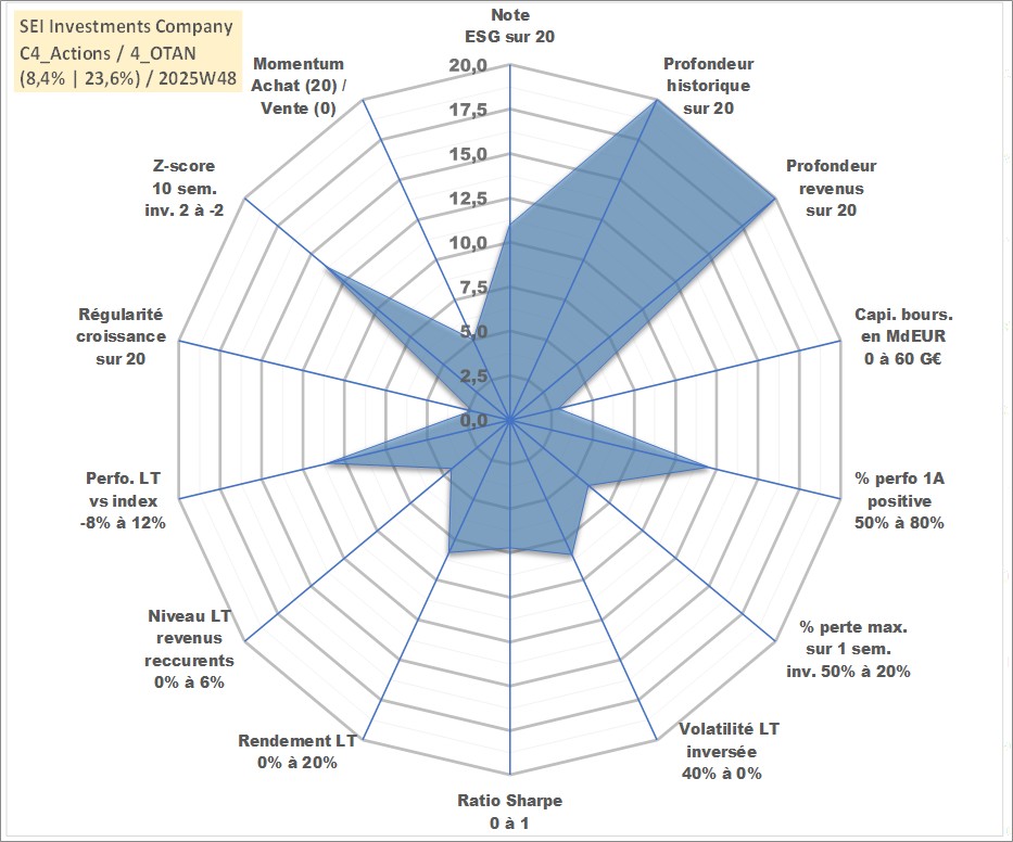 Site dédié aux investisseursPage dédiée sur site financeAnalyse des valorisations hebdomadaires de l'action SEI Investments Company. Cet actif est cote en USD. Les valorisations sont en contrevaleur EURO et couvrent les semaines 1997W01 a 2025W48. Les revenus de cet actif financier sont pris en compte depuis la semaine 1997W24. La note globale ESG de cet actif est estimee a 11.0 (apres rebasage entre 0 et 20).