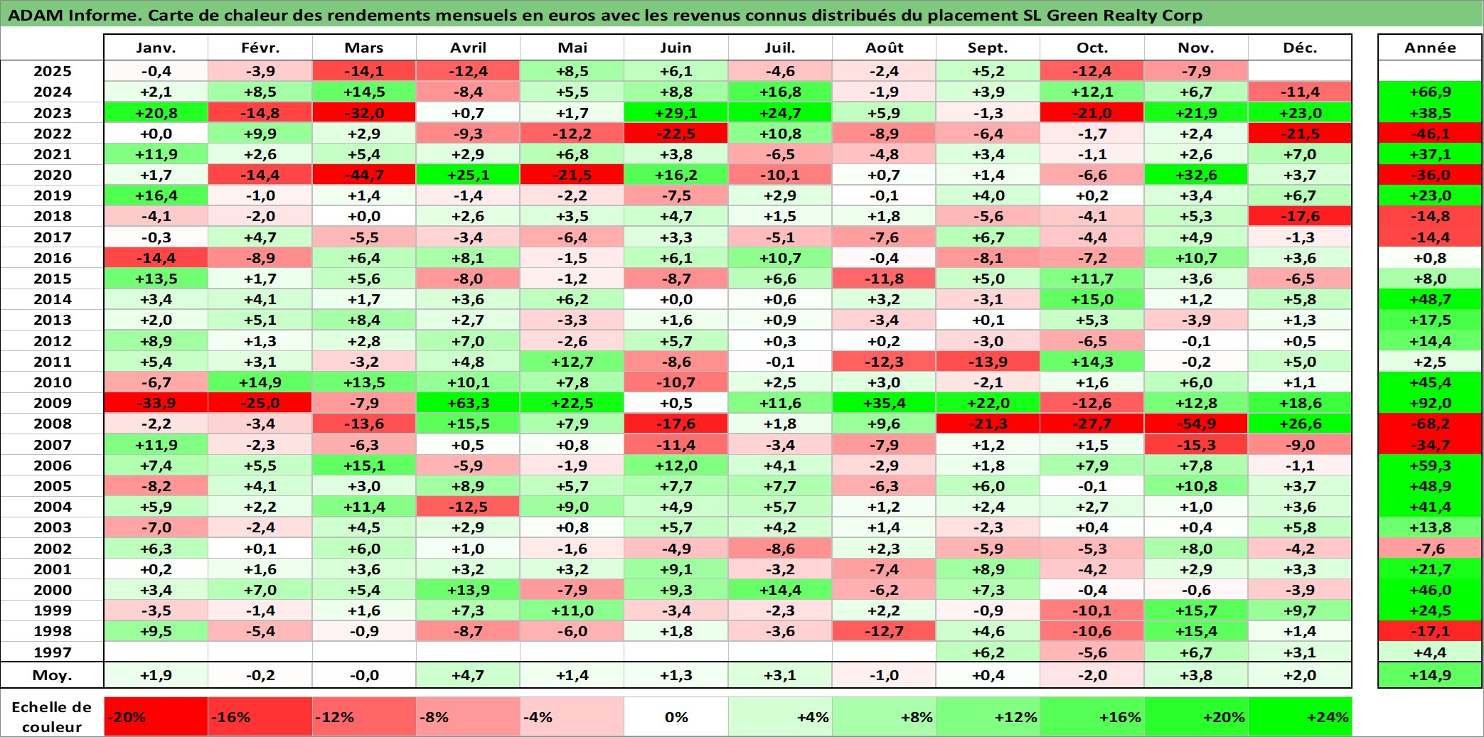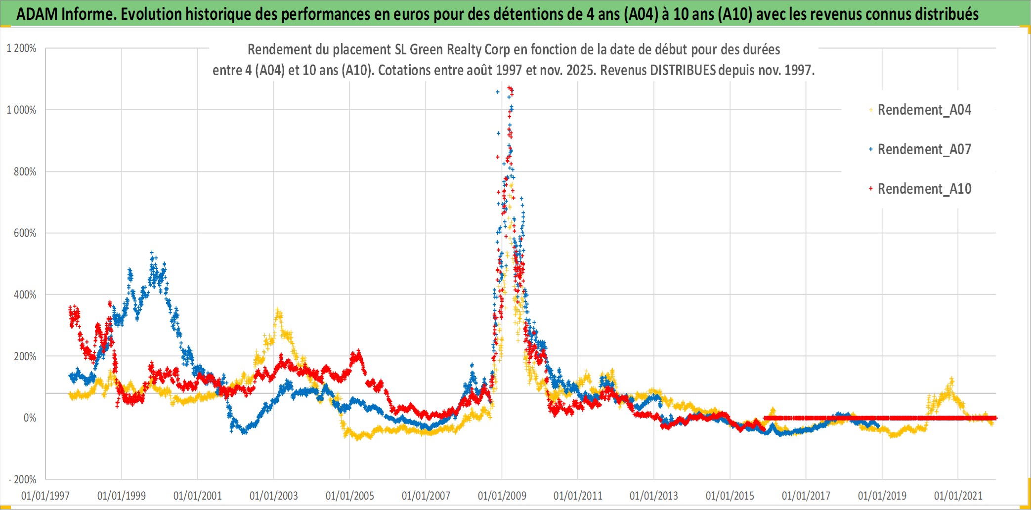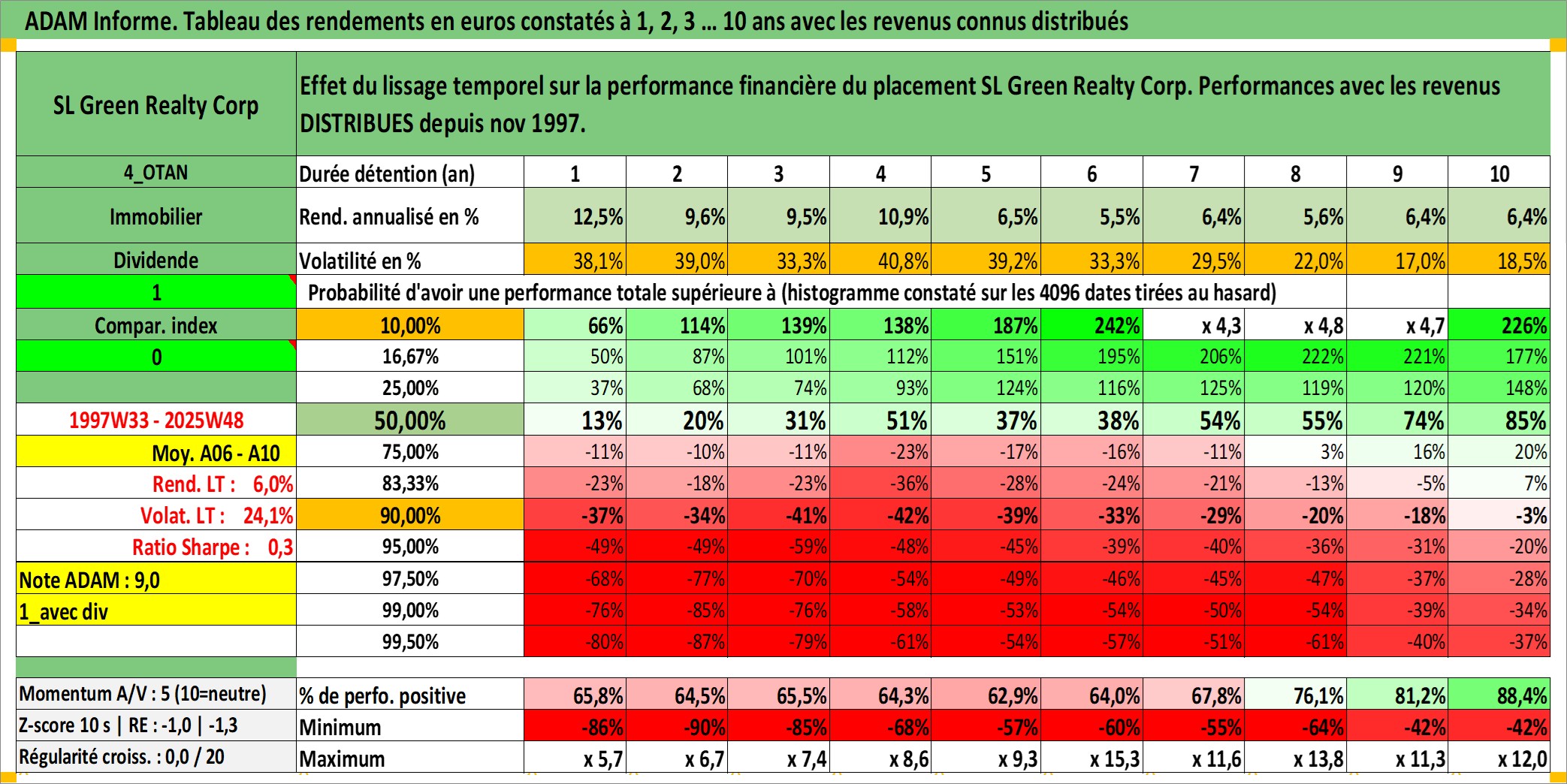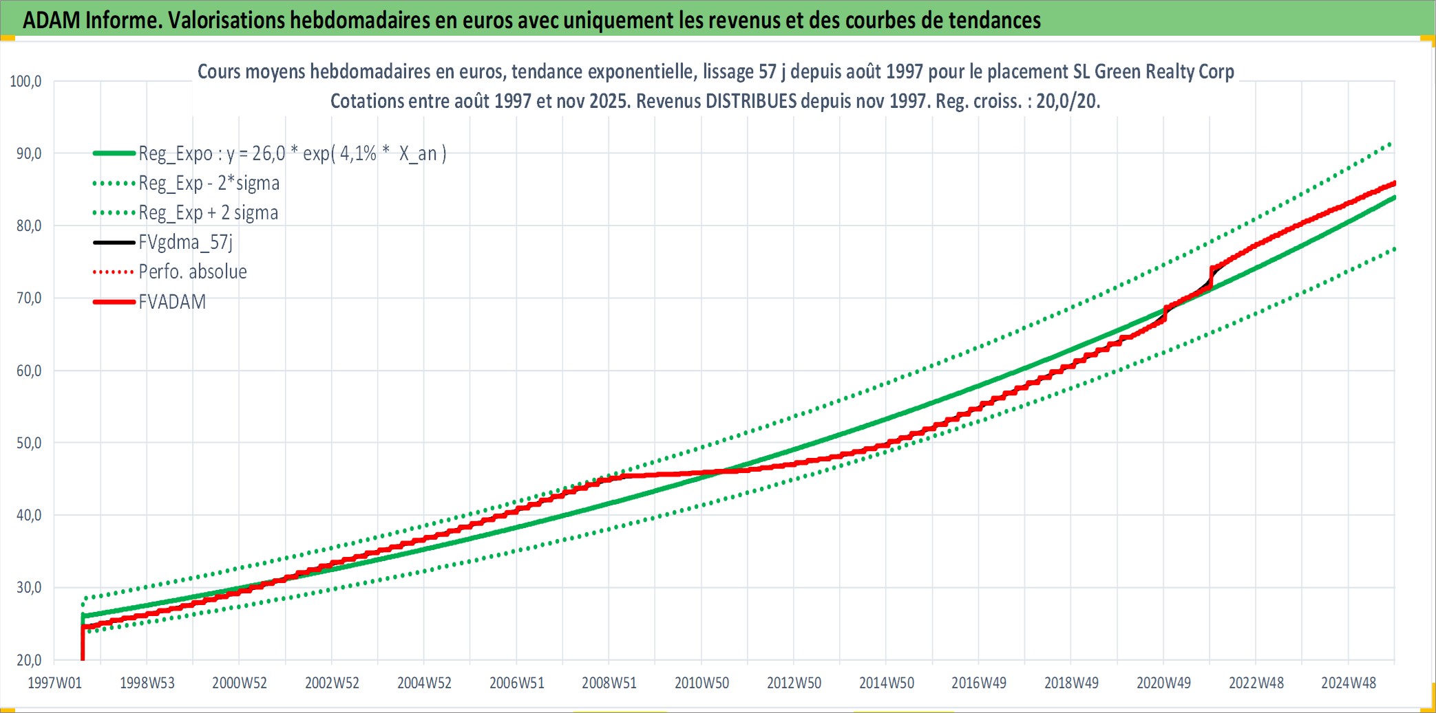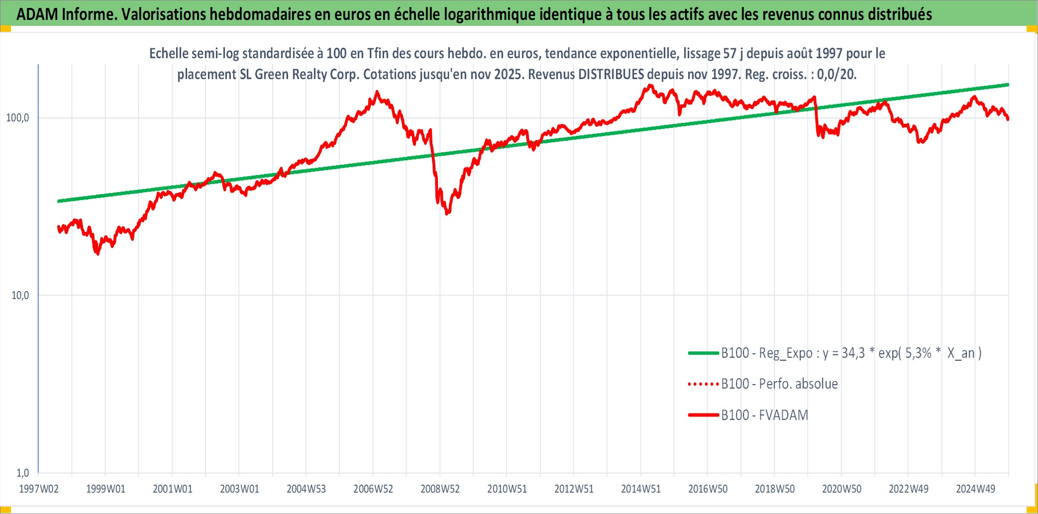 Site dédié aux investisseursPage dédiée sur site financeAnalyse des valorisations hebdomadaires de l'action SL Green Realty Corp. Cet actif est cote en USD. Les valorisations sont en contrevaleur EURO et couvrent les semaines 1997W33 a 2025W48. Les revenus de cet actif financier sont pris en compte depuis la semaine 1997W46. La note globale ESG de cet actif est estimee a 15.0 (apres rebasage entre 0 et 20).