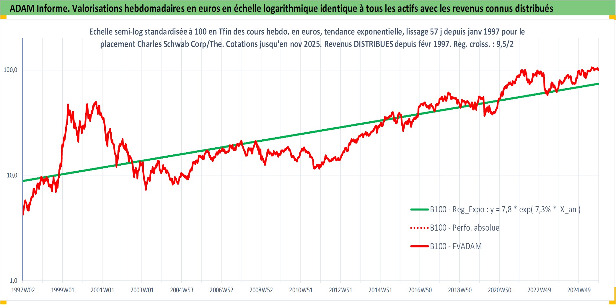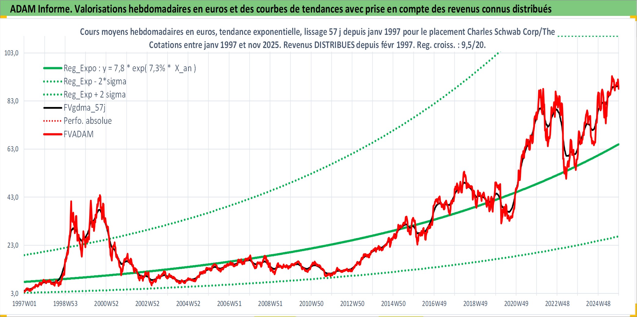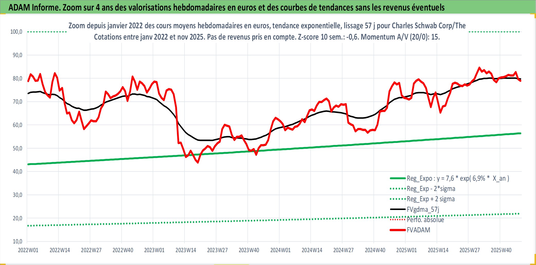 Site dédié aux investisseursPage dédiée sur site financeAnalyse des valorisations hebdomadaires de l'action Charles Schwab Corp/The. Cet actif est cote en USD. Les valorisations sont en contrevaleur EURO et couvrent les semaines 1997W01 a 2025W48. Les revenus de cet actif financier sont pris en compte depuis la semaine 1997W07. La note globale ESG de cet actif est estimee a 8.0 (apres rebasage entre 0 et 20).