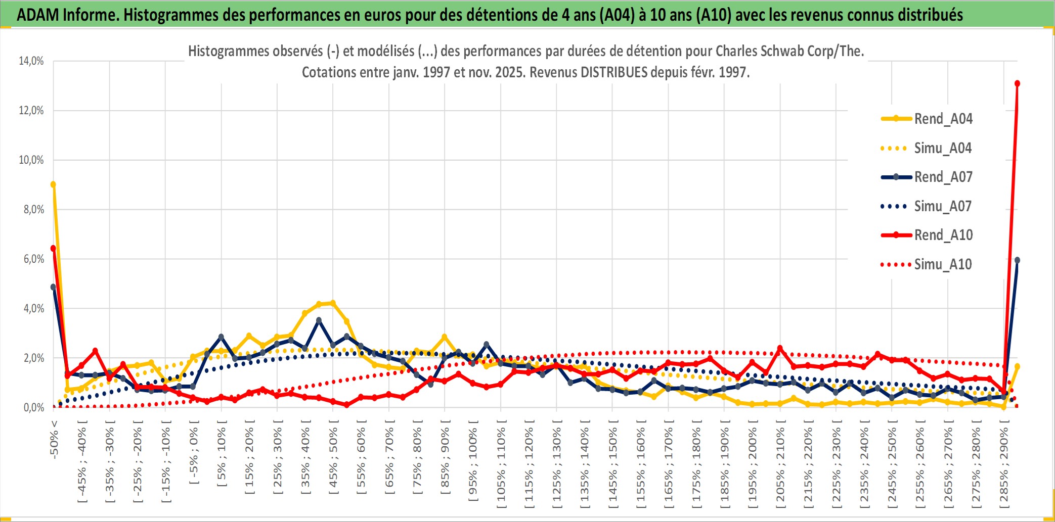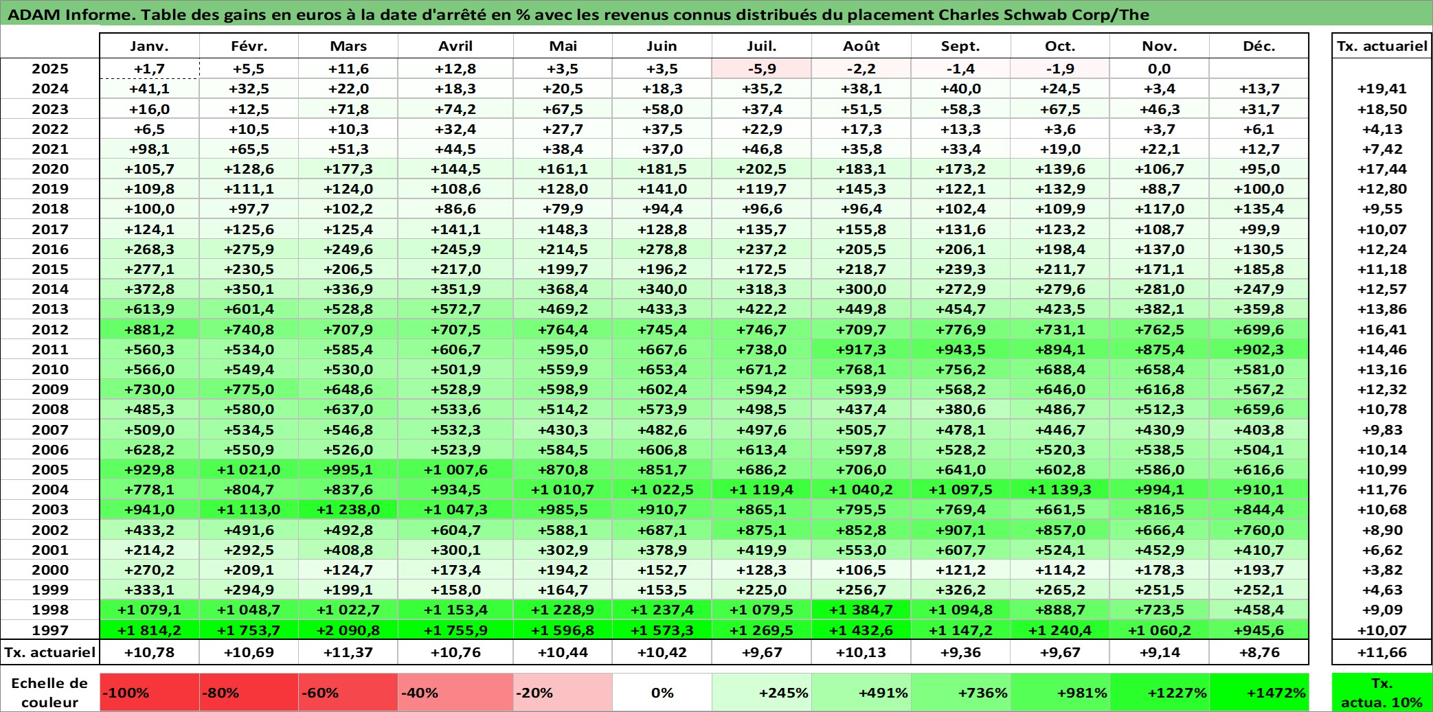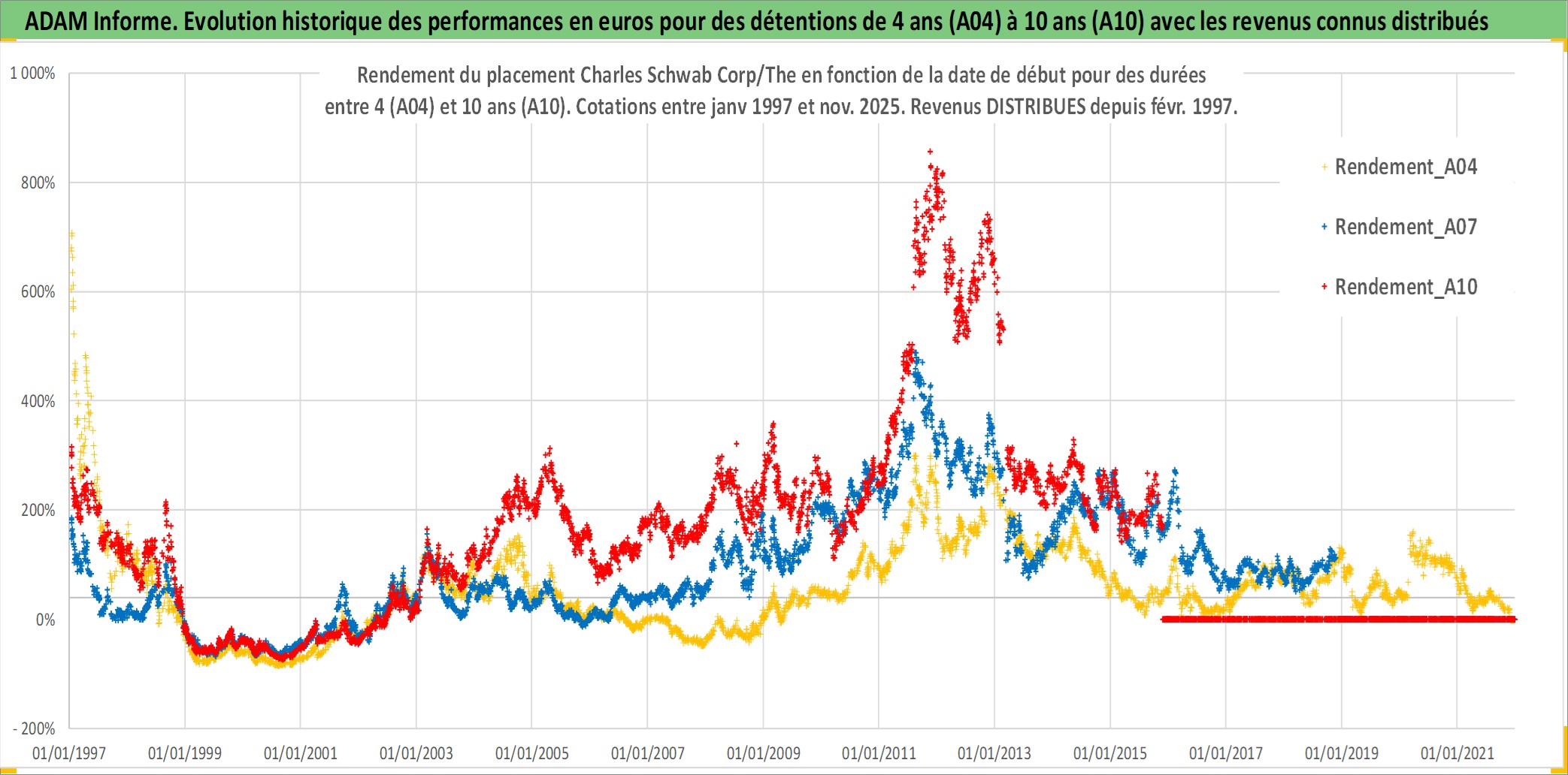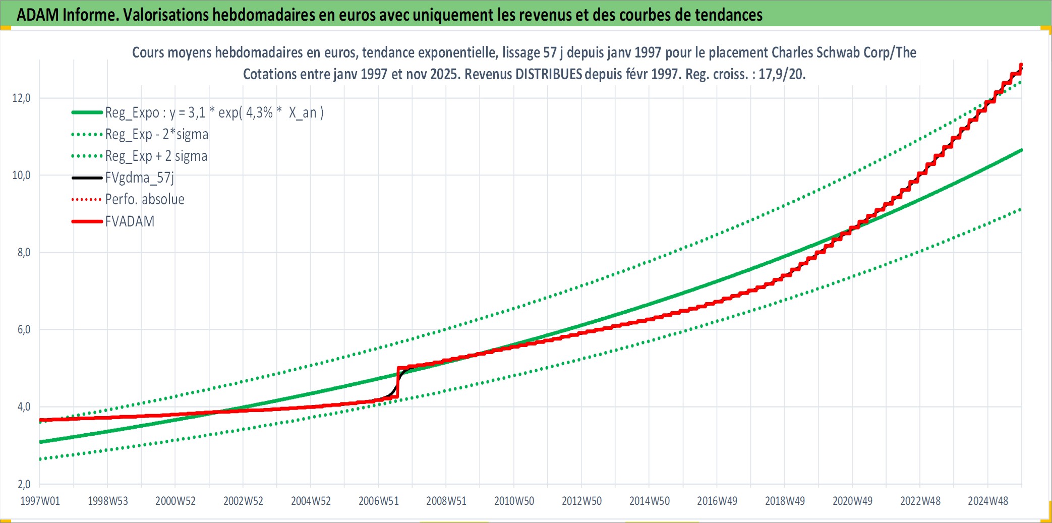 Site dédié aux investisseursPage dédiée sur site financeAnalyse des valorisations hebdomadaires de l'action Charles Schwab Corp/The. Cet actif est cote en USD. Les valorisations sont en contrevaleur EURO et couvrent les semaines 1997W01 a 2025W48. Les revenus de cet actif financier sont pris en compte depuis la semaine 1997W07. La note globale ESG de cet actif est estimee a 8.0 (apres rebasage entre 0 et 20).