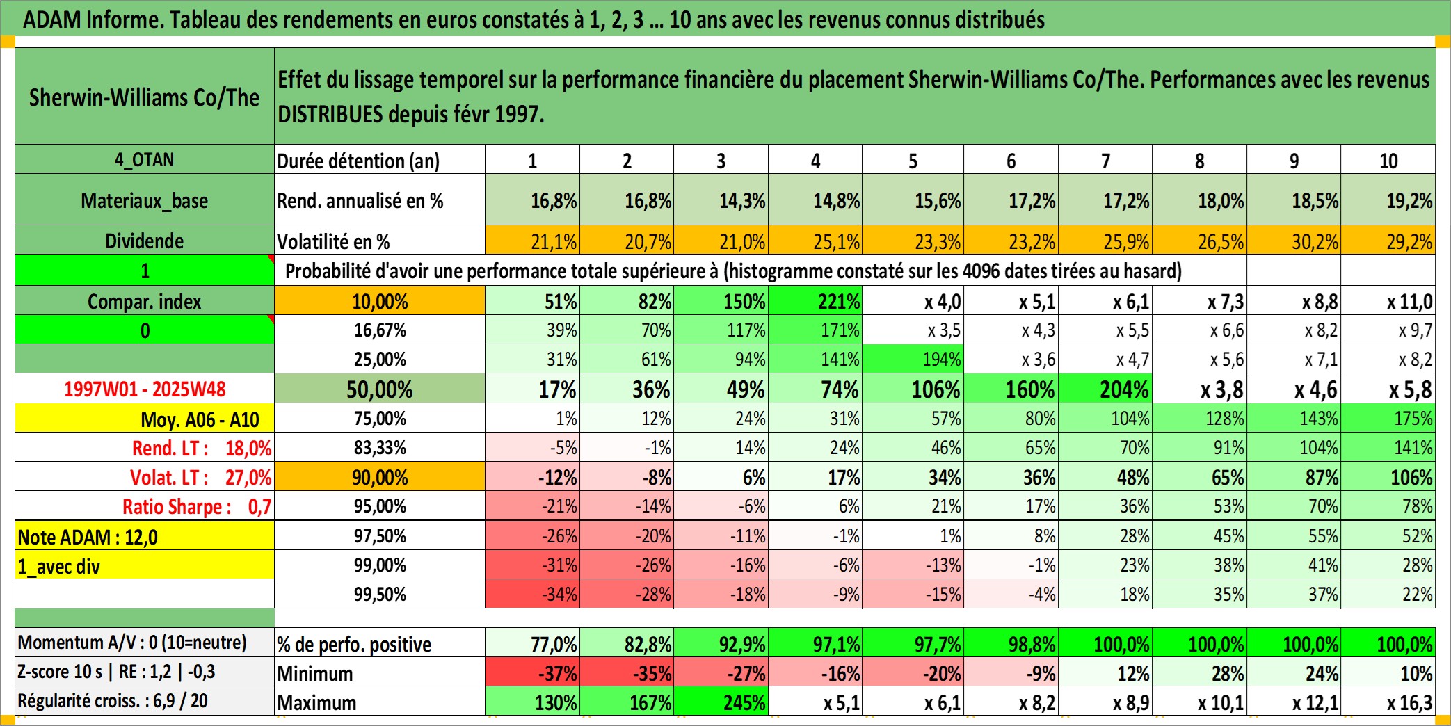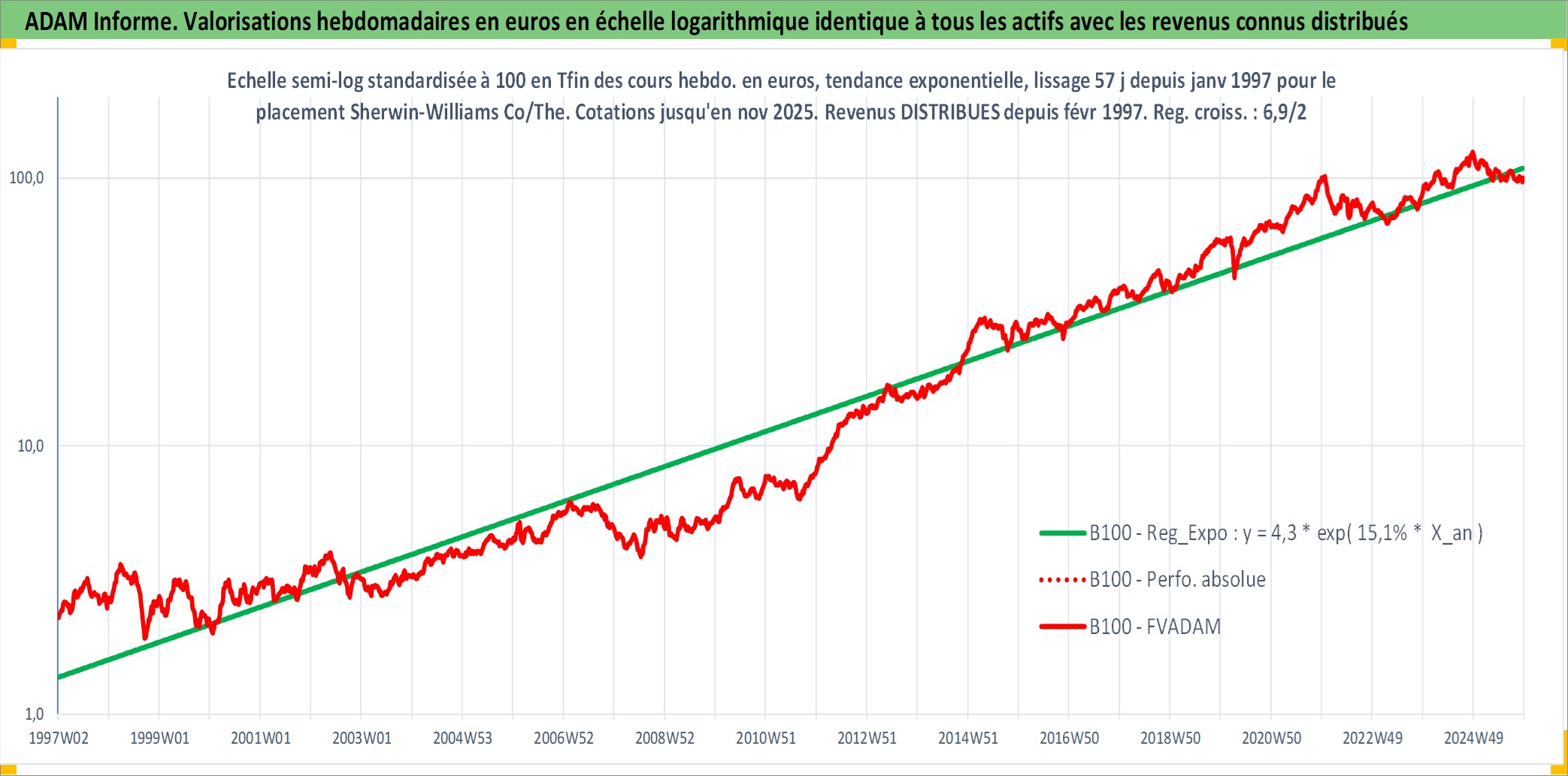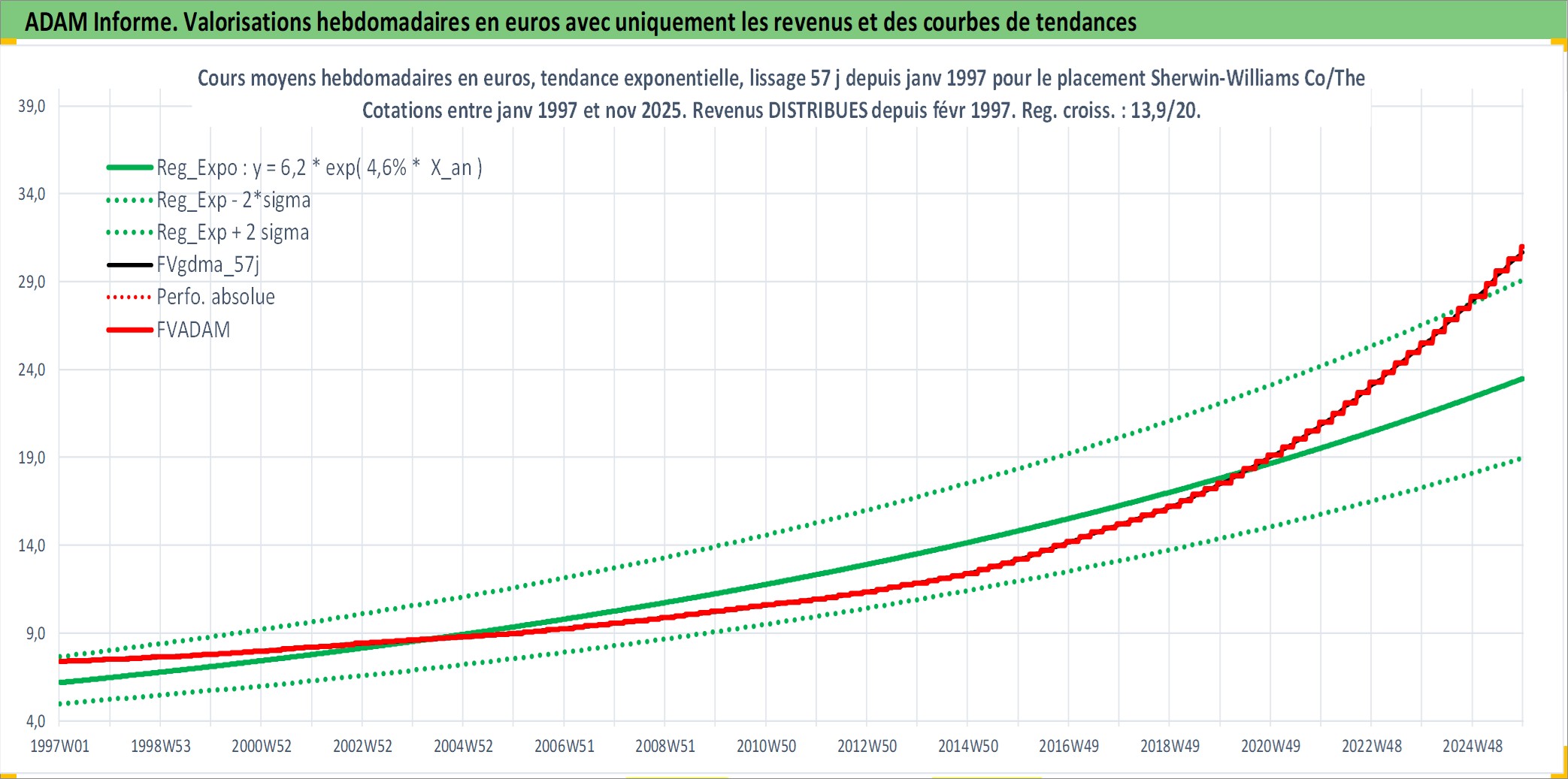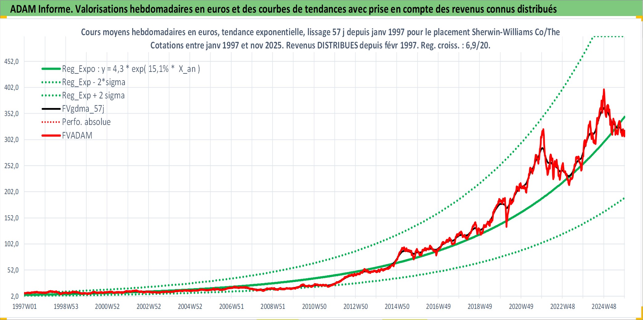 Site dédié aux investisseursPage dédiée sur site financeAnalyse des valorisations hebdomadaires de l'action Sherwin-Williams Co/The. Cet actif est cote en USD. Les valorisations sont en contrevaleur EURO et couvrent les semaines 1997W01 a 2025W48. Les revenus de cet actif financier sont pris en compte depuis la semaine 1997W09. La note globale ESG de cet actif est estimee a 6.0 (apres rebasage entre 0 et 20).