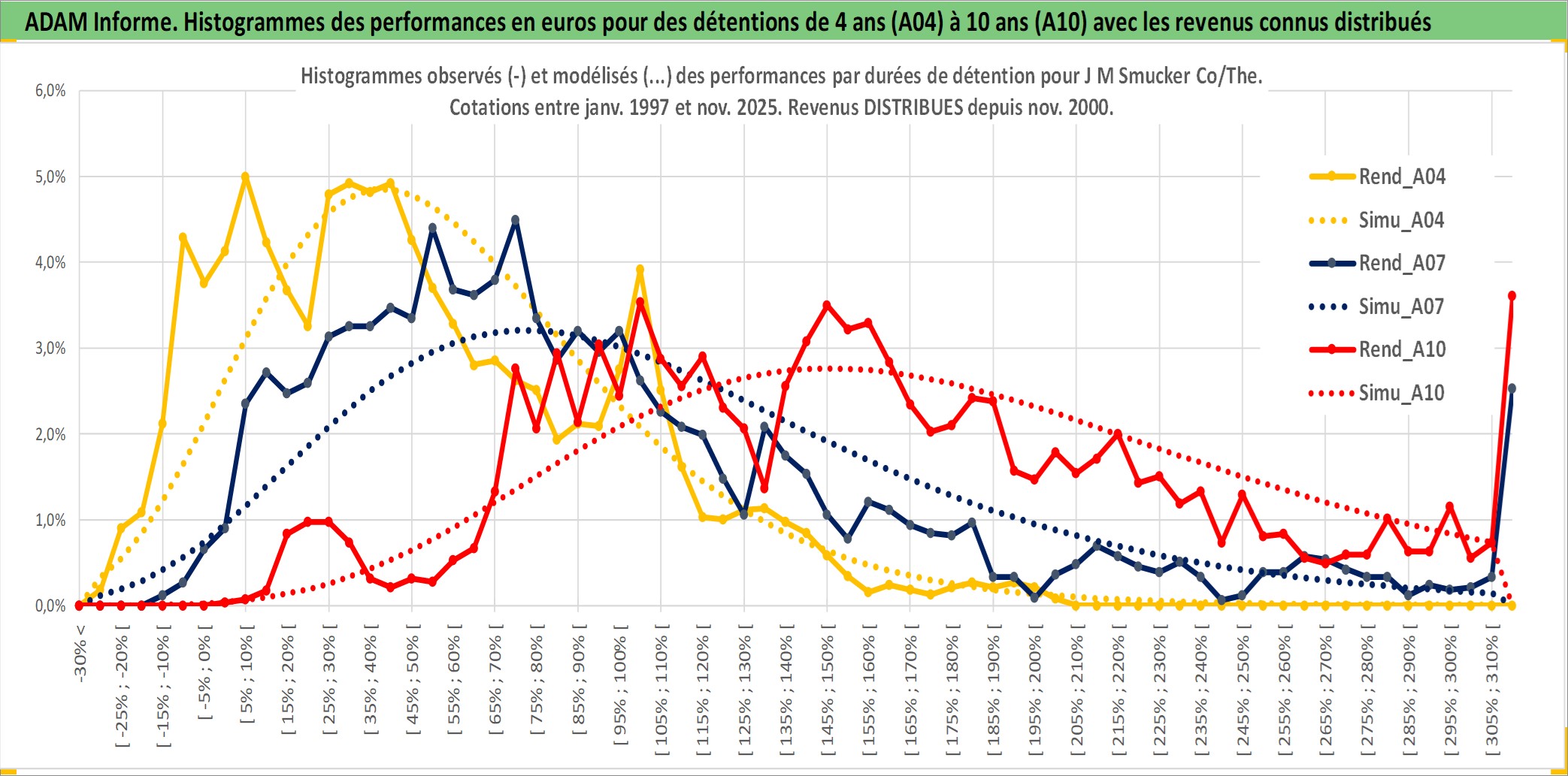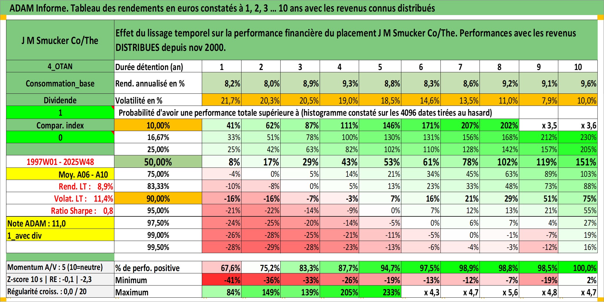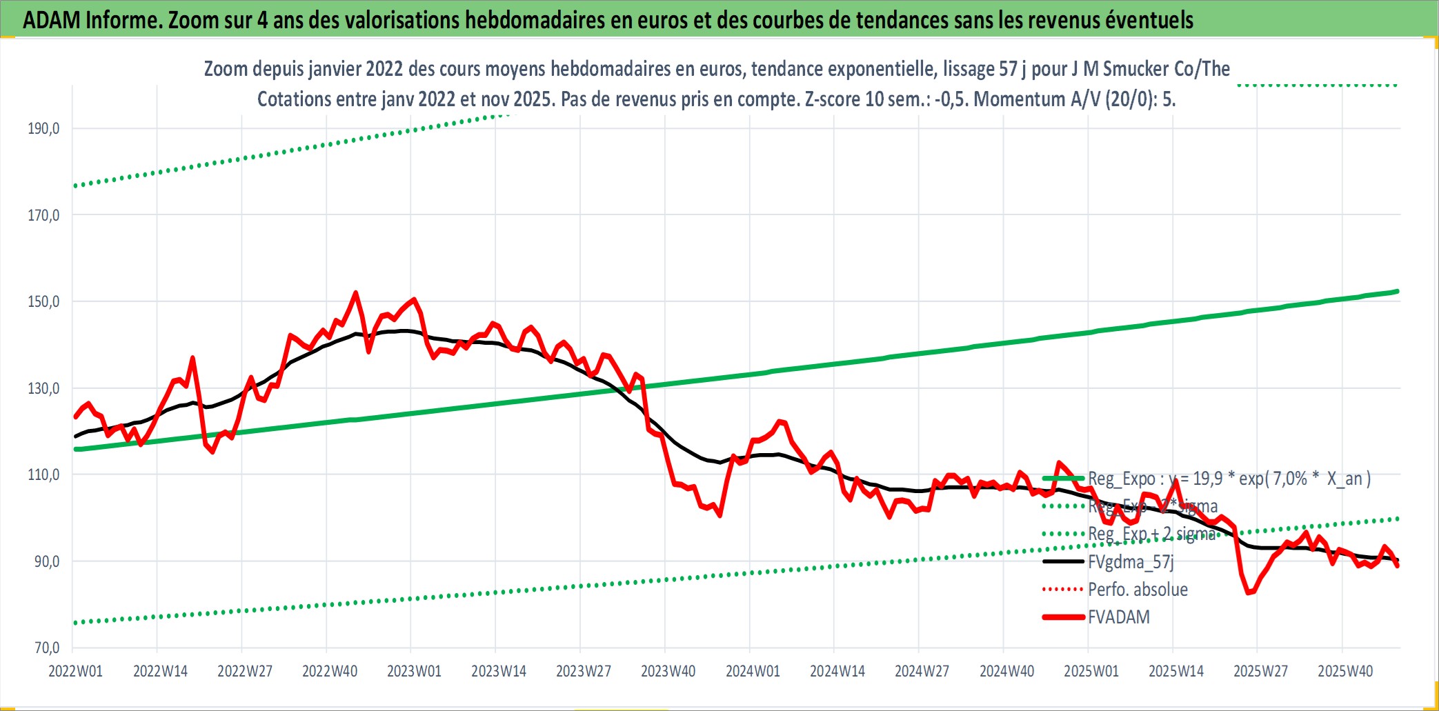 Site dédié aux investisseursPage dédiée sur site financeAnalyse des valorisations hebdomadaires de l'action J M Smucker Co/The. Cet actif est cote en USD. Les valorisations sont en contrevaleur EURO et couvrent les semaines 1997W01 a 2025W48. Les revenus de cet actif financier sont pris en compte depuis la semaine 2000W46. La note globale ESG de cet actif est estimee a 5.0 (apres rebasage entre 0 et 20).