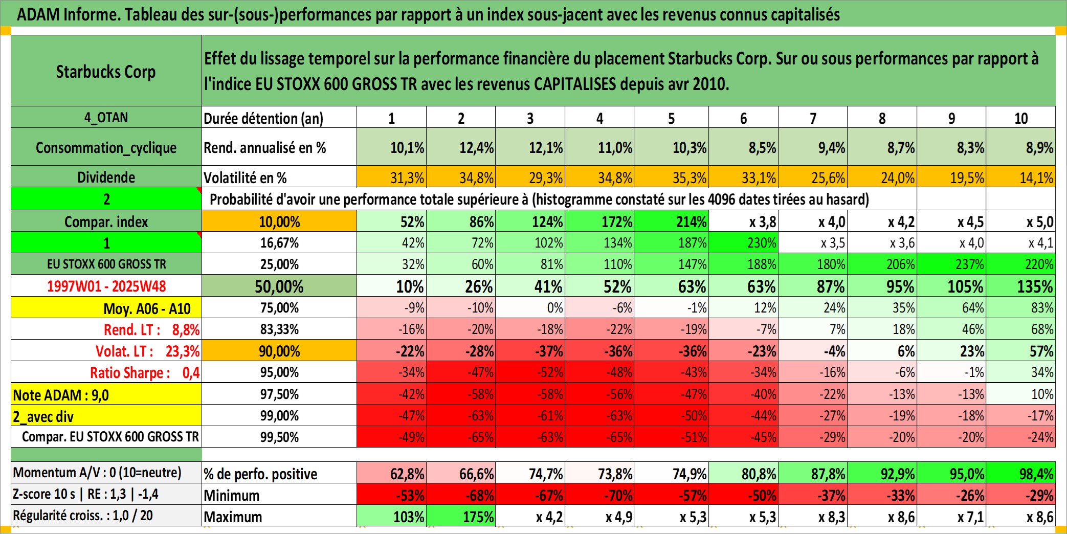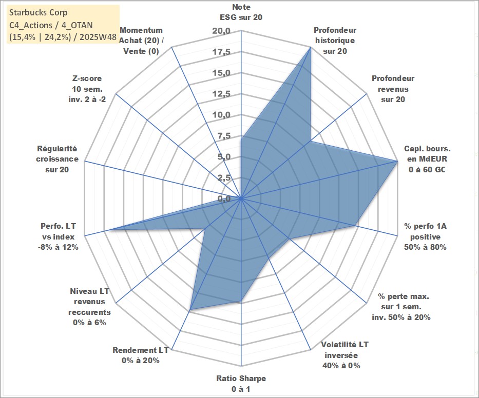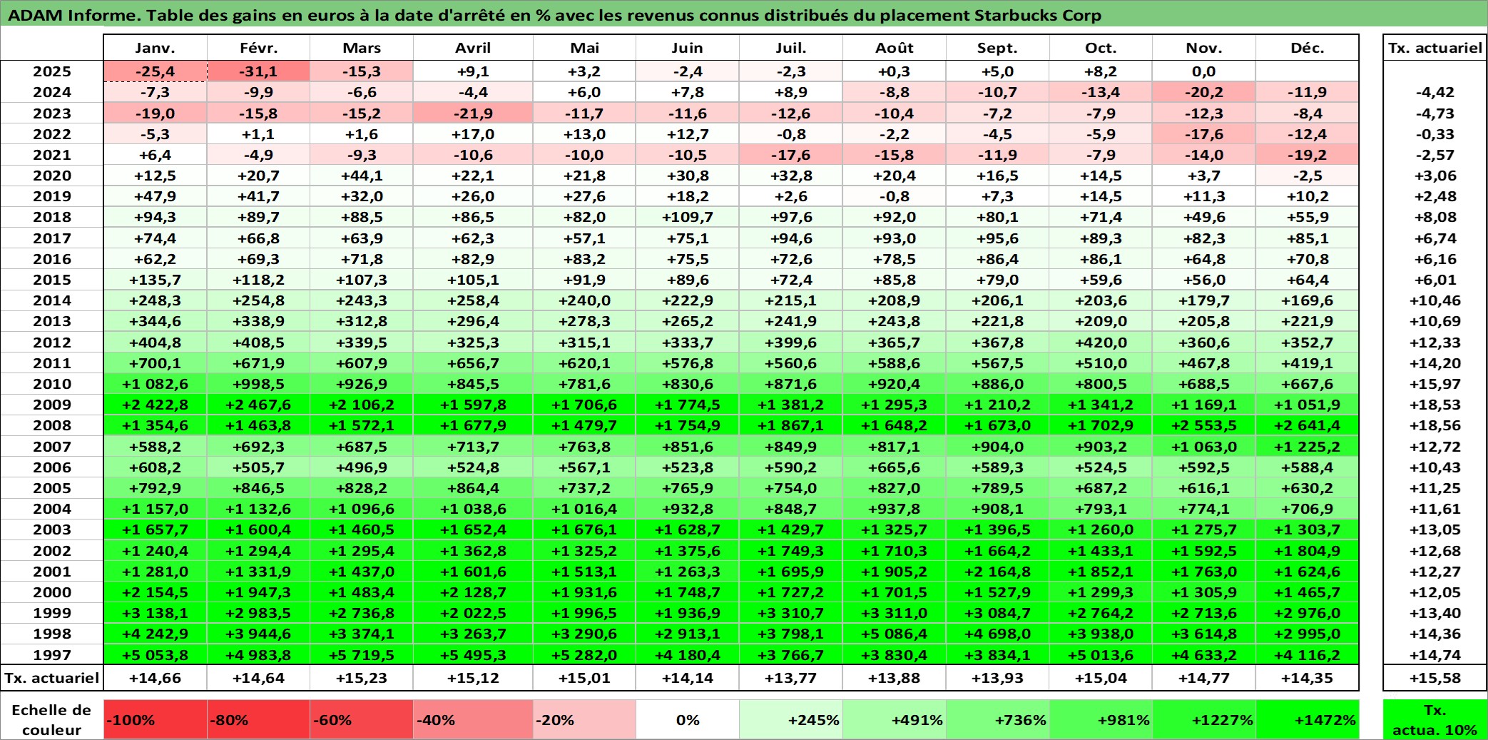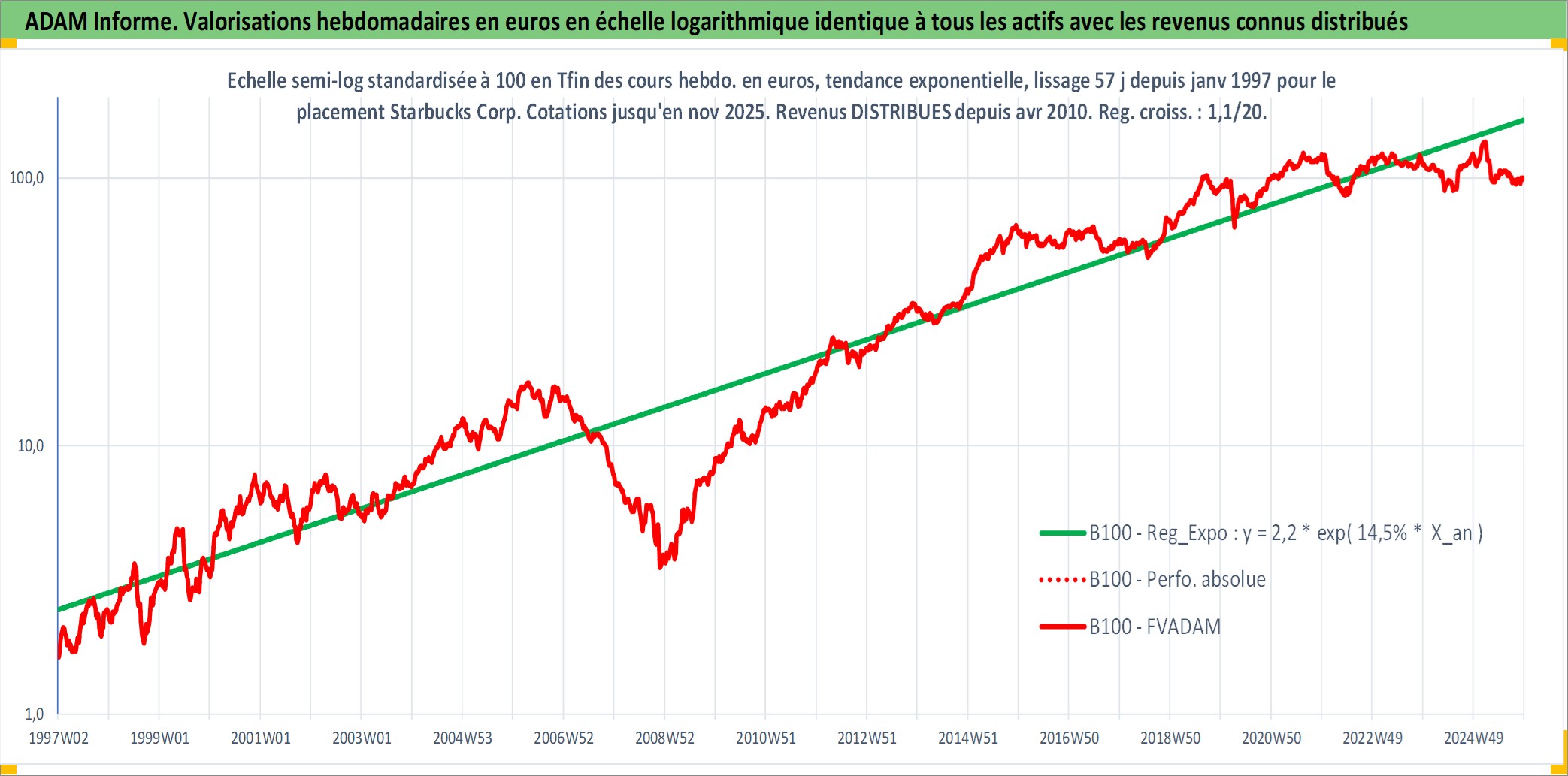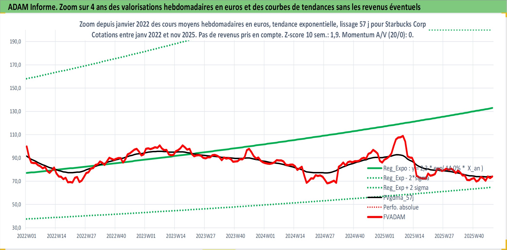 Site dédié aux investisseursPage dédiée sur site financeAnalyse des valorisations hebdomadaires de l'action Starbucks Corp. Cet actif est cote en USD. Les valorisations sont en contrevaleur EURO et couvrent les semaines 1997W01 a 2025W48. Les revenus de cet actif financier sont pris en compte depuis la semaine 2010W14. La note globale ESG de cet actif est estimee a 7.0 (apres rebasage entre 0 et 20).