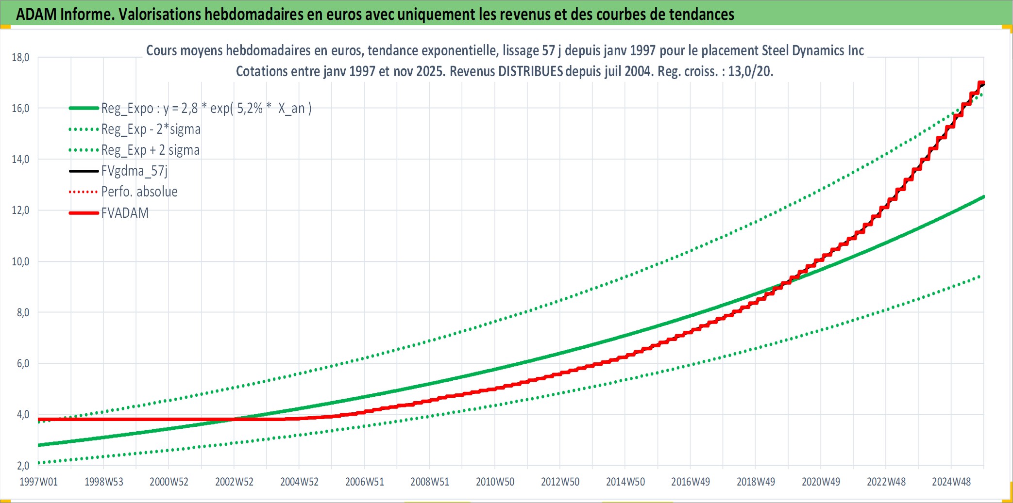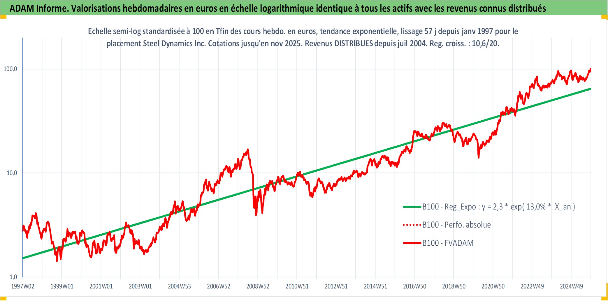 Site dédié aux investisseursPage dédiée sur site financeAnalyse des valorisations hebdomadaires de l'action Steel Dynamics Inc. Cet actif est cote en USD. Les valorisations sont en contrevaleur EURO et couvrent les semaines 1997W01 a 2025W48. Les revenus de cet actif financier sont pris en compte depuis la semaine 2004W30. La note globale ESG de cet actif est estimee a 4.0 (apres rebasage entre 0 et 20).
