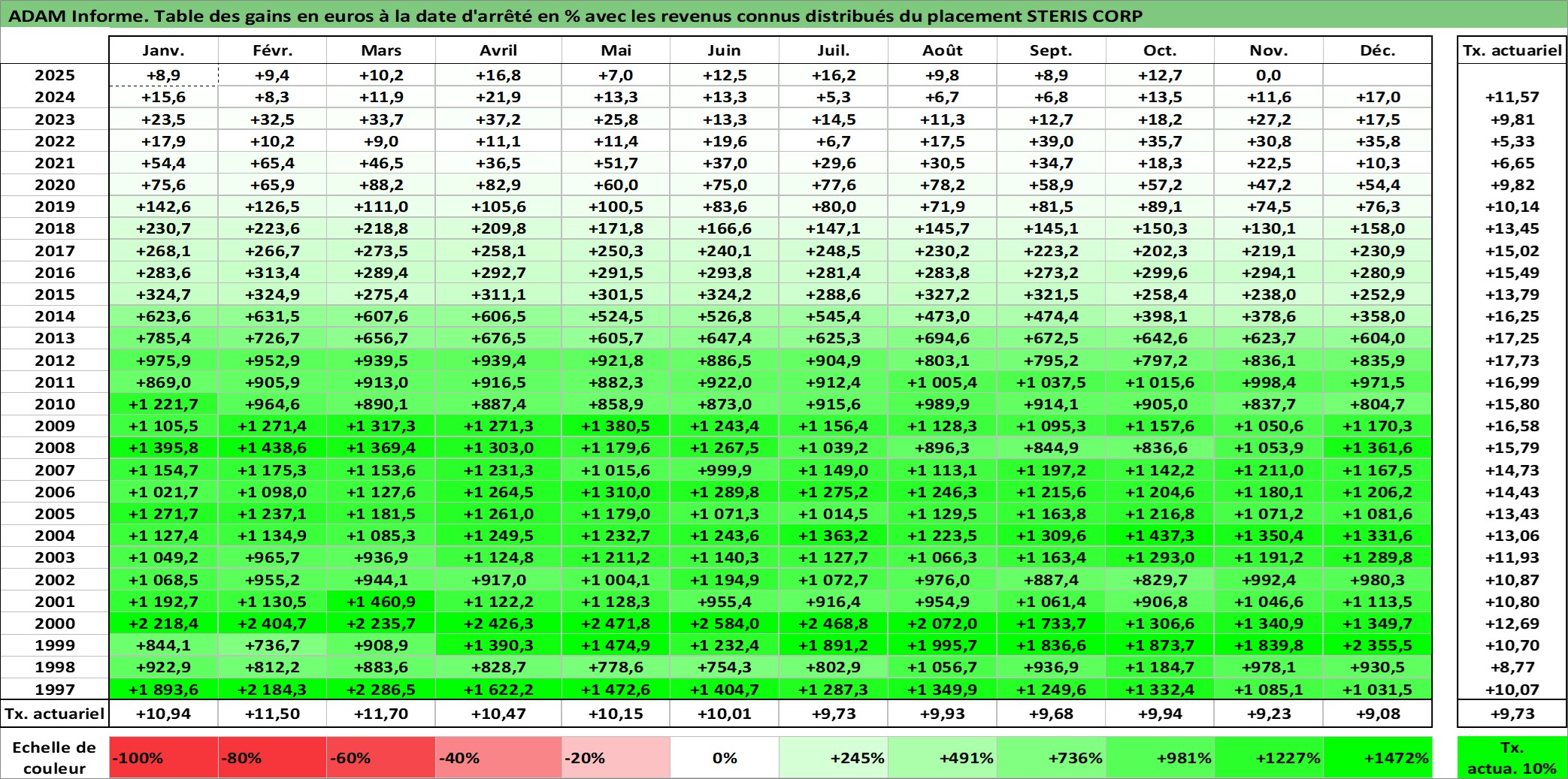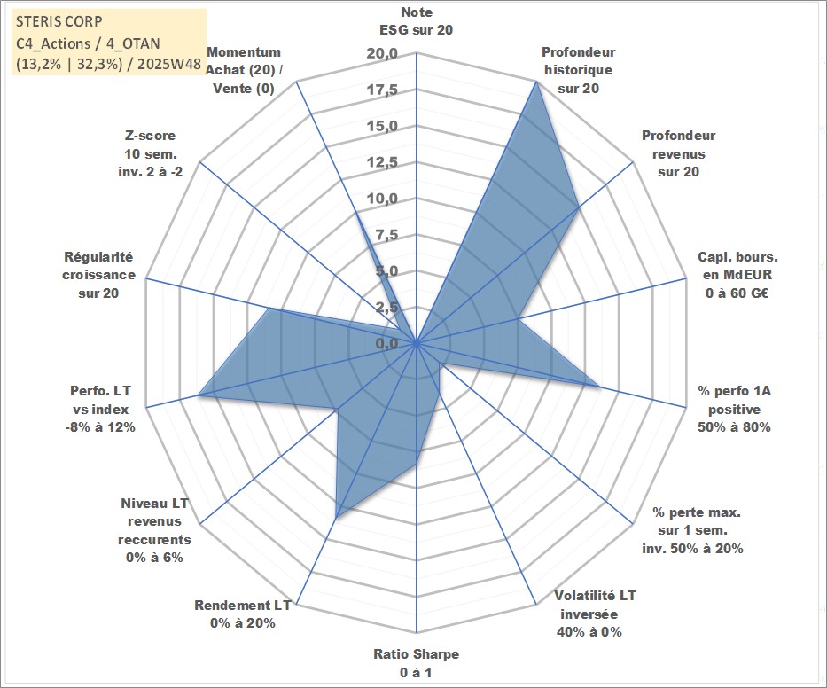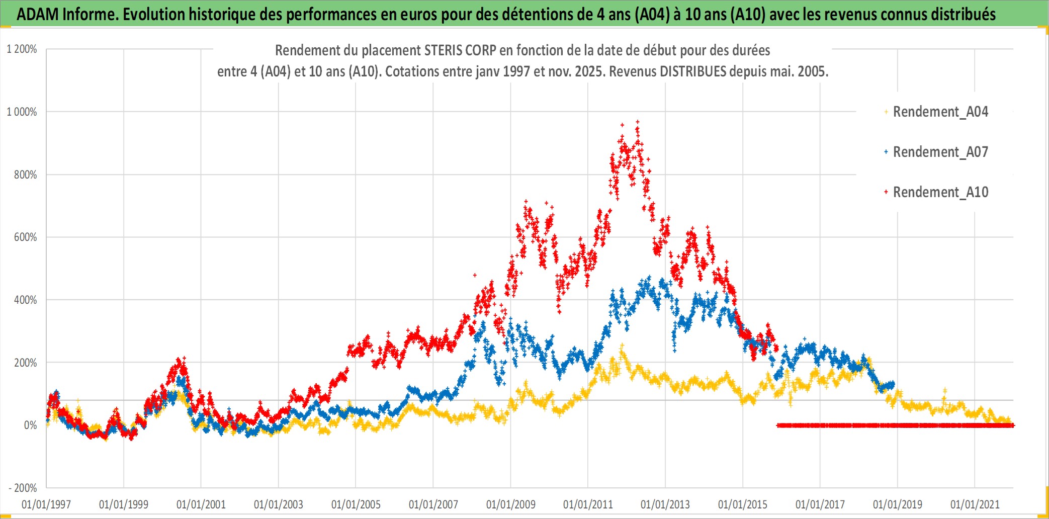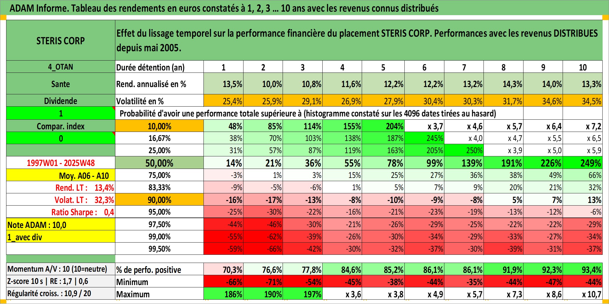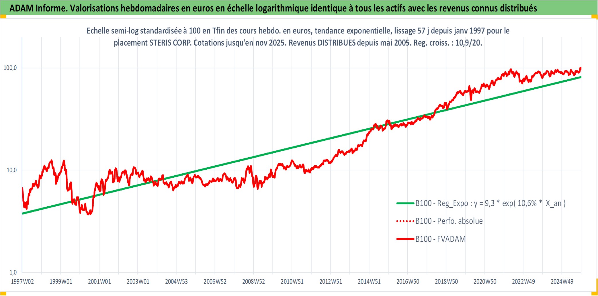 Site dédié aux investisseursPage dédiée sur site financeAnalyse des valorisations hebdomadaires de l'action STERIS CORP. Cet actif est cote en USD. Les valorisations sont en contrevaleur EURO et couvrent les semaines 1997W01 a 2025W48. Les revenus de cet actif financier sont pris en compte depuis la semaine 2005W21. La note ESG de cet actif n'est pas connue.