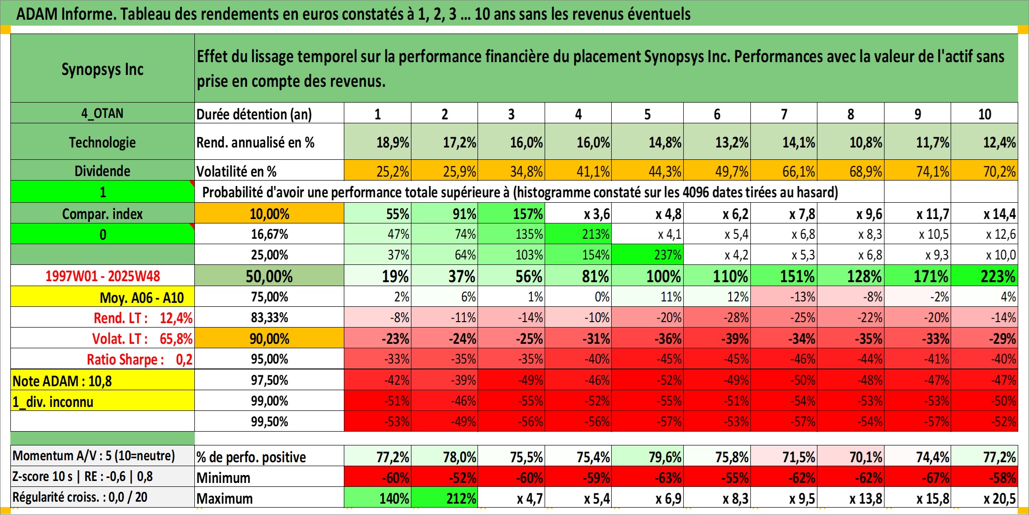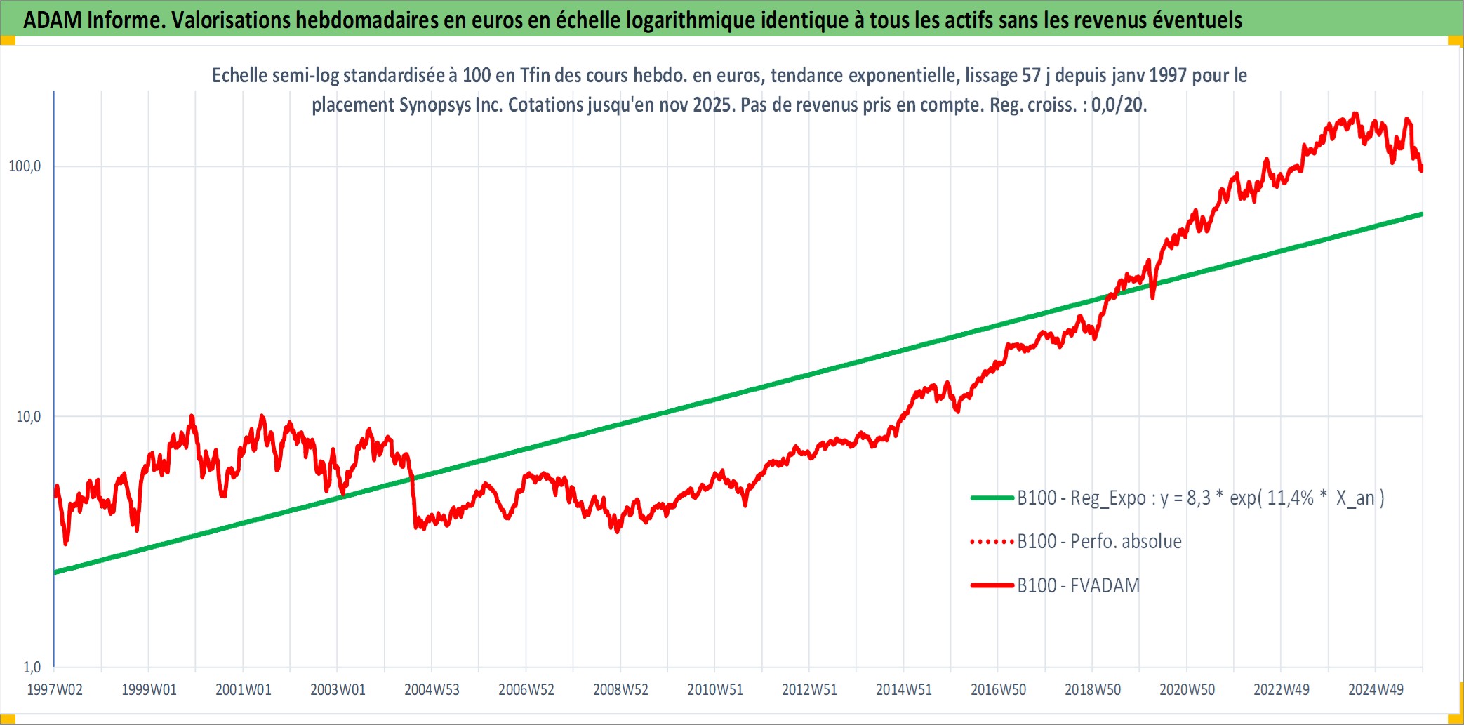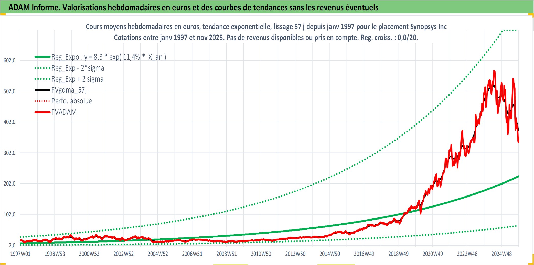 Site dédié aux investisseursPage dédiée sur site financeAnalyse des valorisations hebdomadaires de l'action Synopsys Inc. Cet actif est cote en USD. Les valorisations sont en contrevaleur EURO et couvrent les semaines 1997W01 a 2025W48. Les revenus de cet actif financier ne sont pas connus car non existants ou non disponibles sur le site Yahoo Finance. La note globale ESG de cet actif est estimee a 15.0 (apres rebasage entre 0 et 20).