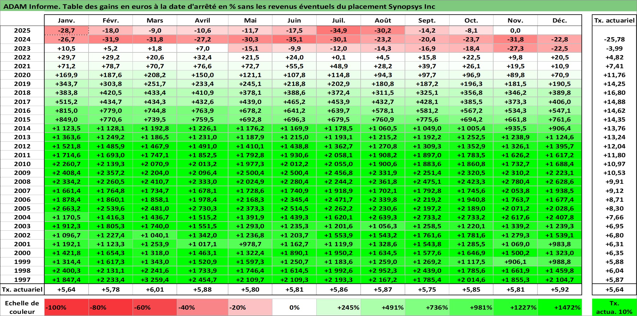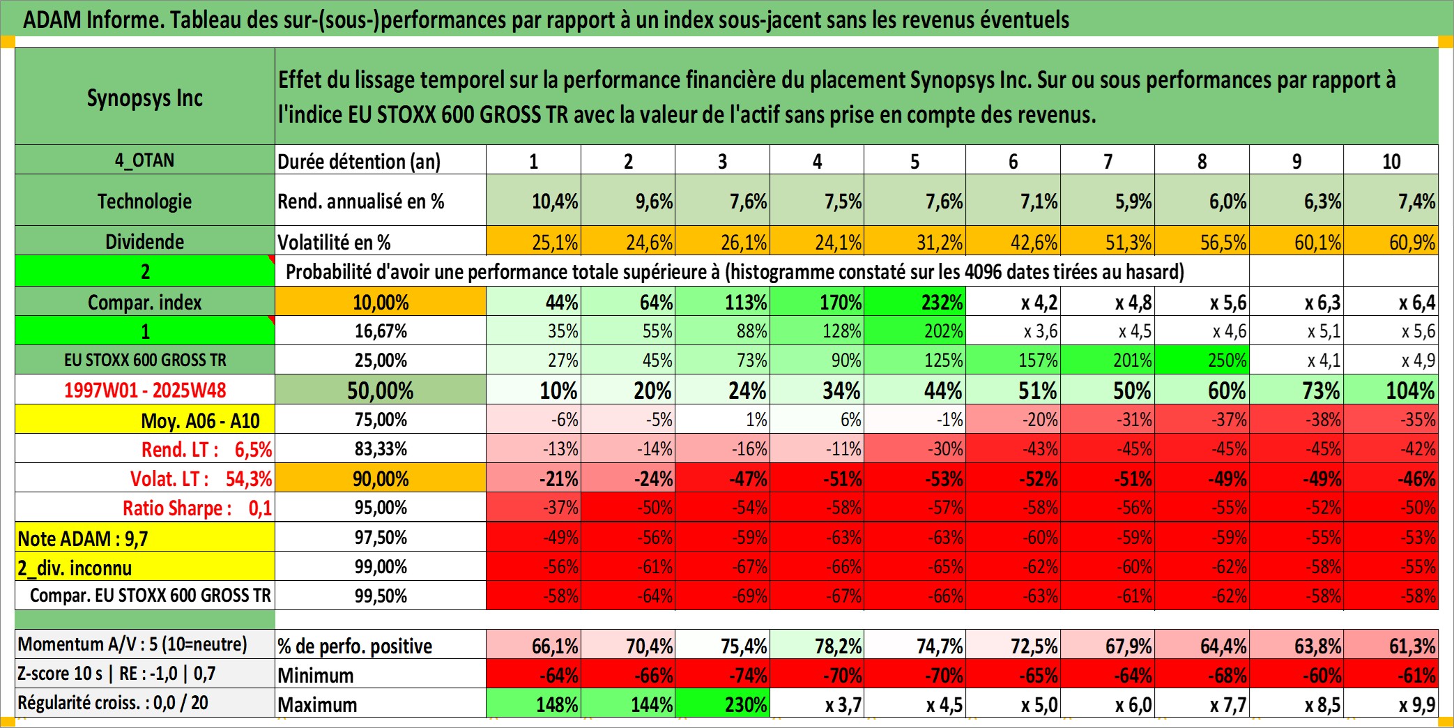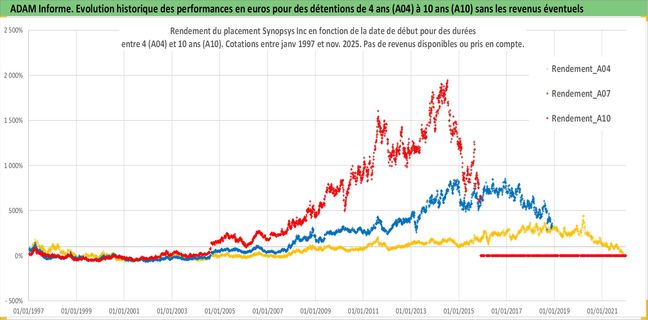 Site dédié aux investisseursPage dédiée sur site financeAnalyse des valorisations hebdomadaires de l'action Synopsys Inc. Cet actif est cote en USD. Les valorisations sont en contrevaleur EURO et couvrent les semaines 1997W01 a 2025W48. Les revenus de cet actif financier ne sont pas connus car non existants ou non disponibles sur le site Yahoo Finance. La note globale ESG de cet actif est estimee a 15.0 (apres rebasage entre 0 et 20).