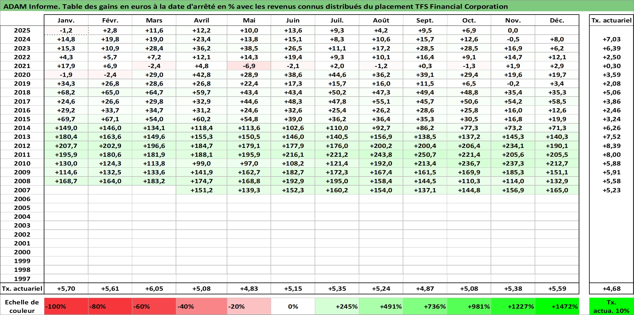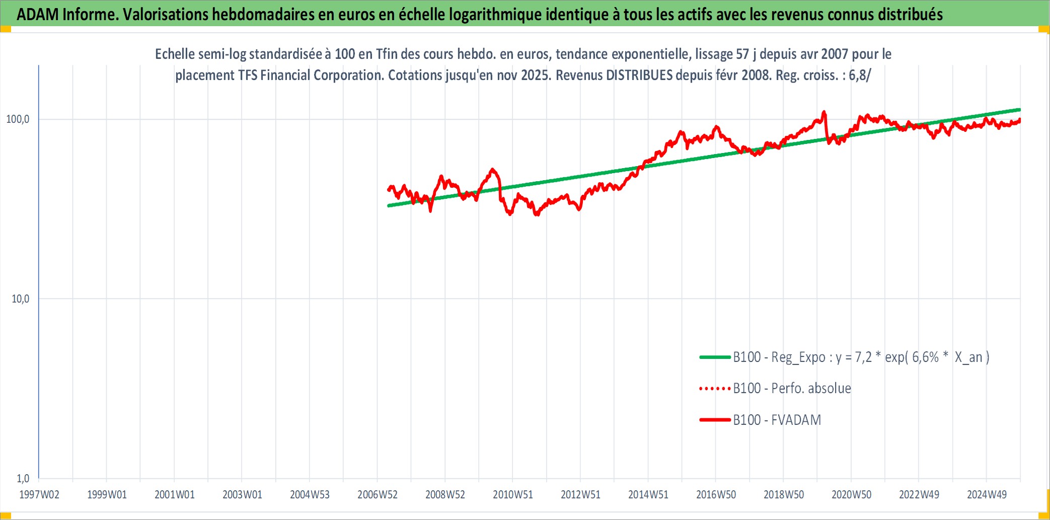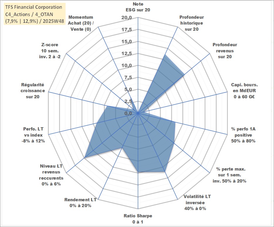Site dédié aux investisseursPage dédiée sur site financeAnalyse des valorisations hebdomadaires de l'action TFS Financial Corporation. Cet actif est cote en USD. Les valorisations sont en contrevaleur EURO et couvrent les semaines 2007W17 a 2025W48. Les revenus de cet actif financier sont pris en compte depuis la semaine 2008W08. La note ESG de cet actif n'est pas connue.