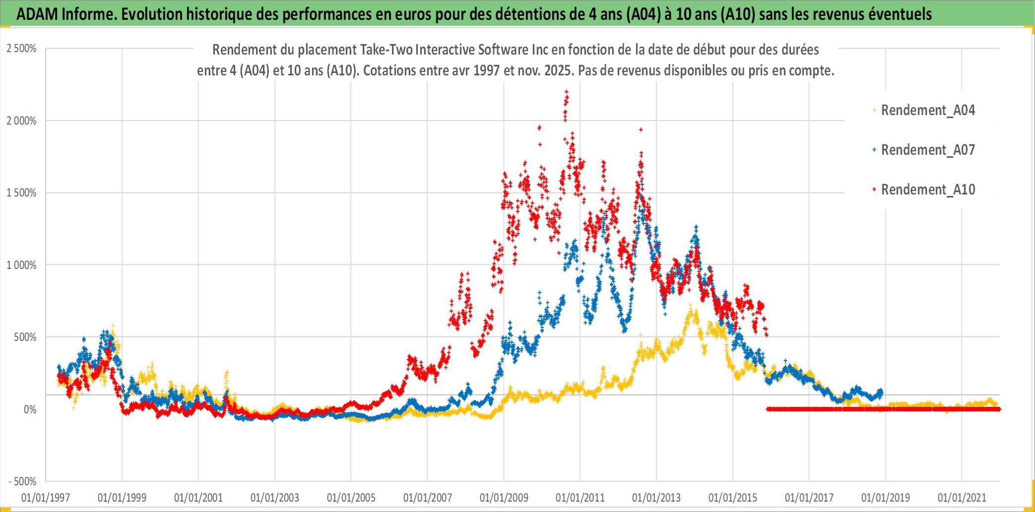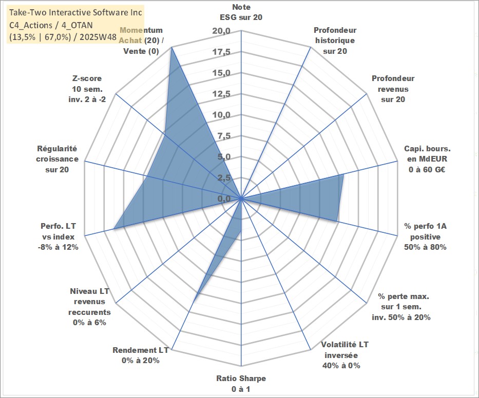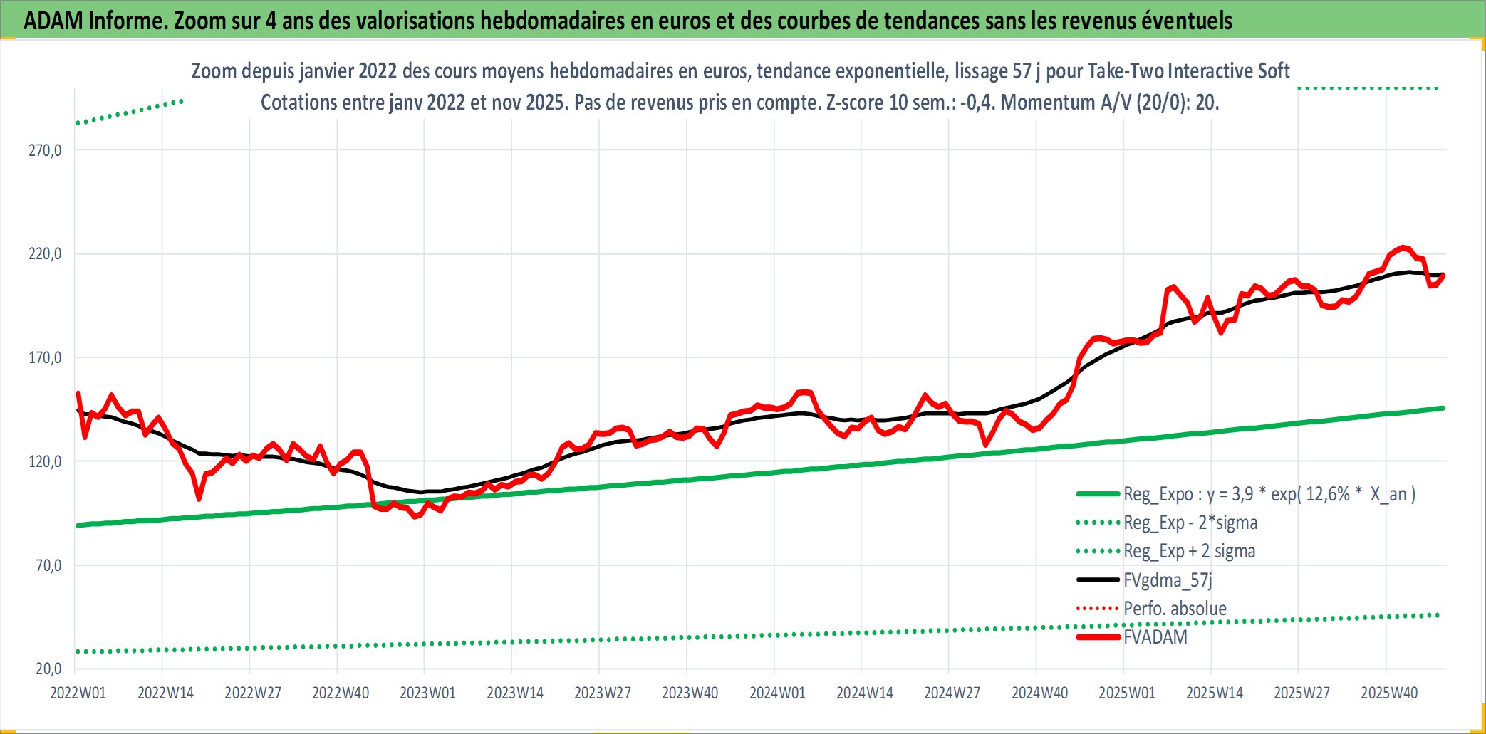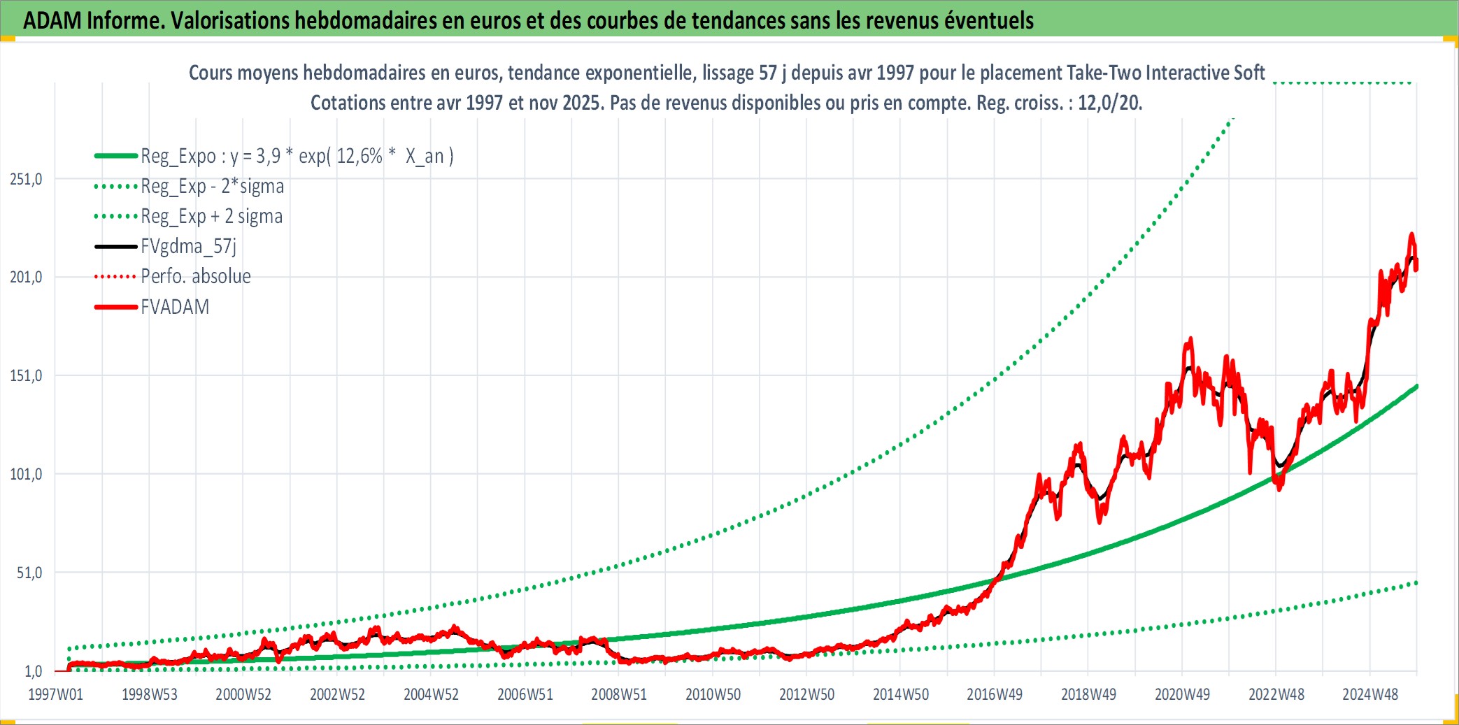 Site dédié aux investisseursPage dédiée sur site financeAnalyse des valorisations hebdomadaires de l'action Take-Two Interactive Software Inc. Cet actif est cote en USD. Les valorisations sont en contrevaleur EURO et couvrent les semaines 1997W16 a 2025W48. Les revenus de cet actif financier ne sont pas connus car non existants ou non disponibles sur le site Yahoo Finance. La note ESG de cet actif n'est pas connue.