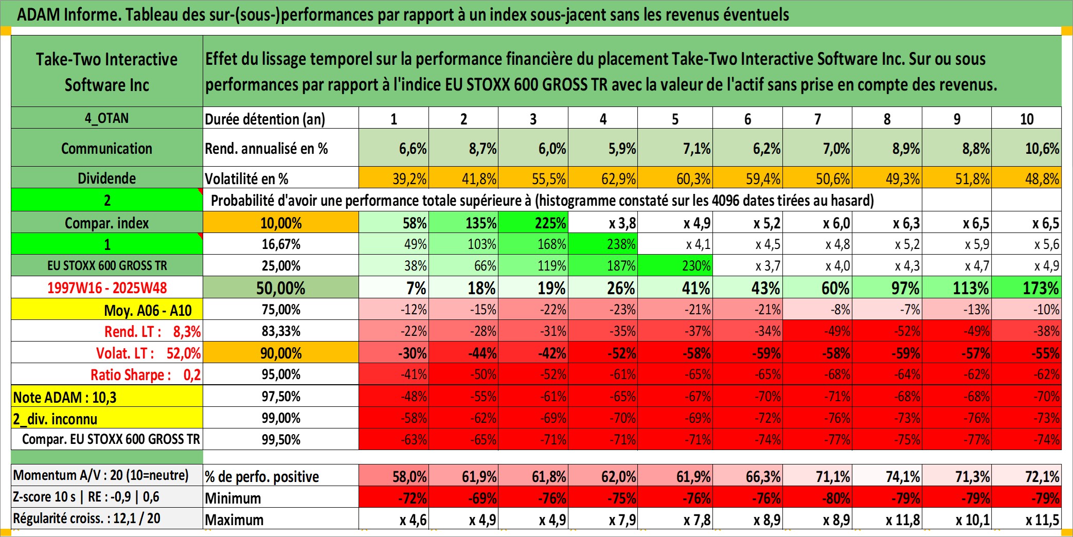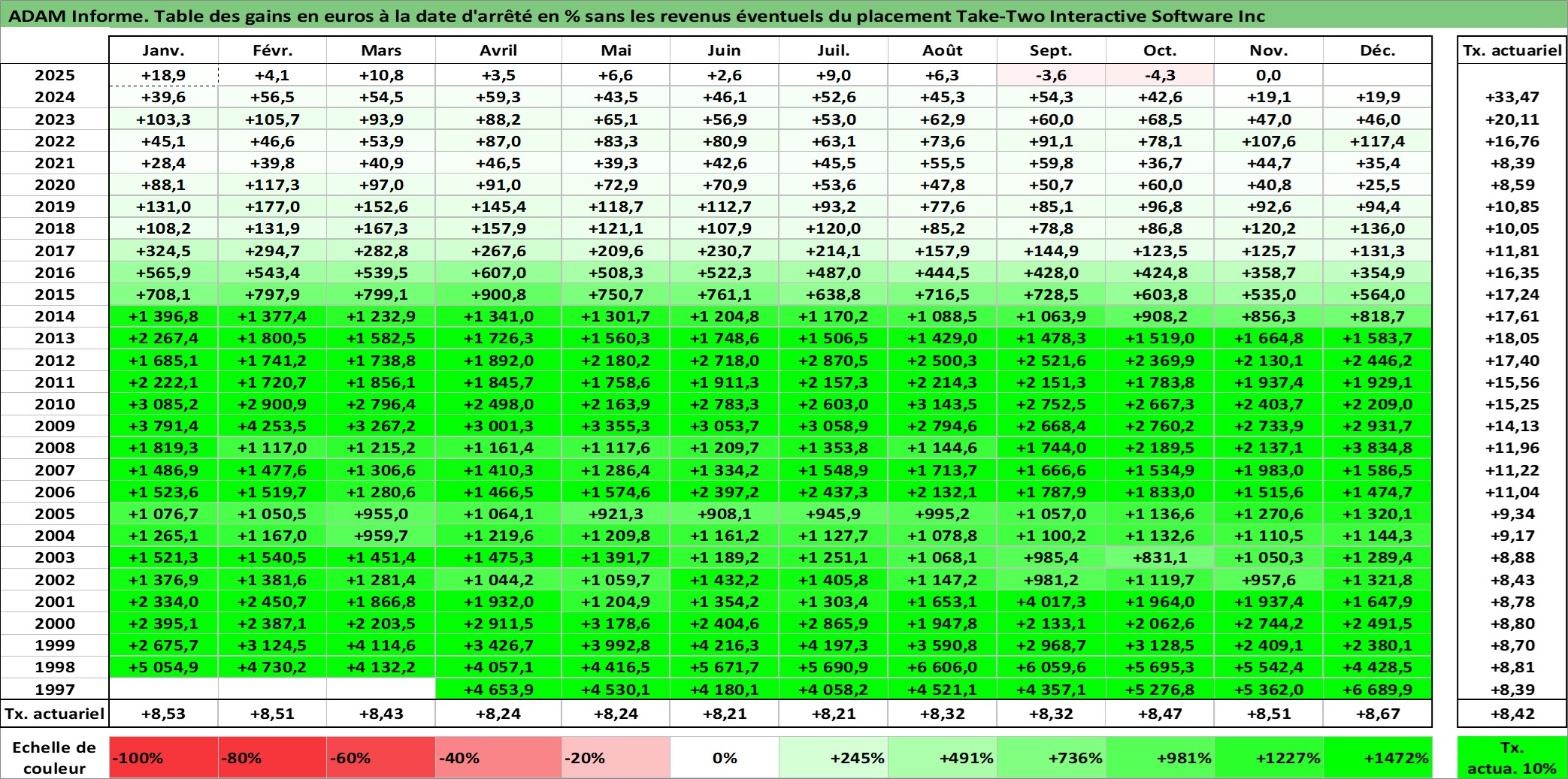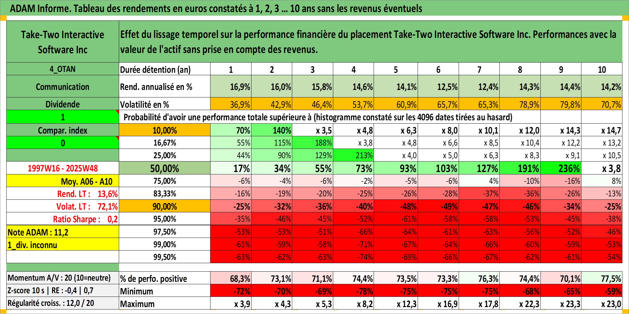 Site dédié aux investisseursPage dédiée sur site financeAnalyse des valorisations hebdomadaires de l'action Take-Two Interactive Software Inc. Cet actif est cote en USD. Les valorisations sont en contrevaleur EURO et couvrent les semaines 1997W16 a 2025W48. Les revenus de cet actif financier ne sont pas connus car non existants ou non disponibles sur le site Yahoo Finance. La note ESG de cet actif n'est pas connue.