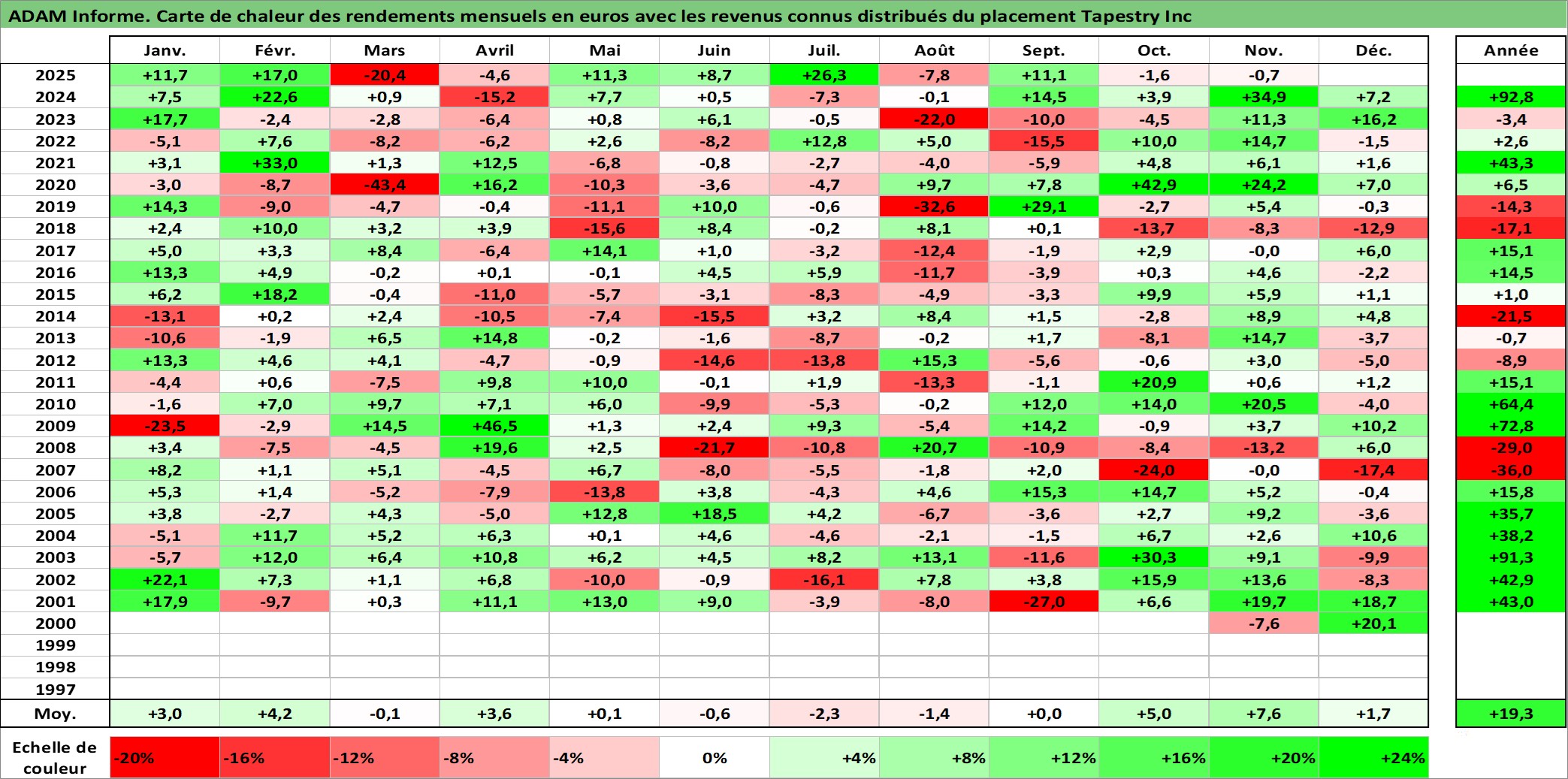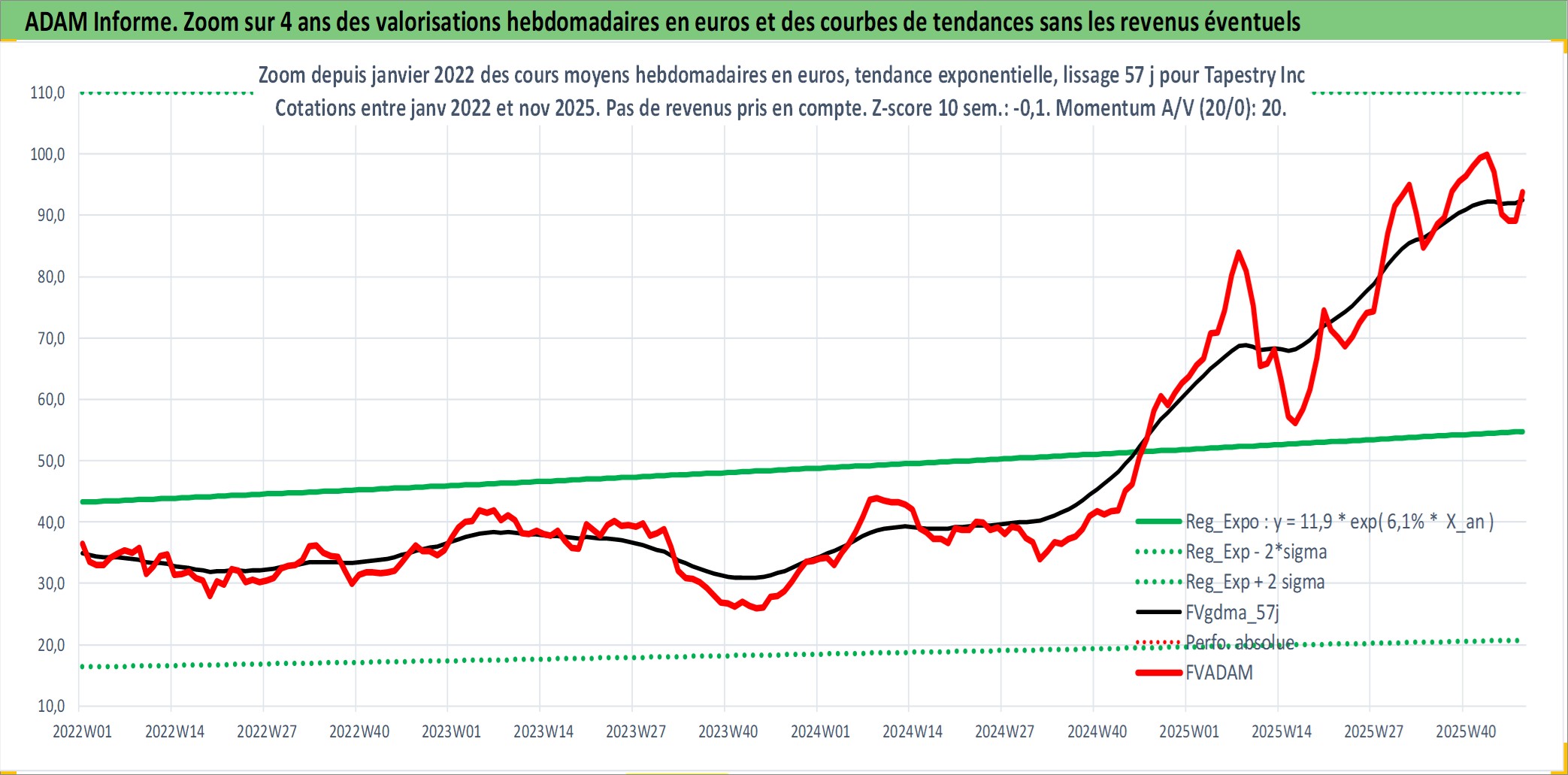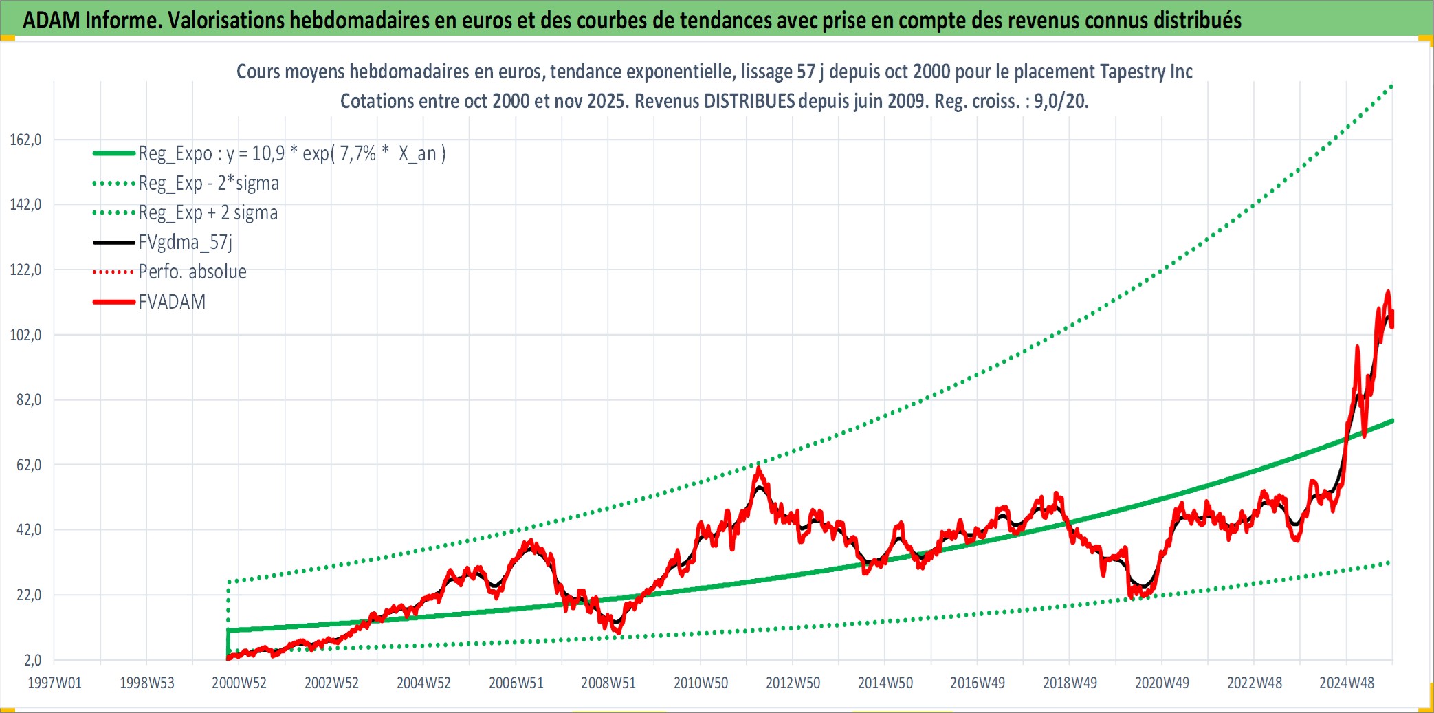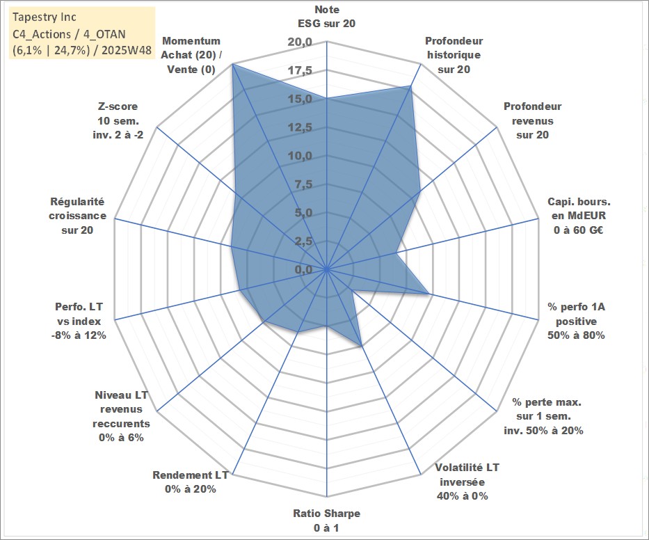 Site dédié aux investisseursPage dédiée sur site financeAnalyse des valorisations hebdomadaires de l'action Tapestry Inc. Cet actif est cote en USD. Les valorisations sont en contrevaleur EURO et couvrent les semaines 2000W40 a 2025W48. Les revenus de cet actif financier sont pris en compte depuis la semaine 2009W23. La note globale ESG de cet actif est estimee a 15.0 (apres rebasage entre 0 et 20).