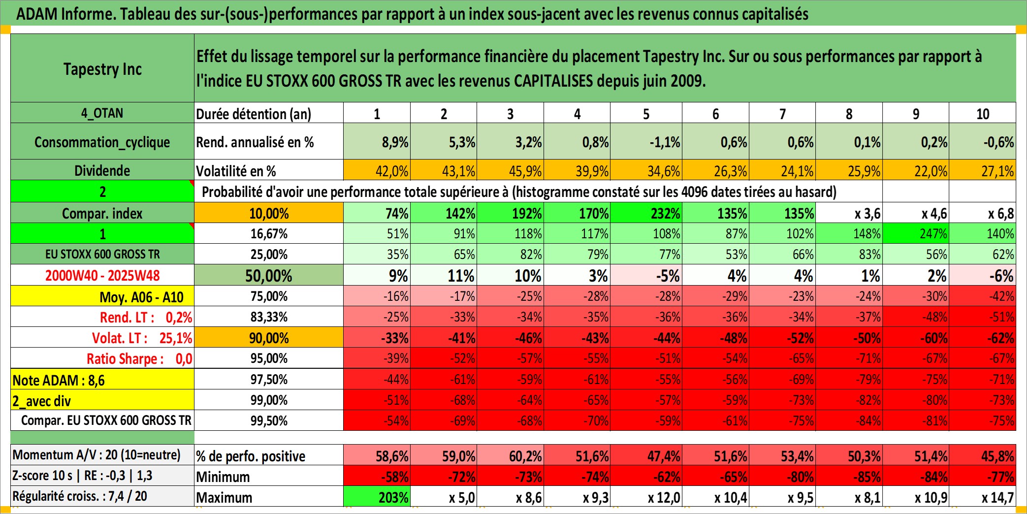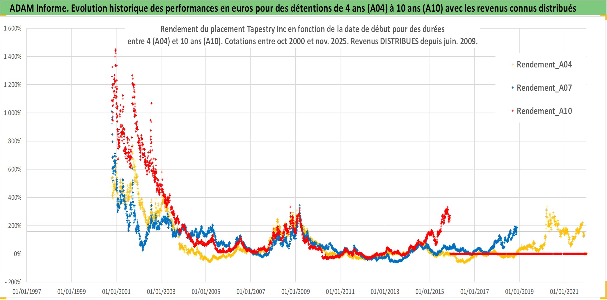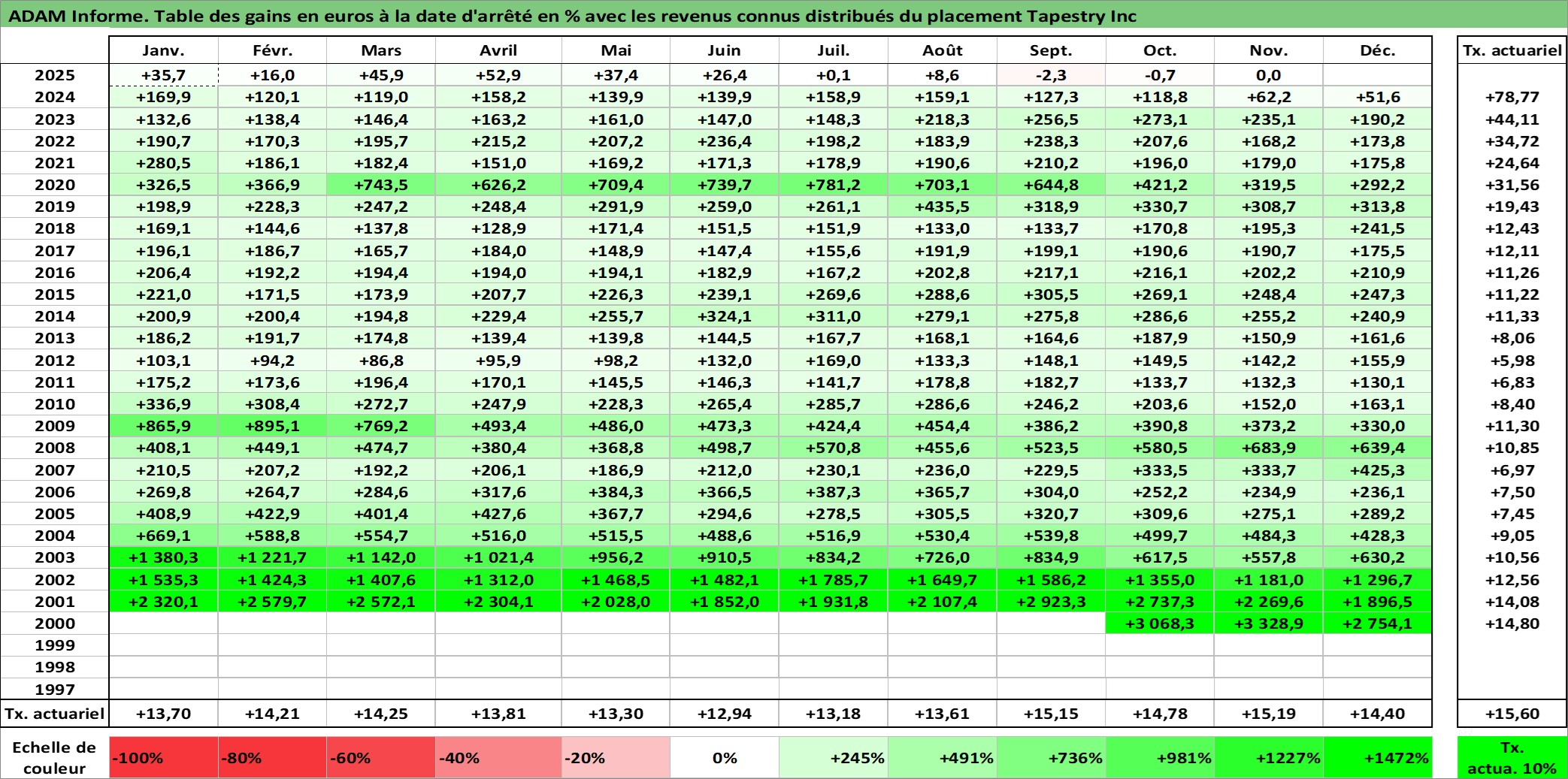 Site dédié aux investisseursPage dédiée sur site financeAnalyse des valorisations hebdomadaires de l'action Tapestry Inc. Cet actif est cote en USD. Les valorisations sont en contrevaleur EURO et couvrent les semaines 2000W40 a 2025W48. Les revenus de cet actif financier sont pris en compte depuis la semaine 2009W23. La note globale ESG de cet actif est estimee a 15.0 (apres rebasage entre 0 et 20).